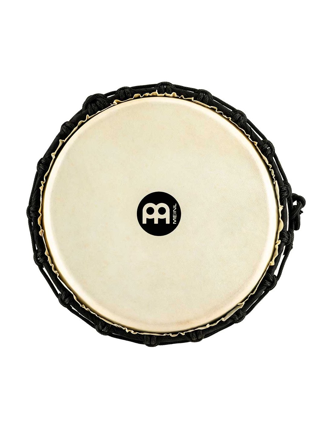 'Djembe di legno da 10''''. Questi Djembes sono ricavati da un solido pezzo di legno di mogano coltivato in piantagione, e sono intagliati a mano con un motivo di increspatura orizzontale che suggerisce un fiume che scorre. Questo rende anche il djembe facile da fissare tra le ginocchia. La testa del tamburo in pelle di capra selezionata a mano è accordata con il tradizionale sistema di corde del Mali.