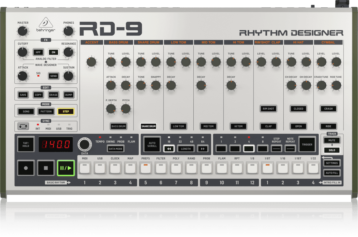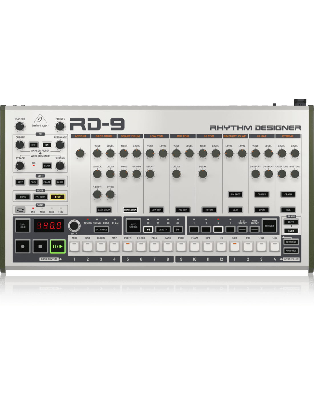 BEHRINGER RD-9 è una Drum Machine analogica/digitale con 11 voci, sequencer a 64 step, wave designer e filtro dual mode. Le caratteristiche tecniche includono 11 suoni di batteria analogica, sequencer con modalità poly-meter, step-repeat, note-repeat, trigger, track-mute e track-solo, bus FX integrato con wave designer e doppio filtro analogico, memoria interna per memorizzare fino a 16 brani e 256 pattern ritmici. Presenta ingresso/uscita Sync, 3 uscite Trigger, uscita cuffie, implementazione MIDI/USB, uscite di controllo.