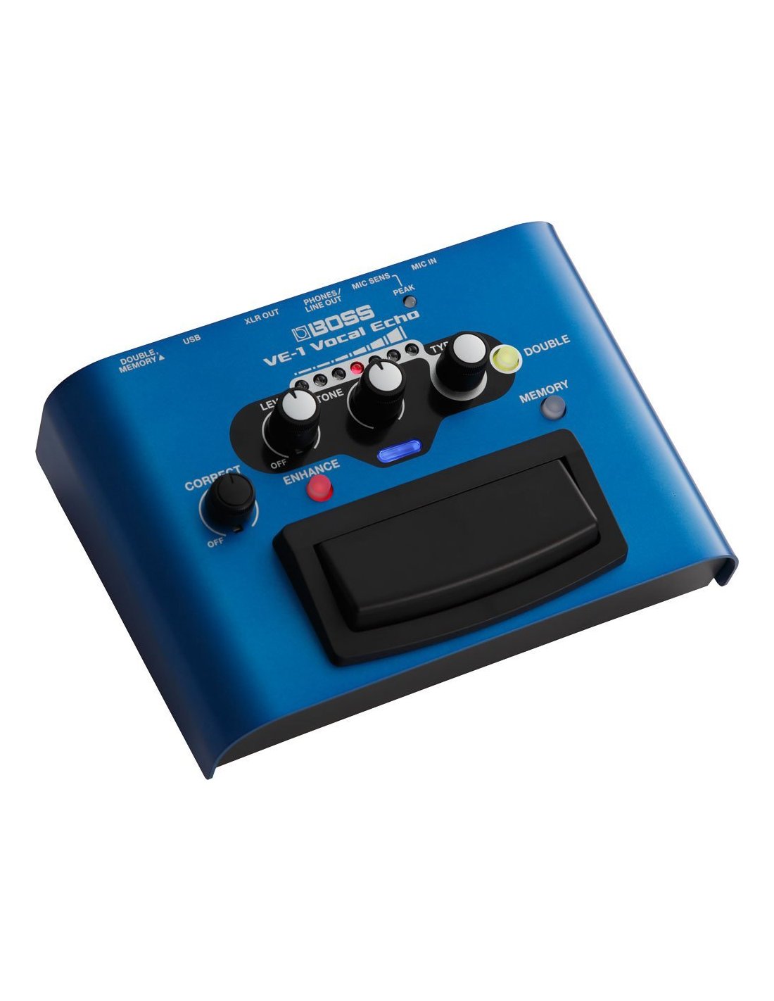 BOSS VE-1 è un effetto Echo e multieffetto per voce alimentabile a batterie con implementazione USB per la registrazione su DAW. Le caratteristiche tecniche includono sezione effetti con Echo, Double, Pitch Correct, Enhance, 7 tipi di effetto Echo selezionabili, effetto Double-tracking, effetti Enhance e Pitch Correct, 3 memorie per il salvataggio di preset. Il pedale si alimenta con 4 batterie AA o con phantom power e presenta Input Mic tramite XLR con controllo Mic Sens, Input strumento tramite Jack 6,3mm con Input Thru e switch per Ground Lift, Output bilanciato tramite XLR e Line out tramite Jack 3,5mm TRS, slot USB per registrare direttamente su computer