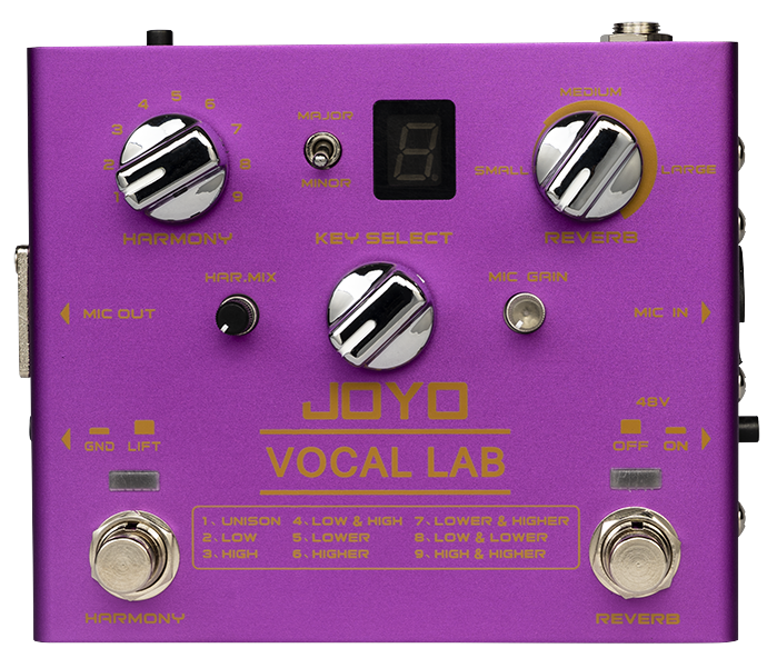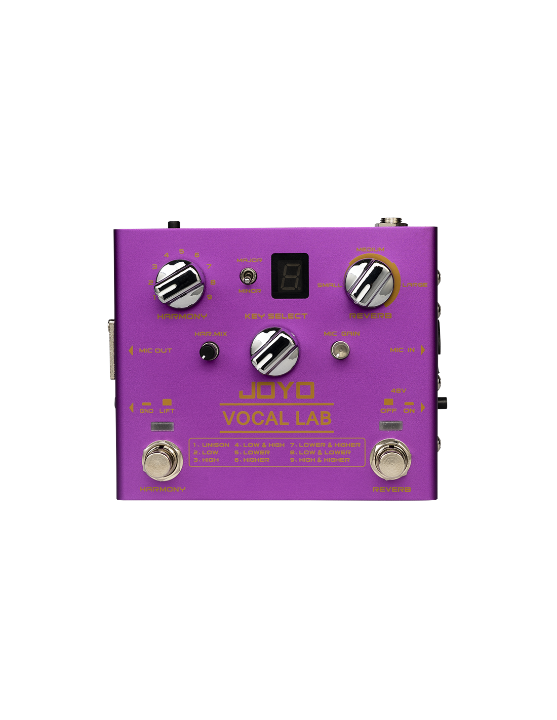 JOYO R-16 VOCAL LAB PEDAL EFFECT è un pedale harmonizer e riverbero per voce con 9 effetti di armonizzazione Vocale, controllo Tonalità con selezione tra 12 tonalità (C, D, E, F, G, A, B) con possibilità di alterazioni (#) e switch Maj/Min per scala maggiore o minore, Riverbero a 3 modalità Small, Medium e Large, alimentazione Phantom 48V, manopole dedicate per Harmony, Key Select, Reverb, Harmony Mix e Mic Gain, 2 footswitch indipendenti per attivare/disattivare armonia e riverbero, illuminazione regolabile con modalità Sync, Always o Off.
