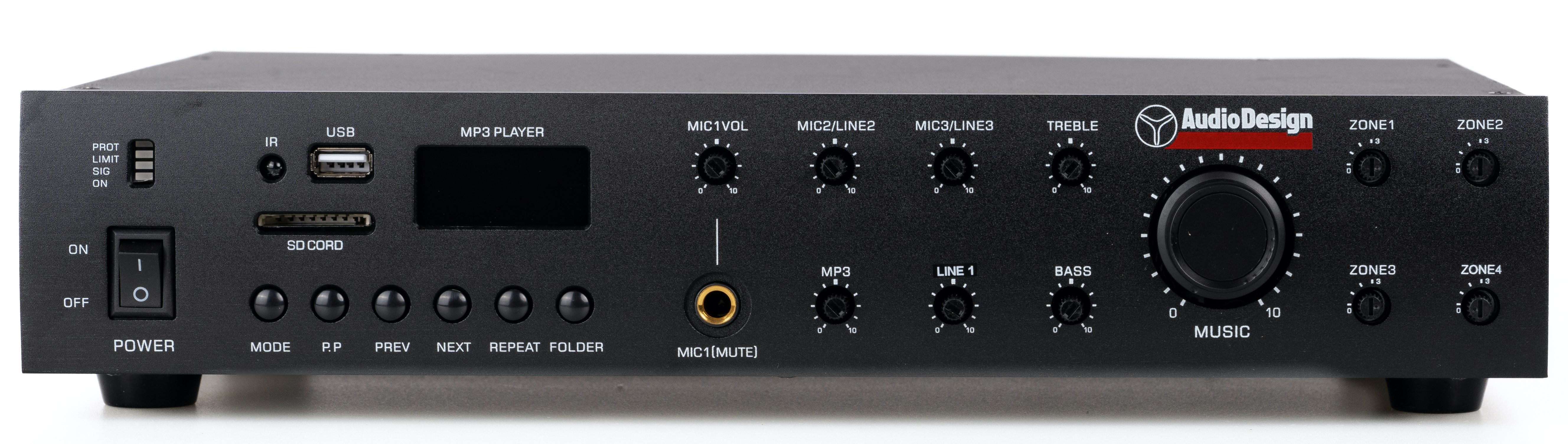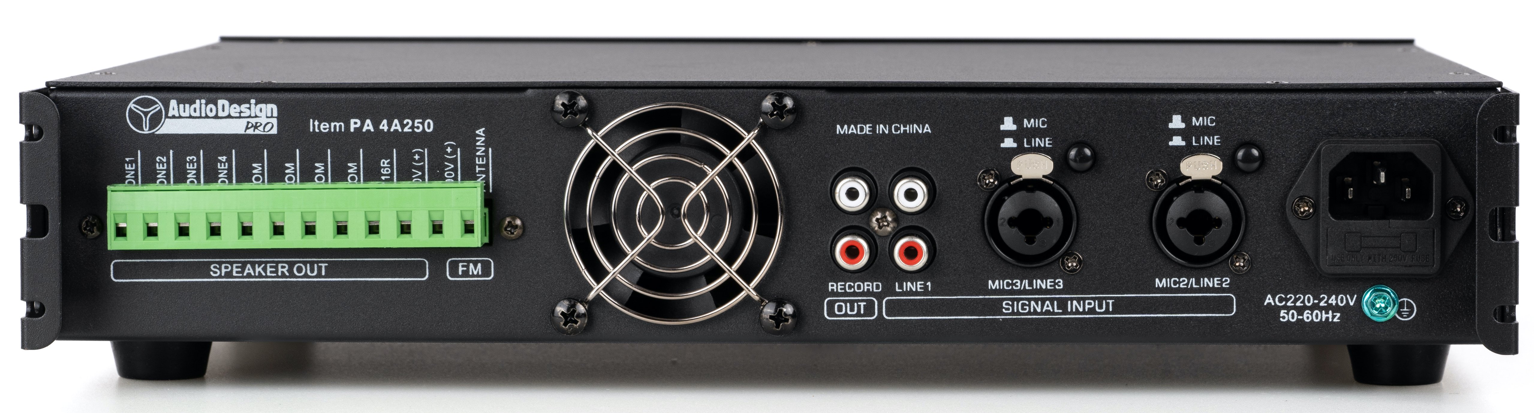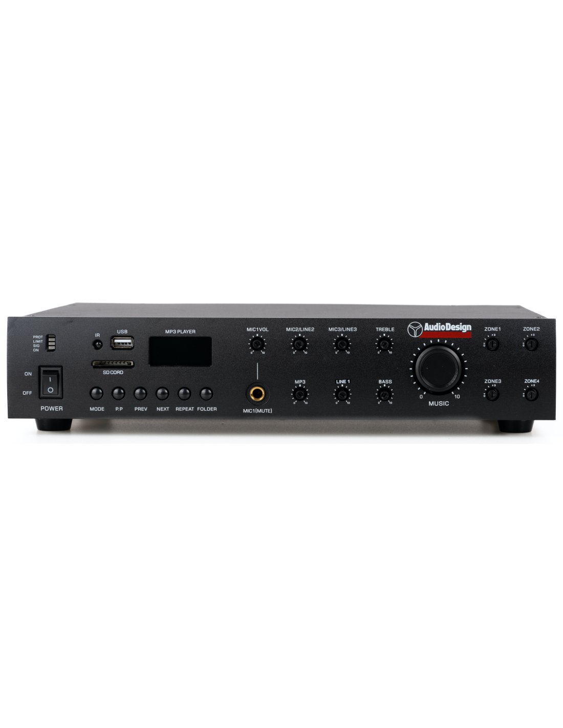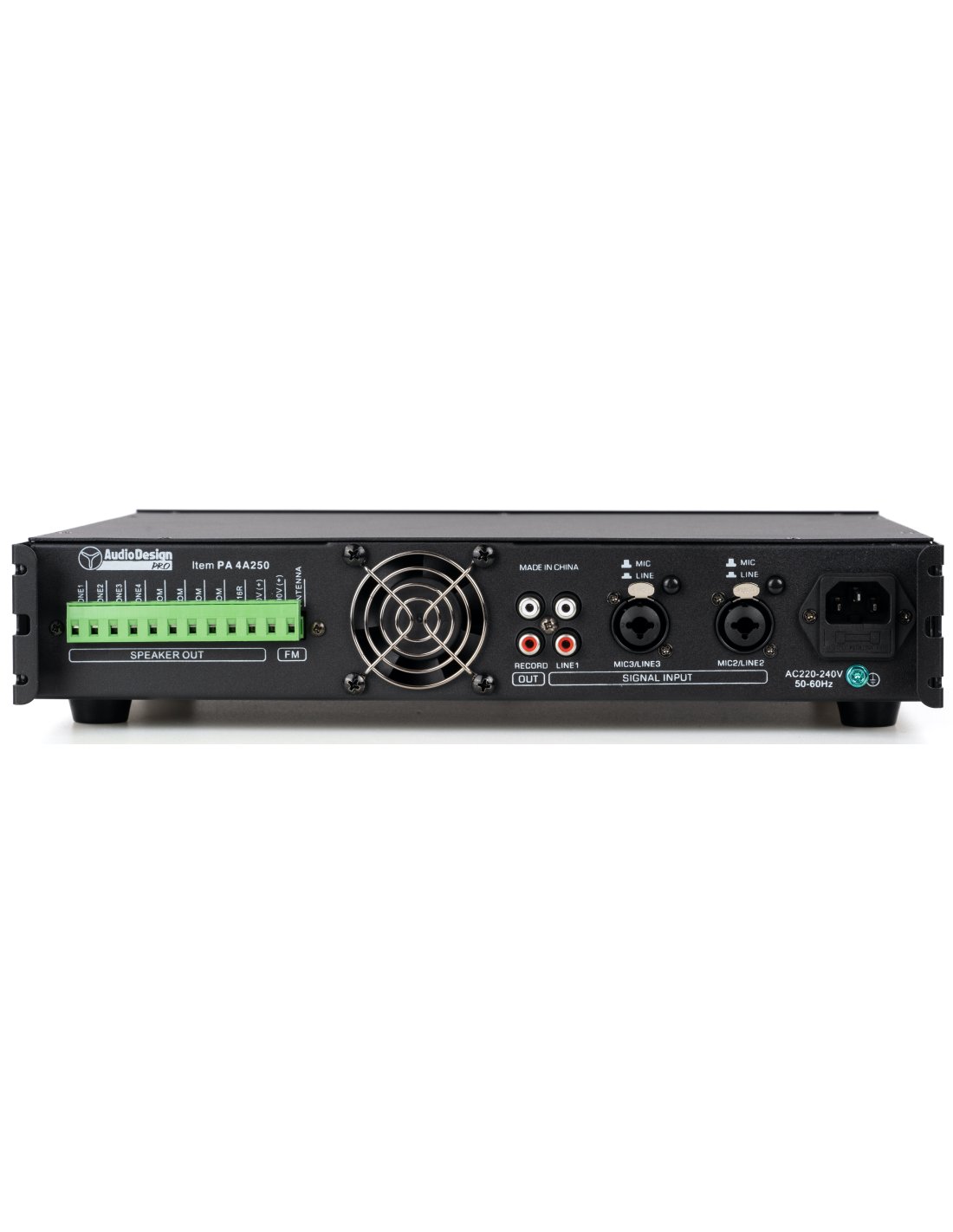 AUDIODESIGN PA 4A350 HDMI è un amplificatore audio P.A. 4 zone con 350 W di potenza. Le caratteristiche tecniche includono ingressi 2 mic + 2 Aux (USB/BT/Radio FM) – HDMI, telecomando in dotazione, eq a 2 bande Bass/Treble, controlli volume indipendenti per ogni zona, connessioni a 8 Ohm – 70/100 V, 4 zone a 100 V