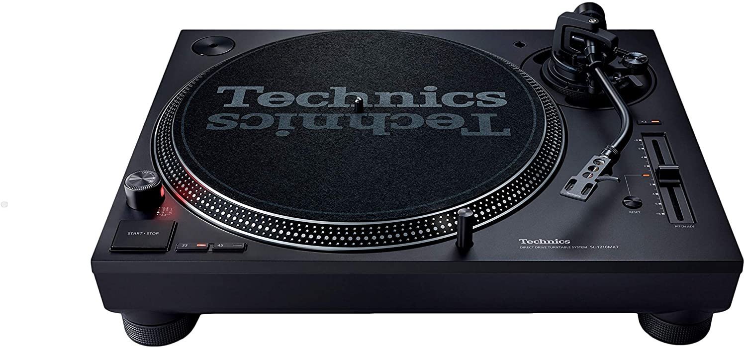 TECHNICS SL1210 MK7. Giradischi a trazione diretta con controller del motore ad alta precisione, isolamento high-dumping, braccio estremamente sensibile a bilanciamento statico, terminale phono rimovibile, fader ultra sensibile, tasti selezione giri, tasto start/stop, giradischi in alluminio pressofuso. Include Shell, coperchio antipolvere, cavi di collegamento e di massa, slipmat, centratore 45 giri (testina non inclusa)