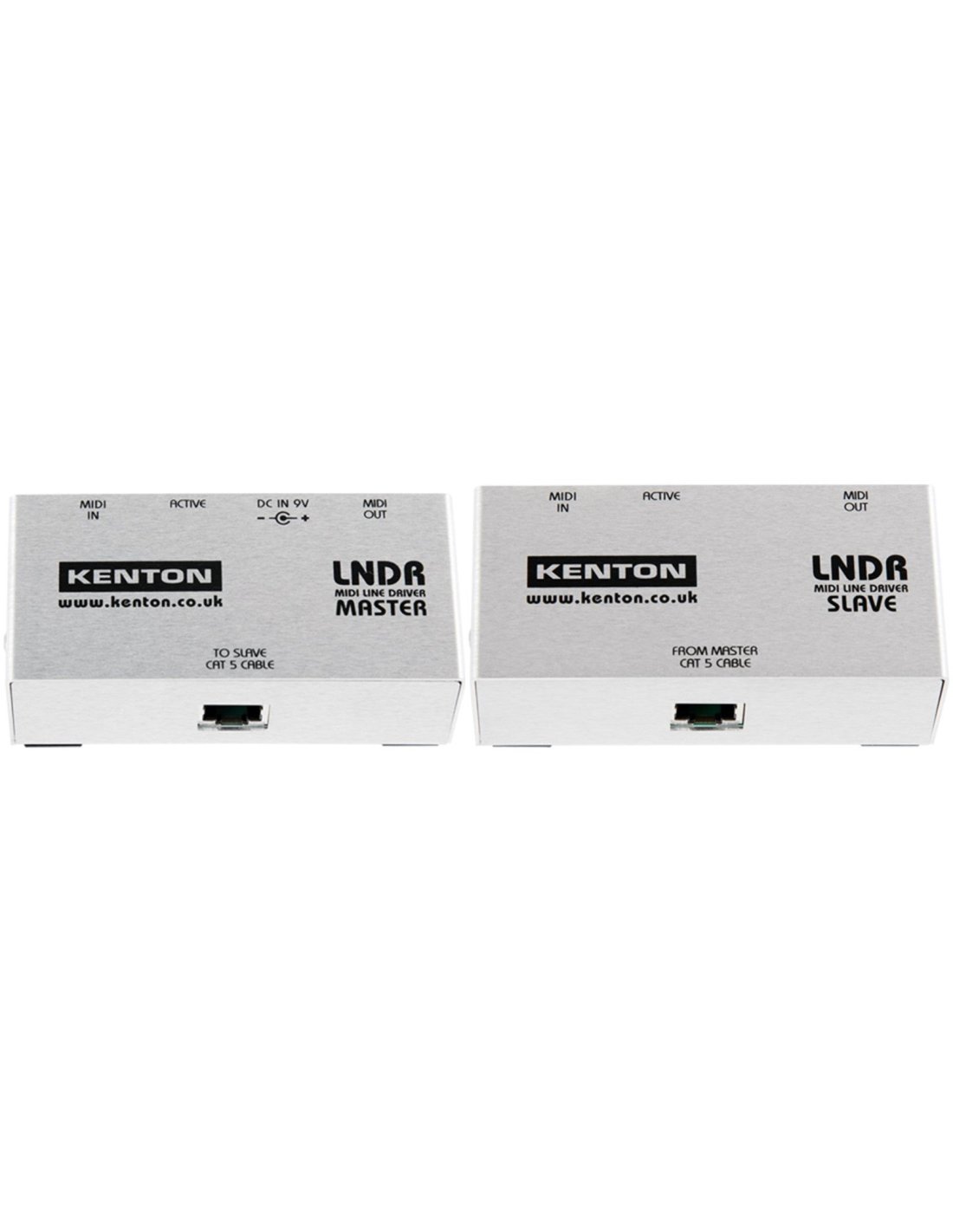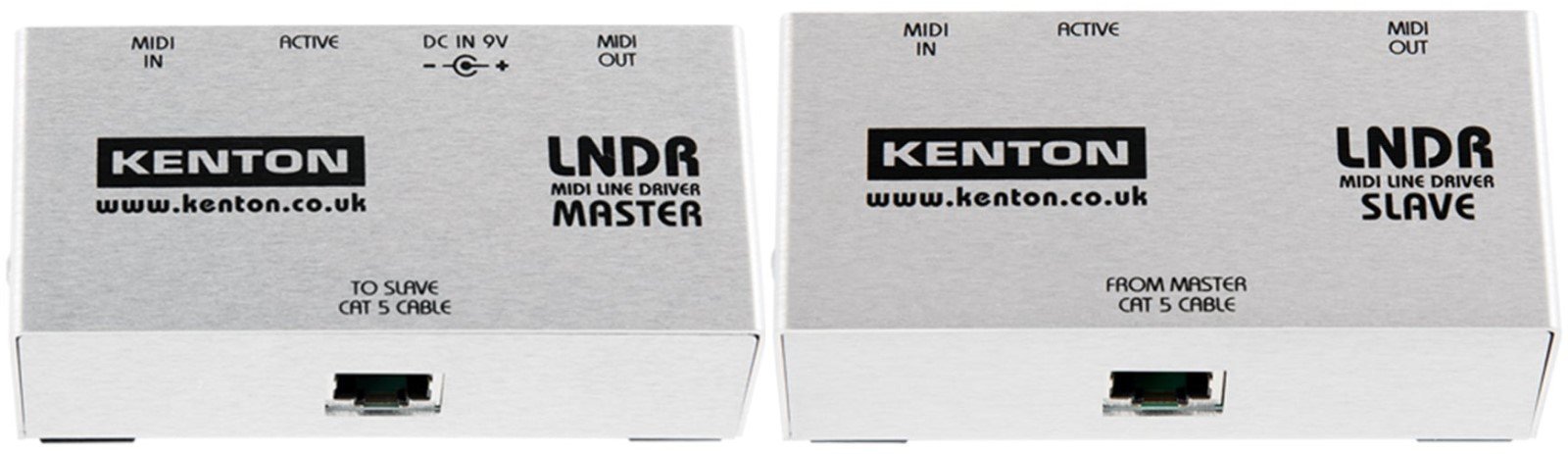 KENTON LNDR / MIDI LINEDRIVER. Coppia di D.I. box MIDI master/slave che consentono l'invio del segnale fino ad una distanza di oltre 500m tramite cavo CAT5 standard (non incluso). L'unità master è alimentata tramite cavo di alimentazione 9v in dotazione.