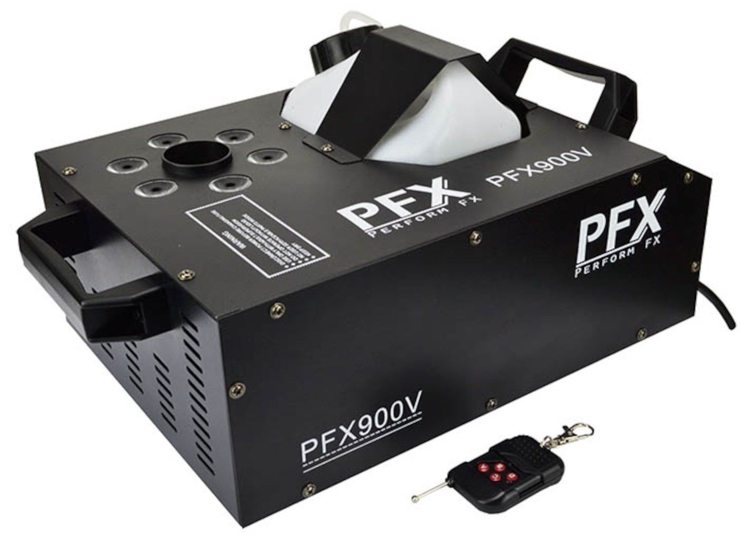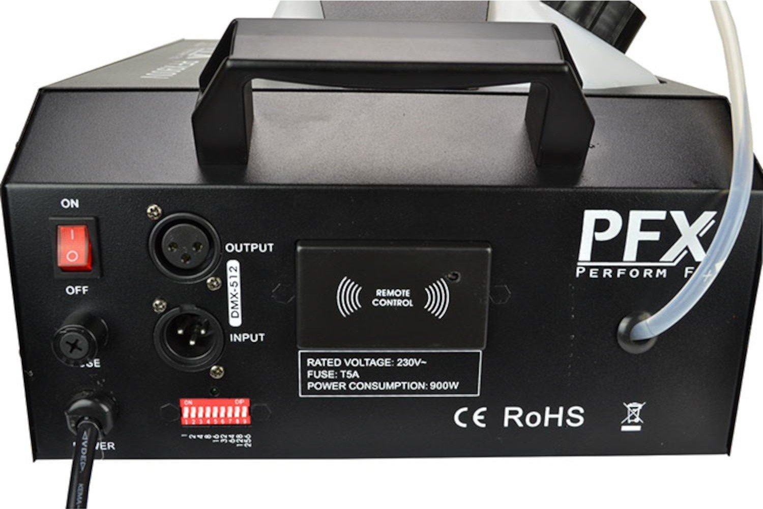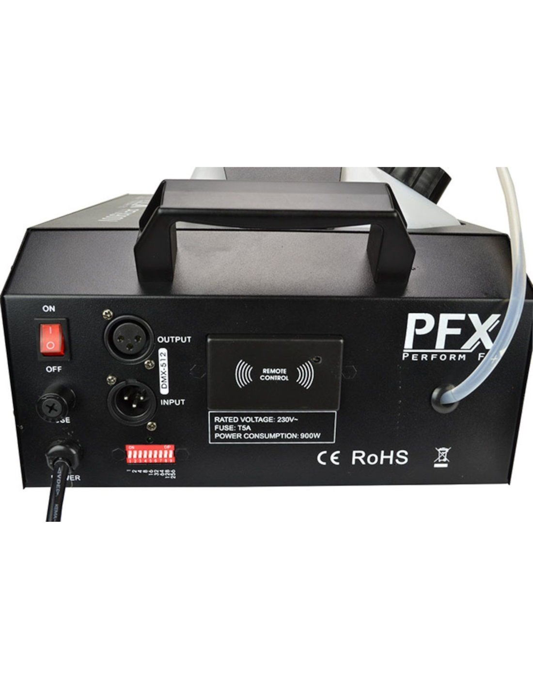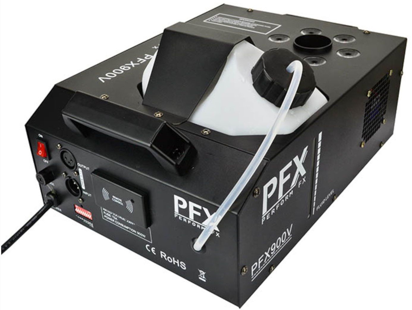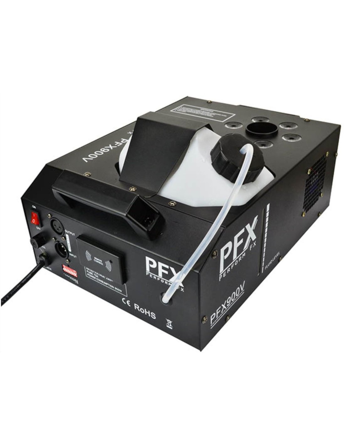 ATOMIC4DJ PFX900V. Macchina per il fumo a getto verticale con 900W di potenza, 6 led da 3W TCL 3in1, funzionamento manuale tramite telecomando wireless incluso con 4 pulsanti funzione o via DMX con canali impostabili via Dip switch. Presenta connessione DMX tramite XLR 3pin e staffe per il montaggio a sospensione.