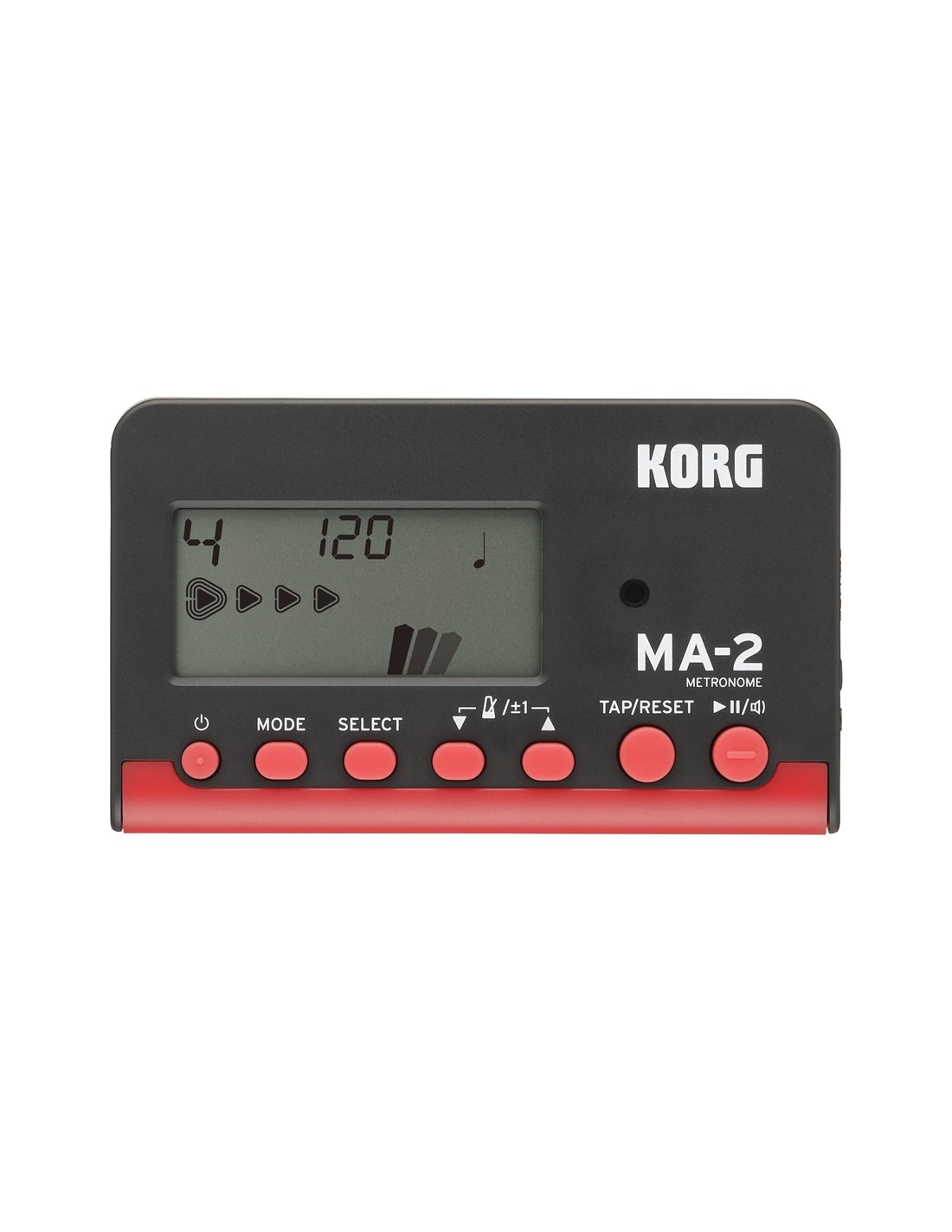 Metronomo Korg MA-2BKRD. Il Korg MA-2BKRD è un metronomo compatto Card-Type con ampio display LCD, range da 30 a 252 bpm, 0-9 beats, altoparlante, uscita cuffie, regolazione del volume e calibrazione corista da A4=410Hz a 480Hz.
