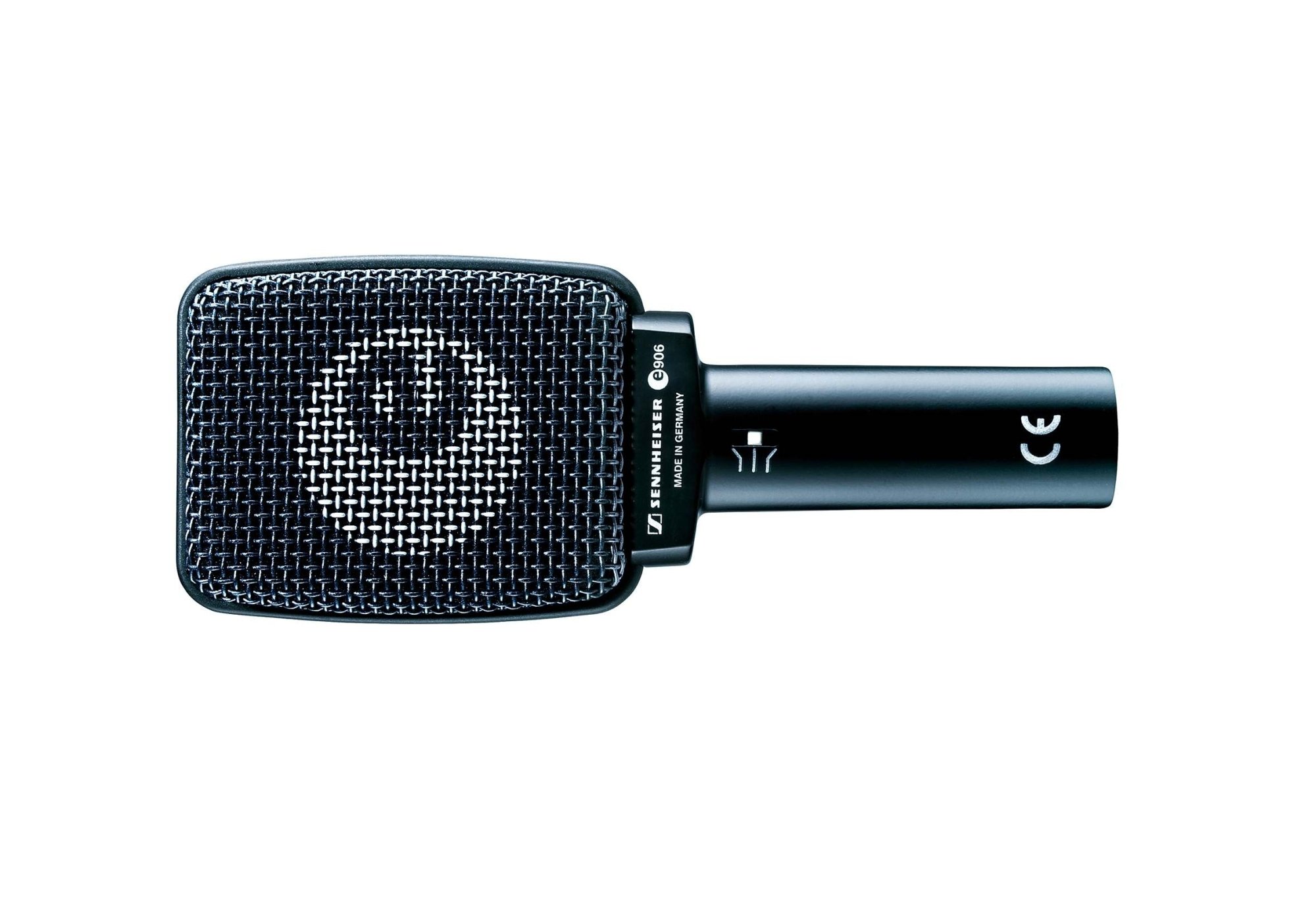 SENNHEISER E906. Microfono dinamico supercardioide particolarmente adatto per prese di amplificatori di chitarra e strumenti a percussione. Può essere usato senza stativo e presenta una curva di risposta in frequenza specifica per il suono della chitarra 4,2kHz. Include clamp MZQ 100, e custodia per il trasporto.