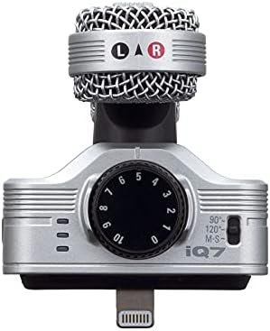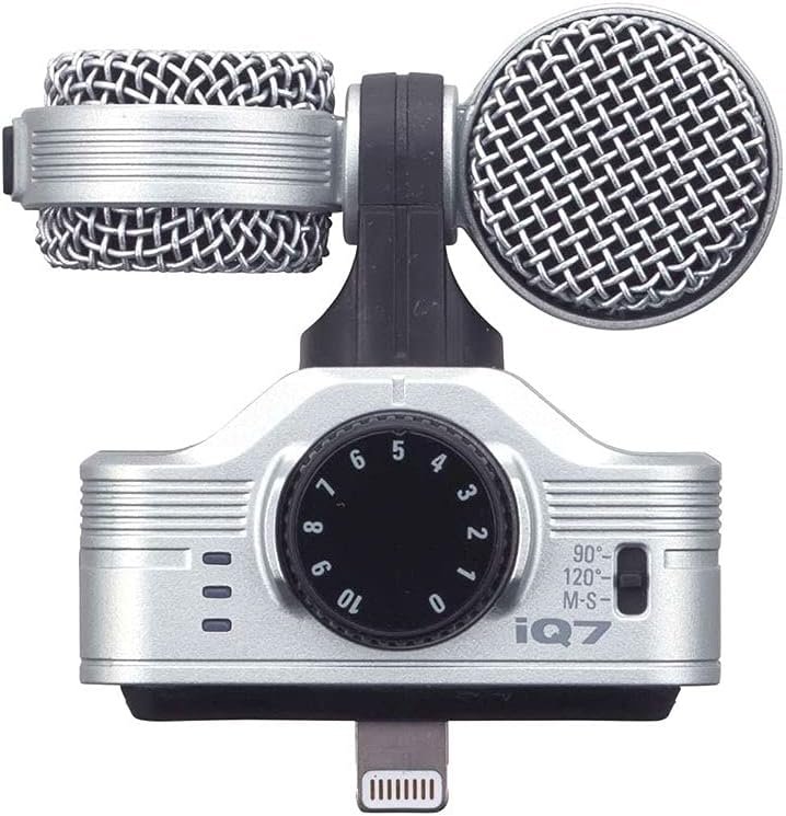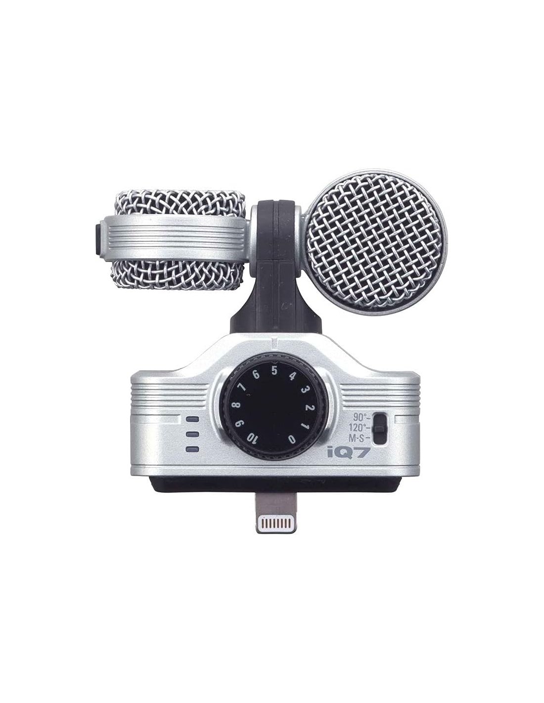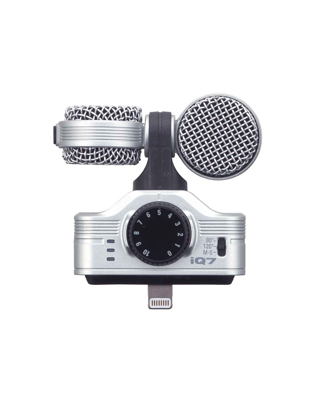 ZOOM iQ7 è un microfono a condensatore Mid-side stereo con connettore Lightning adatto all'uso con dispositivi iOS. Le caratteristiche tecniche includono, microfono direzionale "Mid" che cattura il segnale proveniente direttamente di fronte e microfono "Side" bidirezionale in grado di catturare l'audio proveniente da entrambi i lati, selettore a 3 vie di angolazione di ripresa; 90°, 120° e M+S per registrazione dell'audio "raw", risoluzione audio 16bit/44.1-48kHz, SPL max 120dB, controllo di gain analogico, indicatore di accensione LED, connessione Lightning, app Handy Recorder scaricabile gratuitamente da Apple Store per il controllo remoto. Compatibile con sistemi operativi iOS 6.0 e successivi.