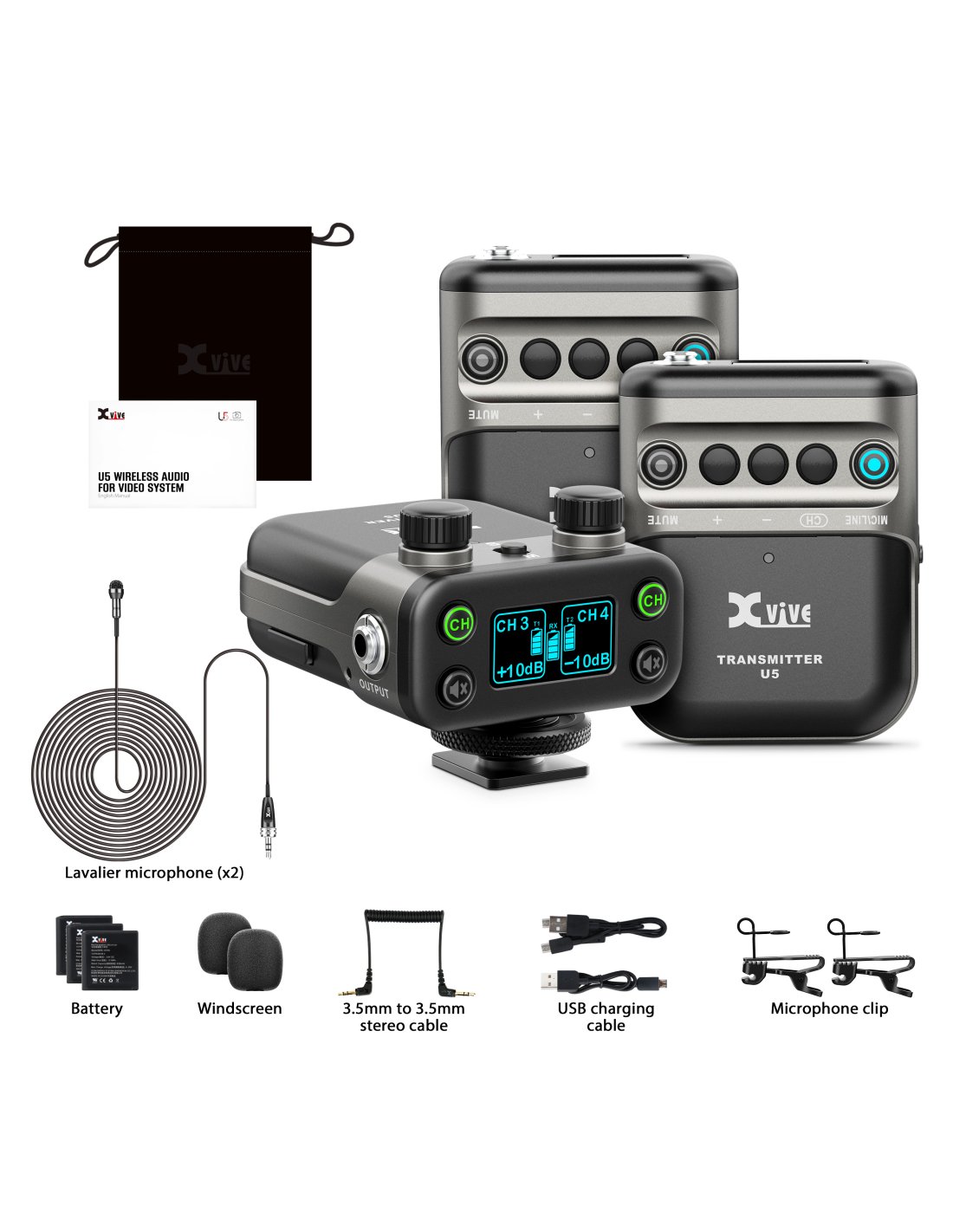 Xvive U5T2 LAVALIER - Sistema wireless digitale con doppio trasmettitore per camera DSLR o Broadcast