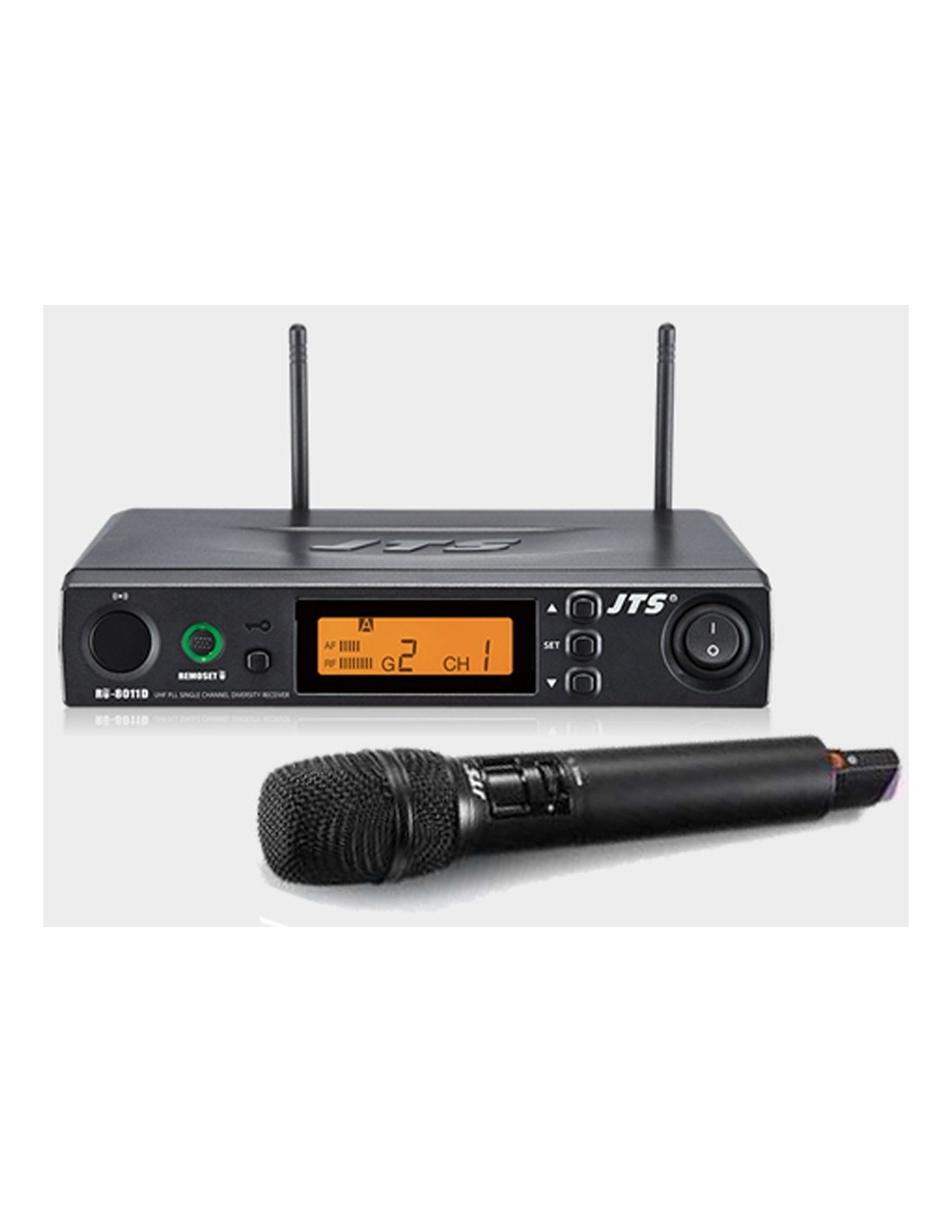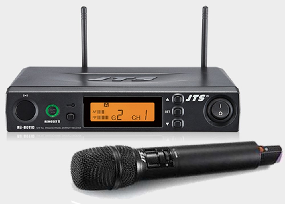 JTS RU-8011D/RU850TH RADIO A MANO 614-650 MHZ. Sistema UHF PLL con tecnoclogia wireless diversity di 2nd generazione composto da: ricevitore a singolo canale RU-8011 e radiomicrofono a mano RU850TH. Le caratteristiche tecniche includono larghezza di banda di 36 MHz, 16 frequenze selezionabili per canale, doppio display a 7 segmenti sul ricevitore. Banda di Frequenza 614-650 MHz.