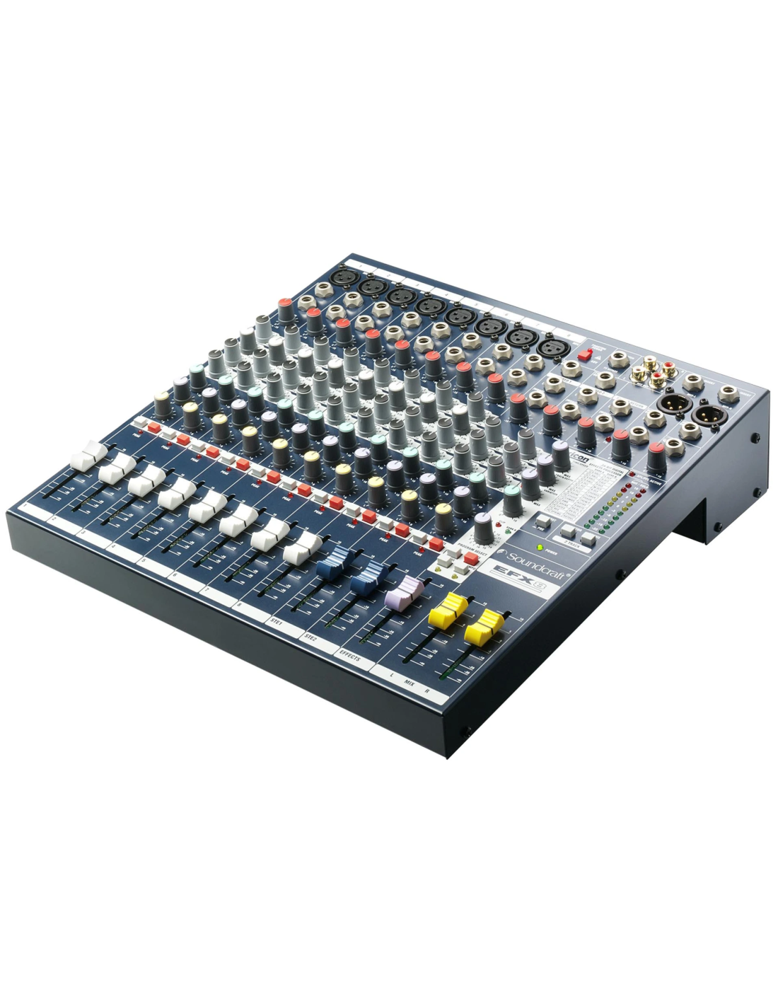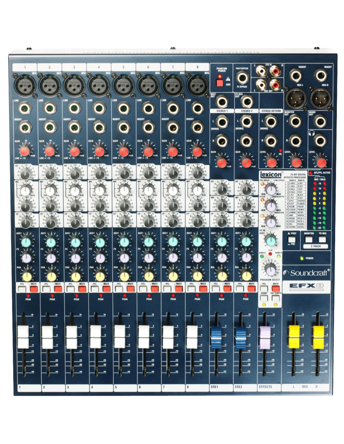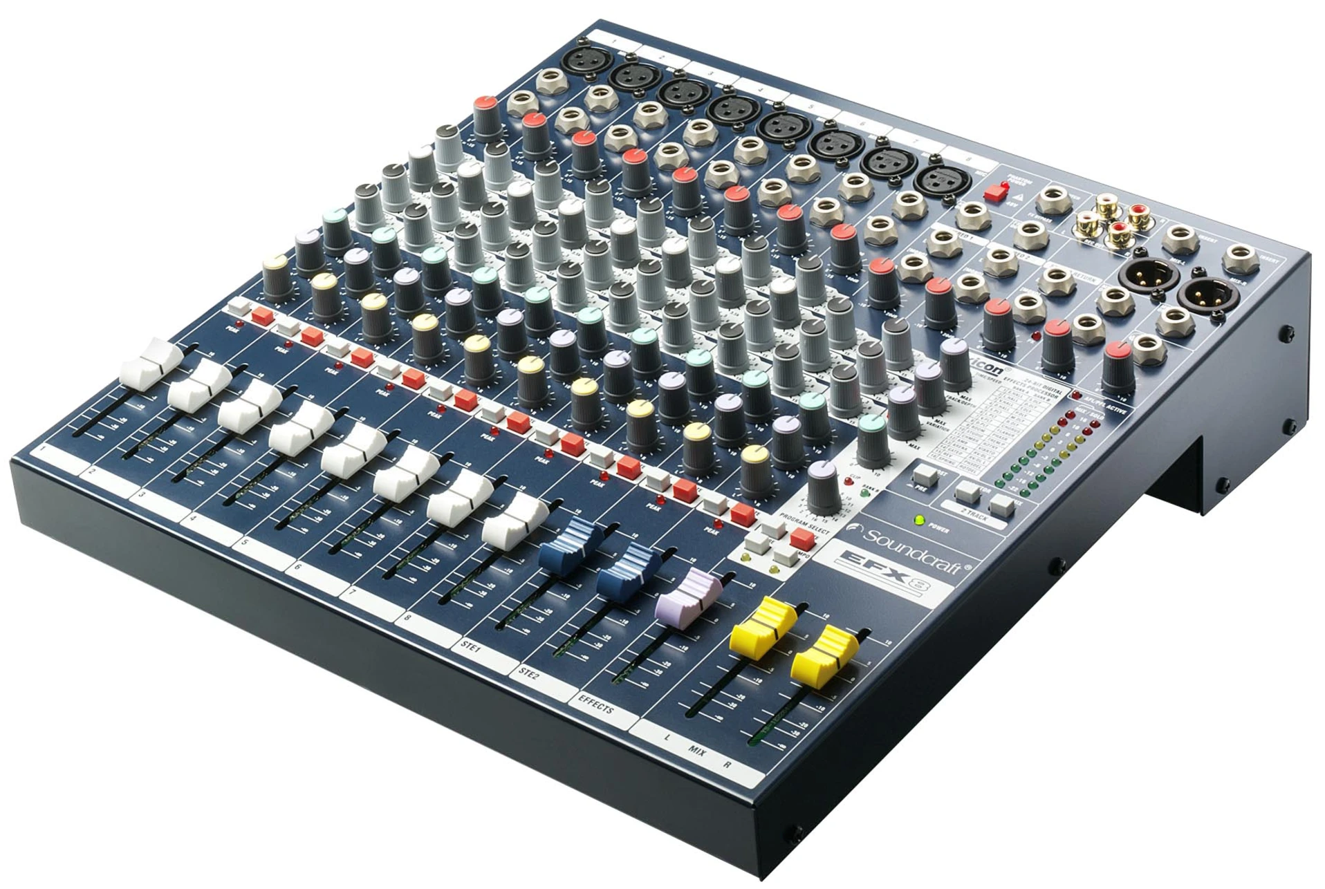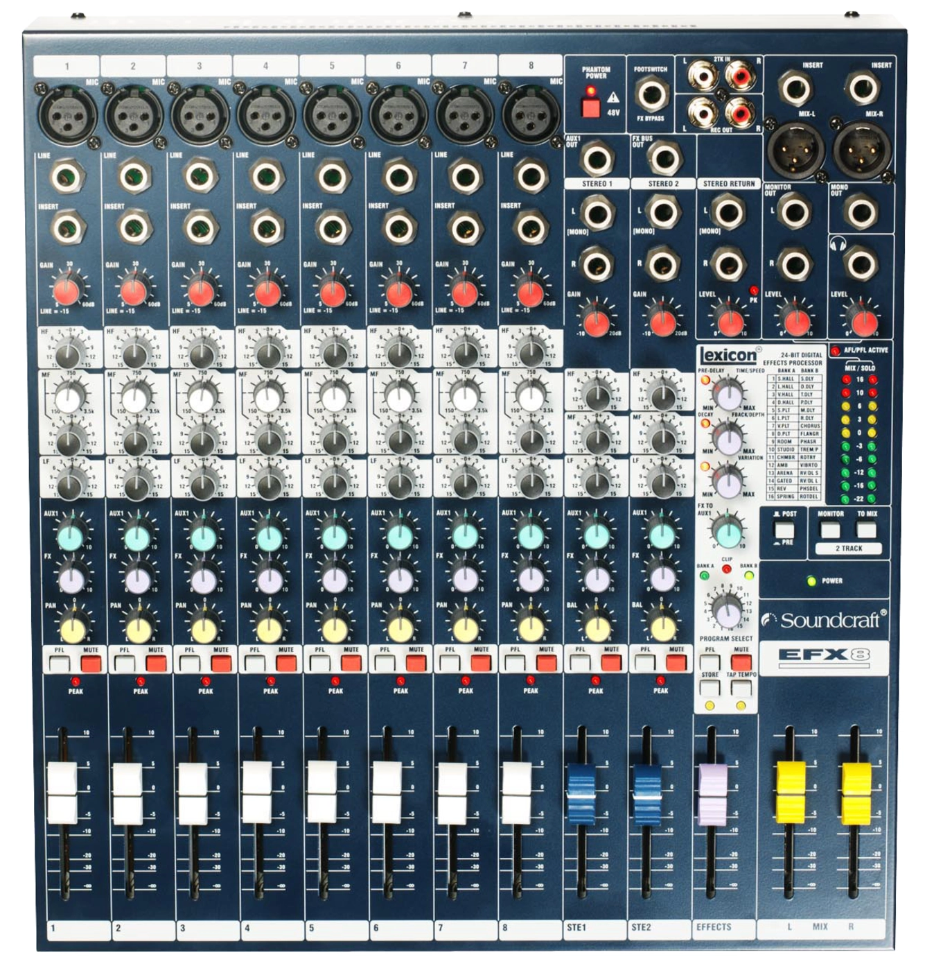 Soundcraft EFX 8 e' un mixer multipurpose dal costo estremamente contenuto, rivolto a piccole realta' di live music, recording, luoghi di culto e installazioni commerciali, dotato di potente sezione effetti digitali Lexicon a 24-bit e preset Lexicon creato espressamente per uso Karaoke. Soundcraft ha rivolto particolare attenzione sulla qualita' dei componenti per la miglior resa dell'audio e su un approccio estremamente intuitivo all'uso. La tecnologia interna e' di tipo surface mount con componentistica ad elevata precisione, cosi' che le impostazioni di EQ e guadagno possono essere condotte in modo estremamente accurato. I mic preamp GB30 (progettati da Graham Blyth in occasione del 30° anniversario dell'azienda, e gia' implementati nelle console serie LX7II e GB) offrono regolazioni ad alta risoluzione su un range dinamico di 55dB, per un headroom disponibile di ben +22dB. Una caratteristica unica del banco e' il led di PEAK per il monitoraggio del segnale, questo controllo mantiene traccia di eventuali overload misurati su diversi punti della catena di canale, illuminandosi sempre piu' brillantemente quanto piu' il segnale si avvicina al valore di picco. Le uscite monitor e cuffia lavorano in parallelo, permettendo l'ascolto contemporaneo per l'artista, in cuffia, e per il tecnico, attraverso studio monitor.