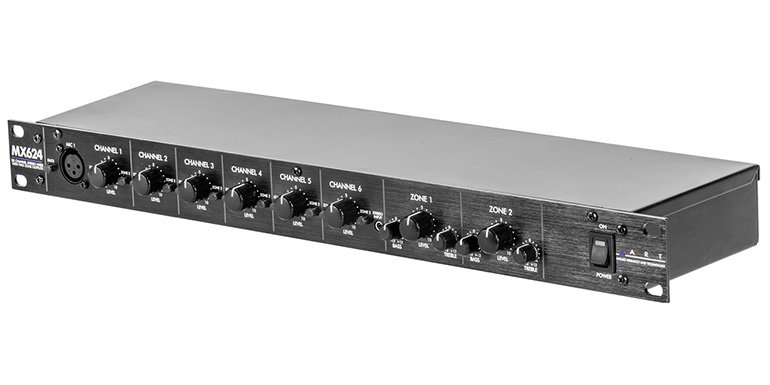 Key Features : Six stereo input channels with individual level controls - Balanced mono microphone XLRs available on the first three channels - Selectable padding on mic inputs - Full +48V low-noise phantom power independently switchable for each mic input - First channel provides switchable ducking of other channels with selectable parameters - Front panel 1/8-inch stereo (TRS) mini-phone plug for portable music player input - Two sets of left and right 1/4-inch TS main output jacks with master level, bass and treble controls - Two bus input 1/4-inch TRS jacks allow units to be chained to provide extra inputs - Rugged 1U rack-mount steel chassis with built-in power supply <br />