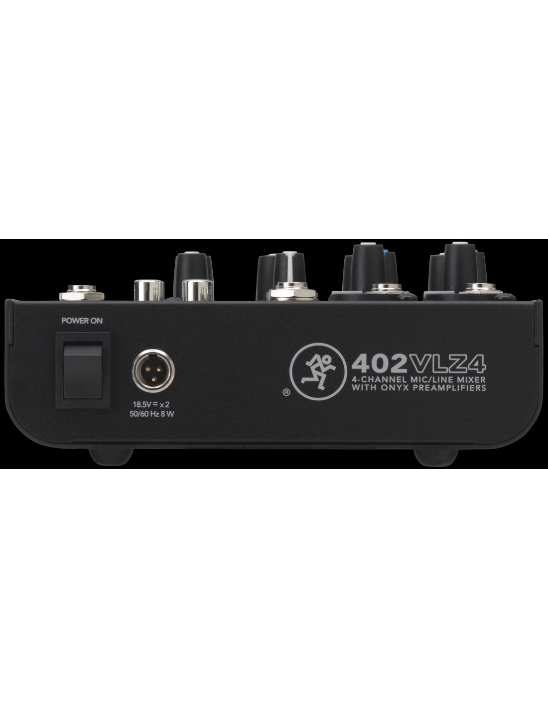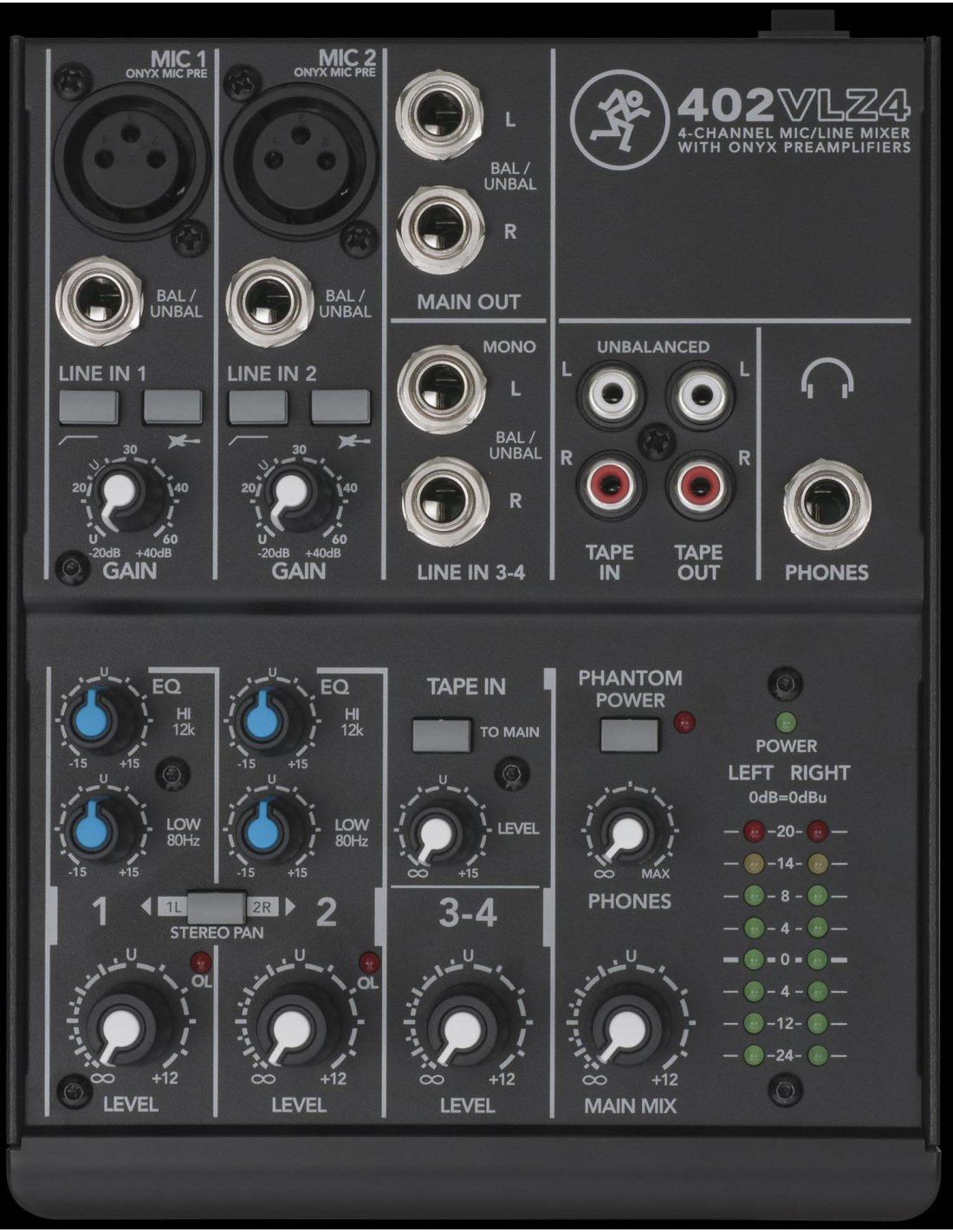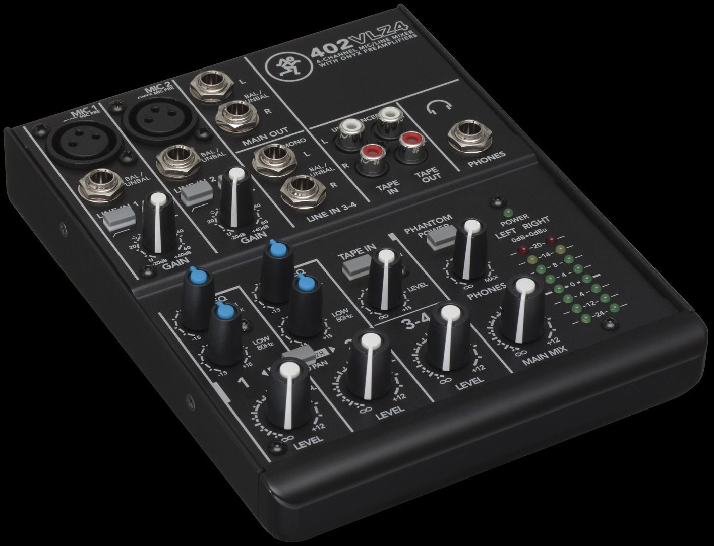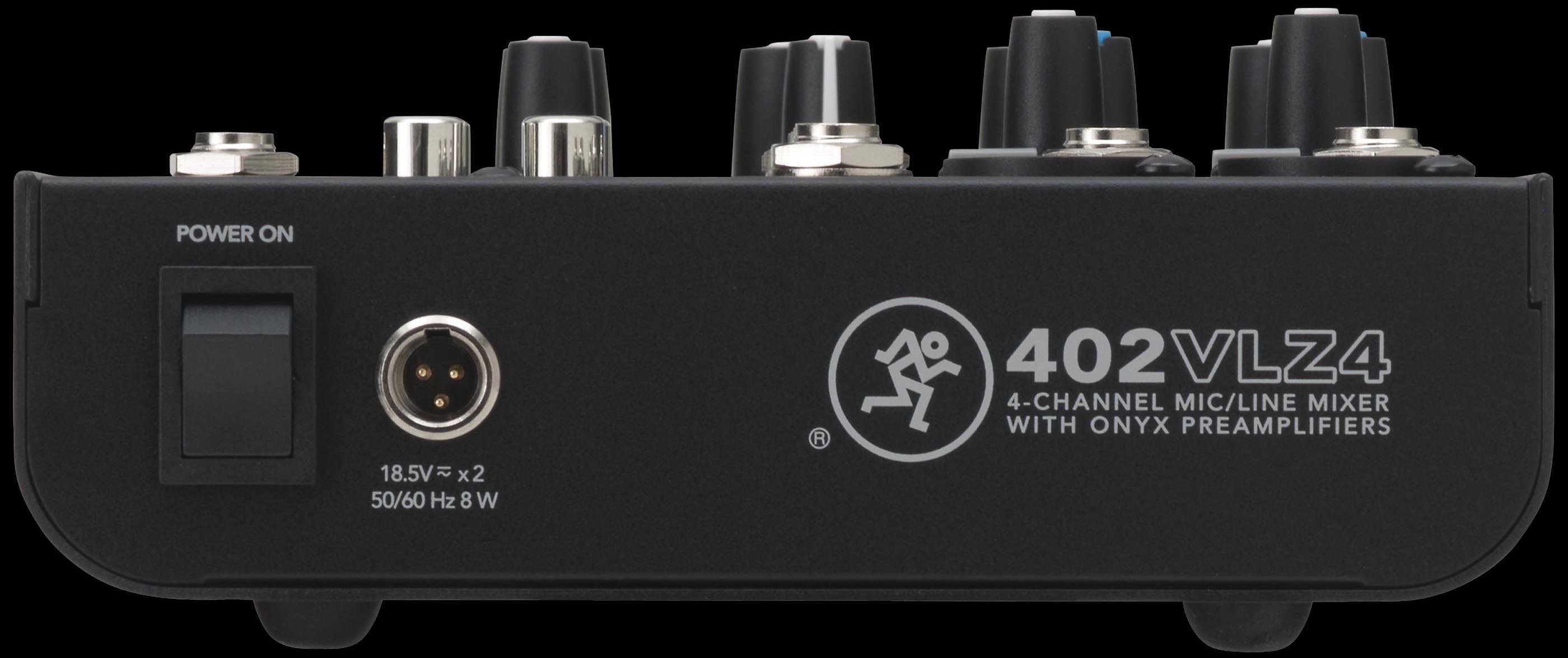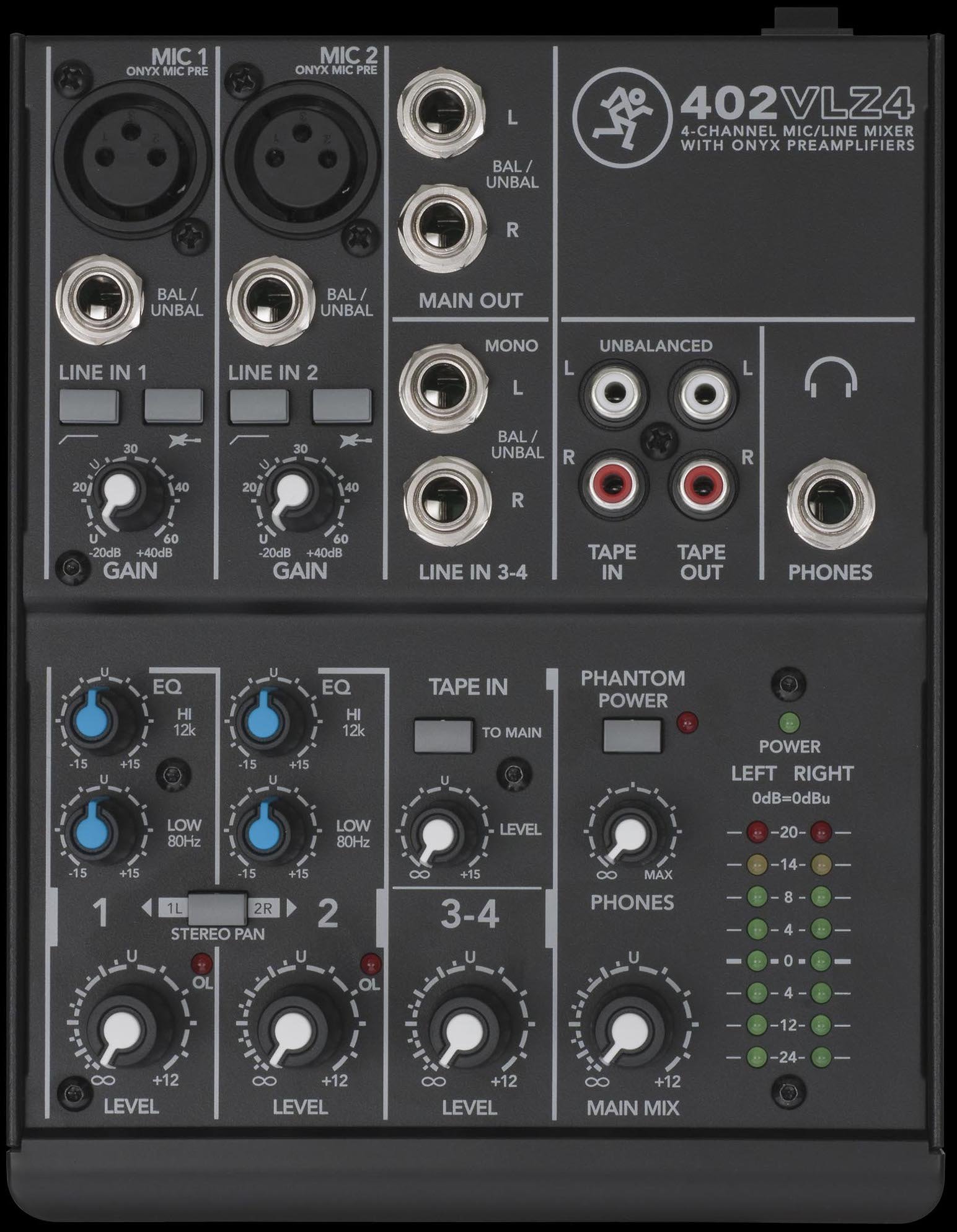 Il 402VLZ4 è un mixer analogico della Mackie a 4 canali con 2 preamp microfonici Onyx, gain range di 60dB, dynamic range di 128.5 dB, +22 dBu di line input handling, Phantom Power per microfoni a condensatore, RF rejection migliorata, 4 ingressi Linea high-headroom, EQ a 2 bande (80Hz e 12kHz), low-cut filter sugli ingressi microfonici (18 dB/oct 75Hz), low-cut filter sugli ingressi microfonici (18 dB/oct 100Hz), long-wearing logarithmic-taper fader da 60-mm, indicatori di livello illuminati a 8 segmenti.
