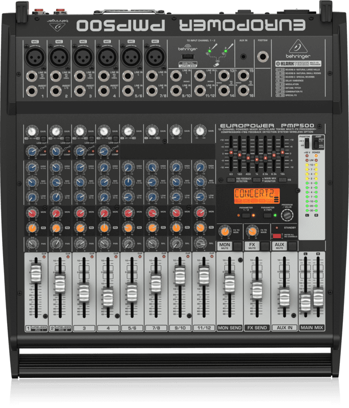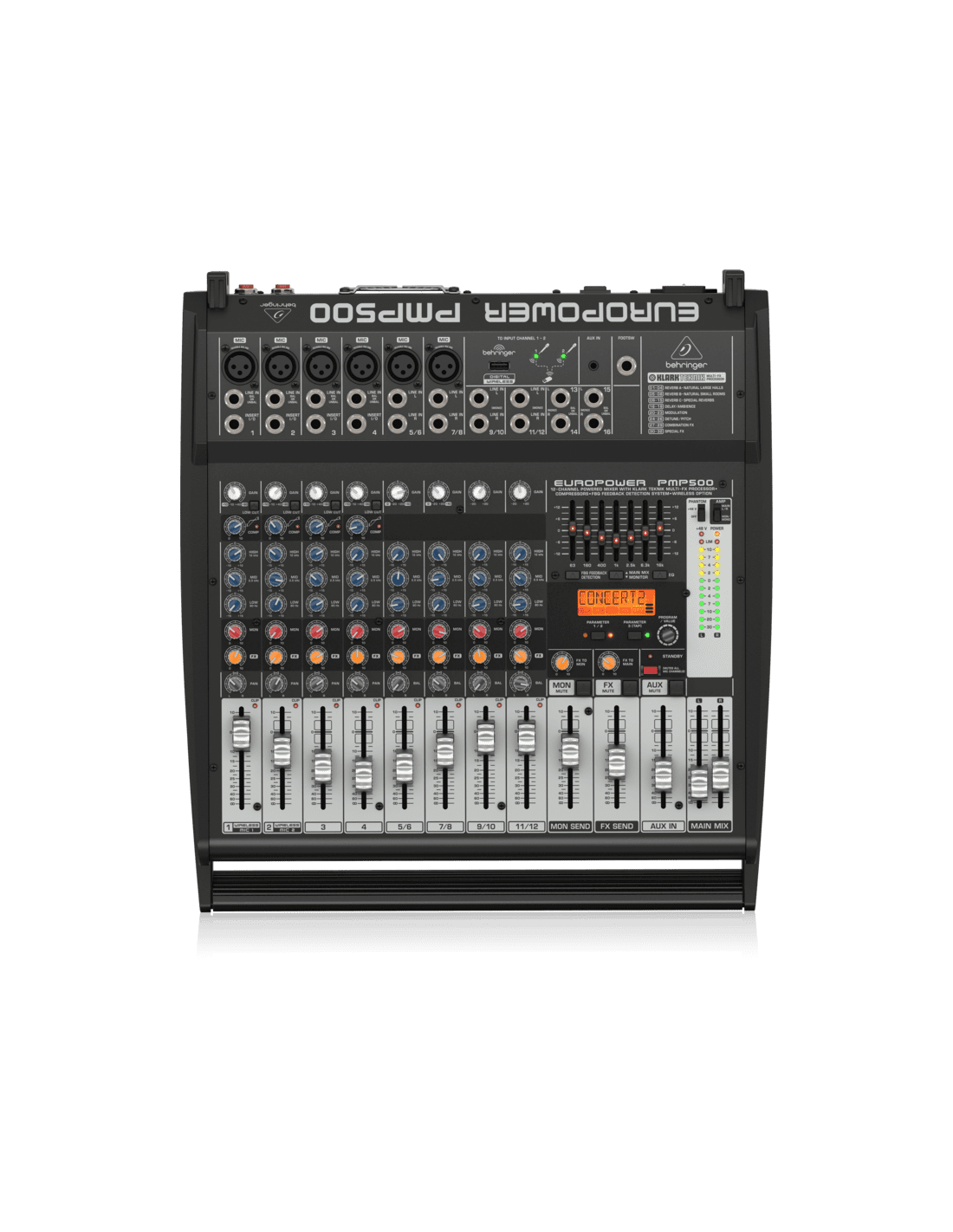 BEHRINGER PMP500 POWERED MIXER. Mixer analogico a 12 canali con 6 preamplificatori microfonici XENYX, 500W di potenza, 4 ingressi mono XLR/TRS e 8 stereo di cui 4 su XLR/TRS e 4 su doppio TRS L/R, uscite L/R tramite TRS, ingresso footswitch, Eq a 3 bande su ogni canale (Low, Mid, High) con controllo del compressore sui primi 4 canali, controllo livelli monitor e livelli effetti su ogni canale. Presenta equalizzatore grafico a 7 bande con sistema di rilevamento feedback FBQ, processore di effetti Klark Teknik 24-bit stereo con display LCD, doppi-parametri, funzione Tap e impostazioni utente memorizzabili.