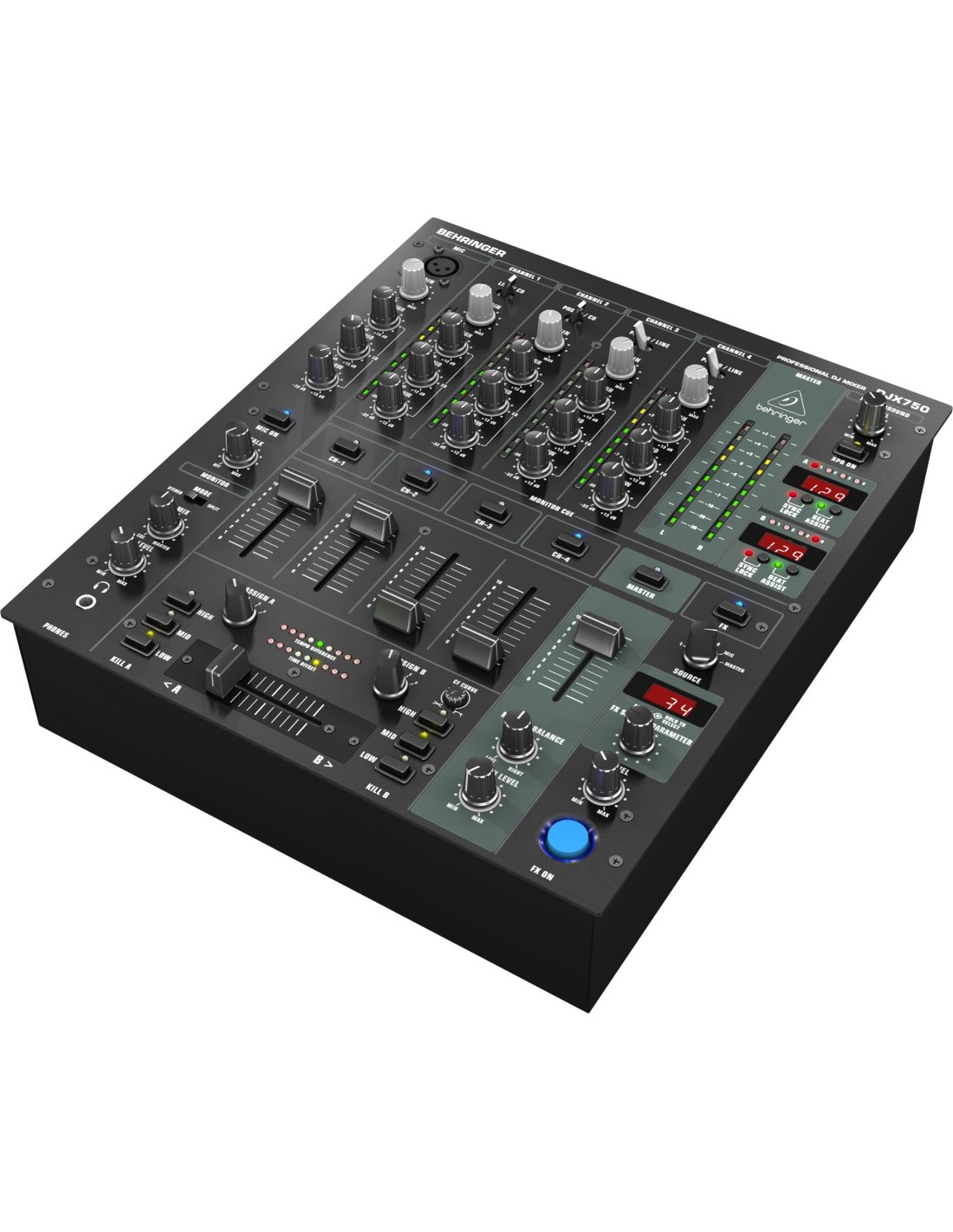 BEHRINGER DJX750 DJ PRO MIXER è un mixer da Dj con 5 canali, effetti digitali e contatore BPM. Le caratteristiche tecniche includono 4 canali CD/Line, CD/Phono e Line/Phono tramite input RCA stereo con controllo Gain, equalizzatore a 3 bande e Led meter, 1 canale mic con preamplificatore microfonico tramite XLR, equalizzatore a 3 bande e controllo Gain. Presenta doppio contatore BPM con display-time e Beat-sync, processore di effetti digitali, effetto Surround stereo XPQ, fader e crossfader Ultraglide, uscite Master/Booth/Tape tramite RCA stereo.