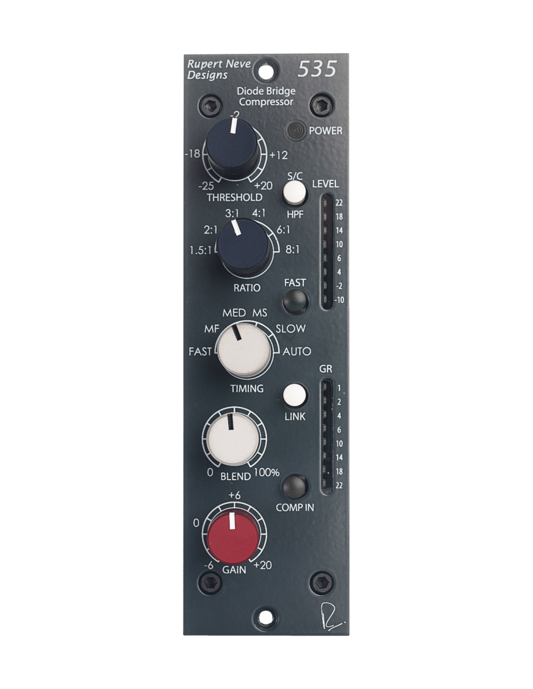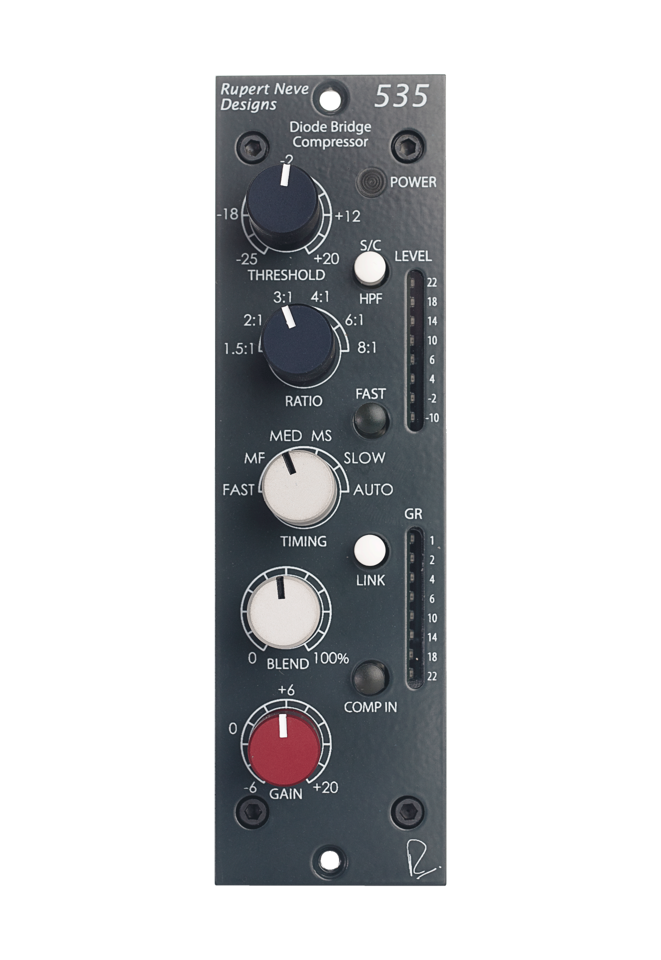Compressore Vintage Diode bridge Incisivo e versatile, il compressore ‘diode bridge’ RND 535 è basato sul compressore originale Rupert Neve 2254, offrendo al contempo nuove funzionalità come un controllo del timing avanzato, un rumore di fondo molto basso, controlli a step e la possibilità di un processamento parallelo interno (side-chain detection). Originariamente sviluppato per il circuito dell’acclamato Shelford Channel, il 535 veste il classico progetto dei trasformatori e degli amplificatori in classe A Rupert Neve, il tutto con una progettazione e una realizzazione pensata per il popolare formato serie 500.Cercando di superare le limitazioni dell’originale 2254, Rupert Neve Designs ha fatto tutti gli sforzi possibili per ottenere una riproduzione il più fedele possibile, migliorando le caratteristiche ed unendo il classico suono dell’originale ad una flessibilità adattata ai giorni d’oggi. Il 535 è un processore di dinamica pronto ad intervenire in modo efficace su qualsiasi traccia.