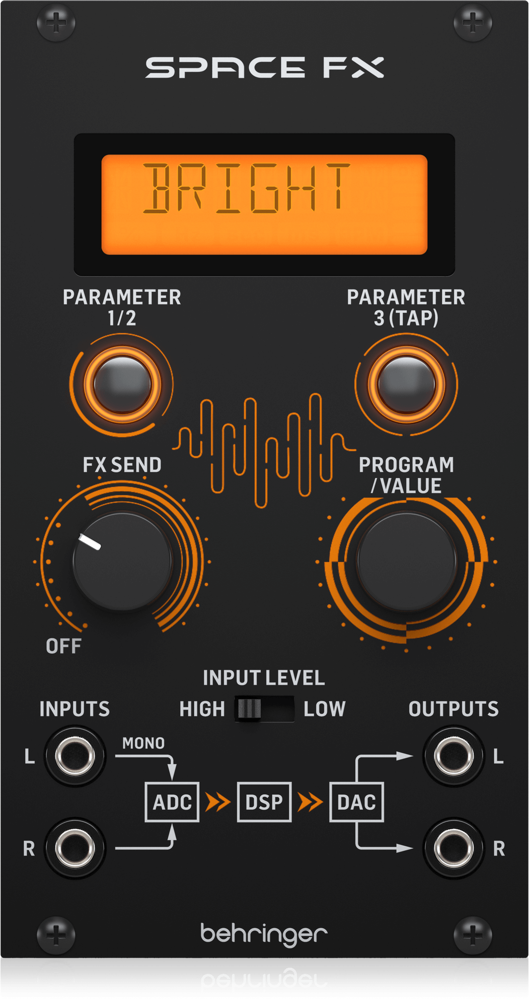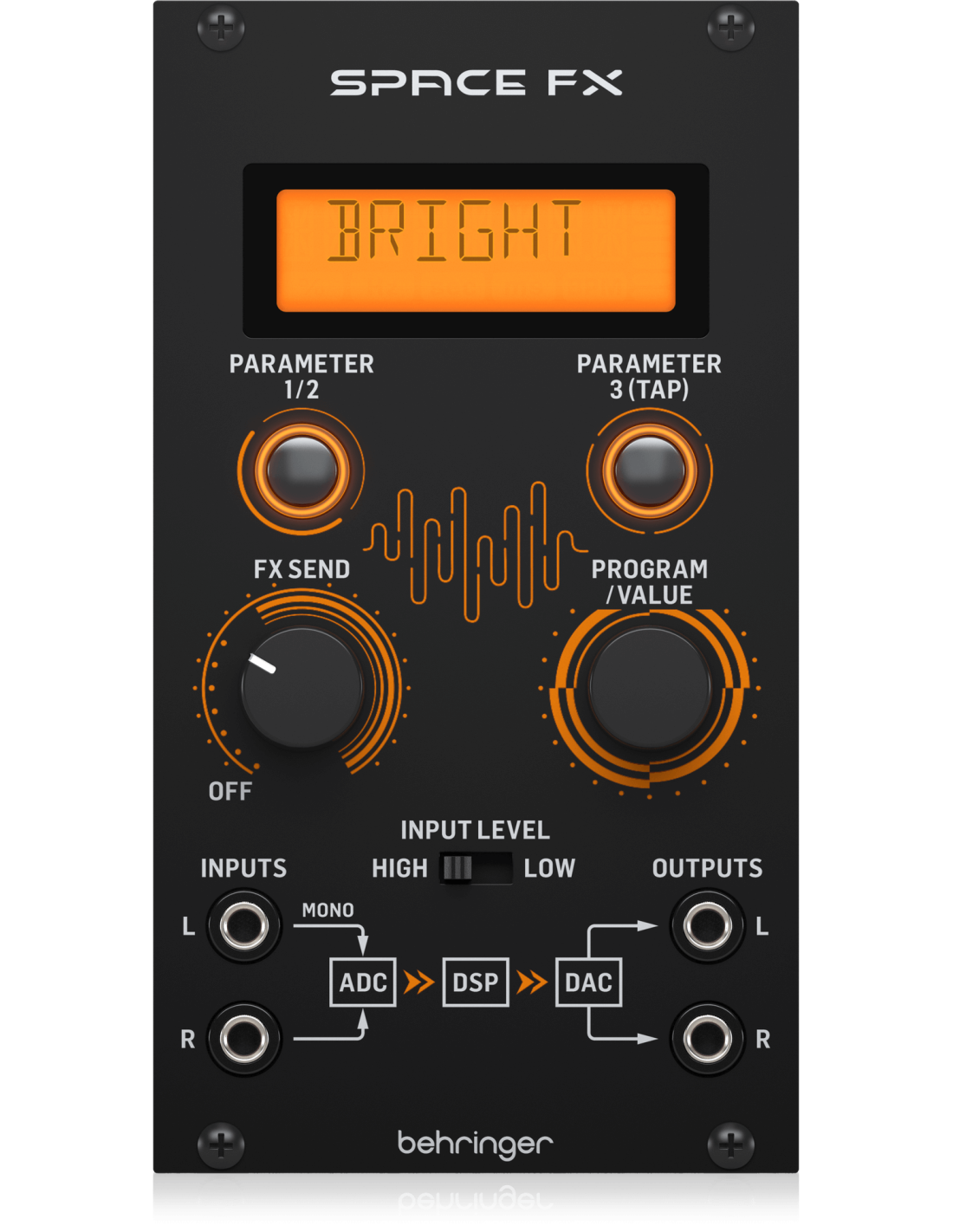 Lo Space Fx è un modulo Eurorack a 14 HP della Behringer. È dotato di effetti digitali a 24 bit stereo di alta qualità con tecnologia Klark Teknik, 15 riverberi, 8 diversi effetti di delay e modulazione, pitch shifter, talk box, filtro LFO e distorsione clipper e display LCD.