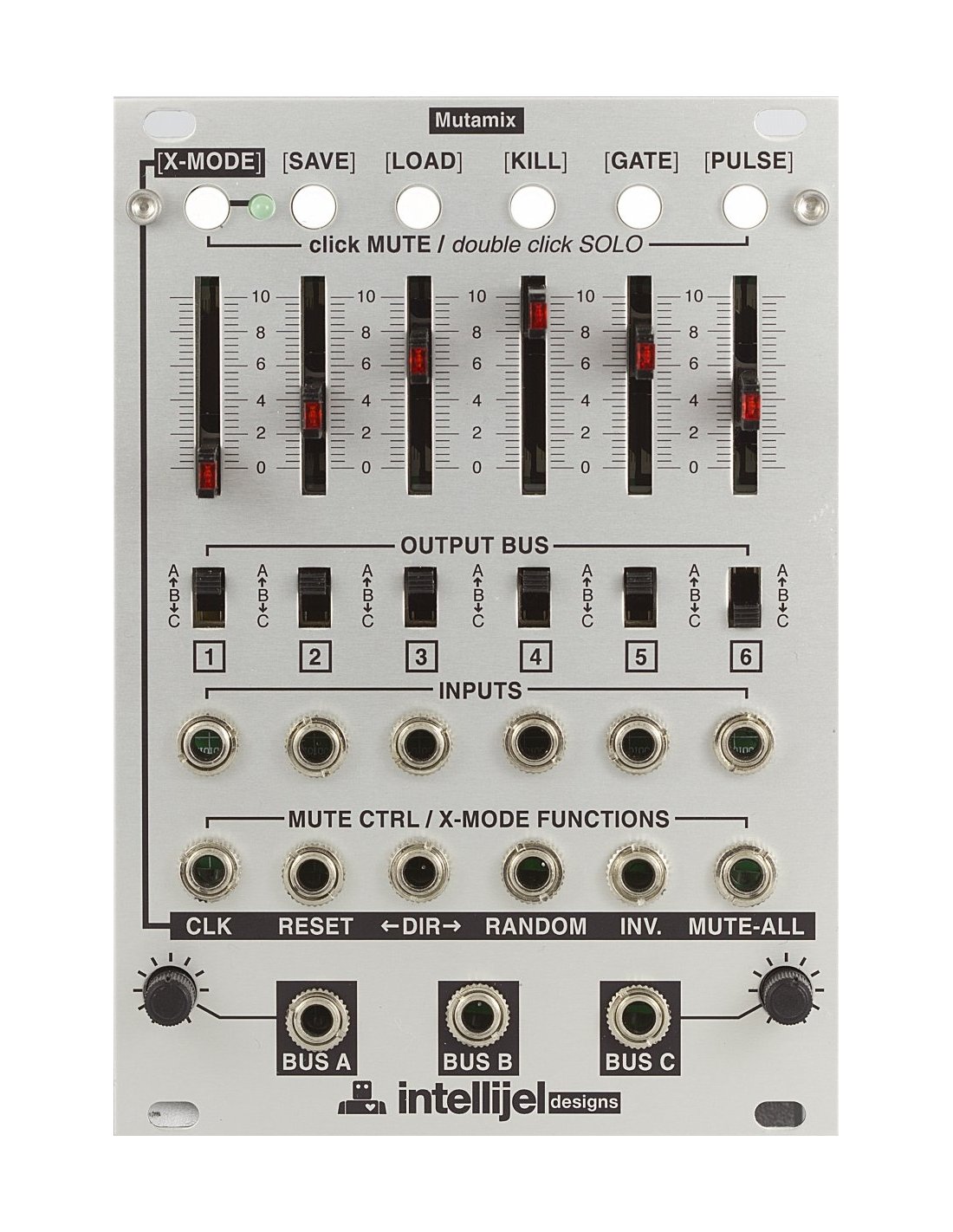 Il Mutamix 6 channel CV7Audio Mixer Module è un modulo Eurorack a 18HP della Intellijel. E' dotato di mixer per segnali audio e CV con 6 canali, 3 uscite di bus selezionabili, 6 ingressi MUTE CTRL per il controllo del mute e una modalità X-MODE che permette di richiamare sei preset di mute memorizzati e di controllarli tramite CV o gate.