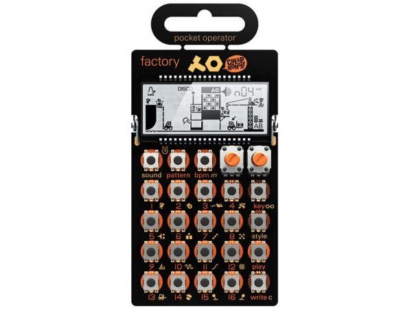 TEENAGE ENGINEERING PO 16 FACTORY è un sintetizzatore di melodie tascabile con effetti punch in, speaker integrato, blocco dei parametri, Display LCD, compressore, motori synth tra cui fm, sintesi sottrattiva, wave table e strumenti a corde modellati, Step Multiplier e funzione Jam Sync per la sincronizzazione con altri Pocket Operator.