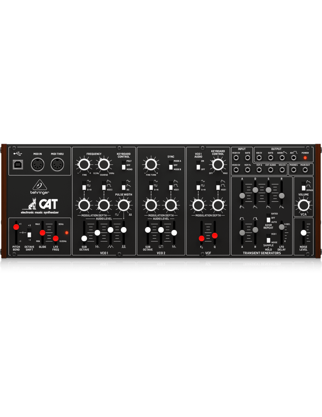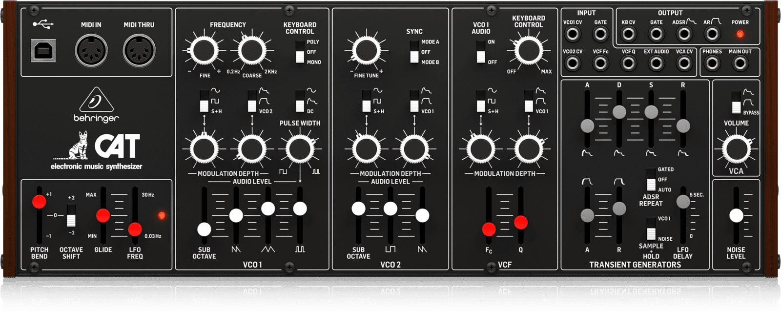 BEHRINGER CAT è un sintetizzatore analogico duofonico con 2 moduli VCO, 1 modulo VCF e generatore di transienti. Il VCO 1 è dotato di 4 forme d'onda miscelabili (dente di sega, triangolo, impulso e subottava), il VCO 2 di 3 forme d'onda miscelabili (triangolo a dente di sega e subottava) e due sorgenti di modulazione regolabili. Filtro passa basso con controllo risonanza, due sorgenti di modulazione regolabili e key tracking regolabile, LFO analogico, Noise generator e unità S&H, funzione Poly Chain per collegare fino a 16 unità esterne. Dotato di uscita principale tramite jack da 3,5 mm e 2 jack da 6,3 mm, uscita cuffie, MIDI In/Thru e USB-MIDI.