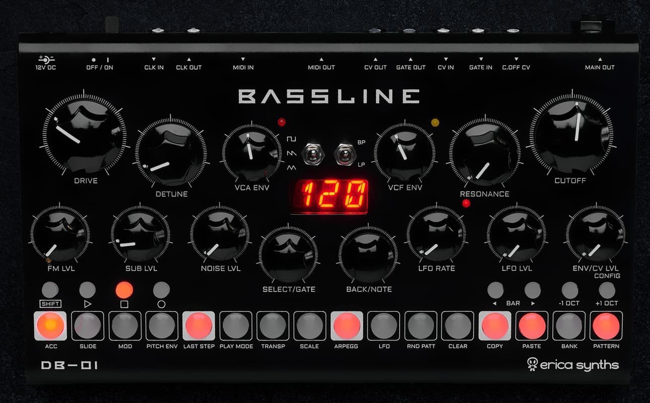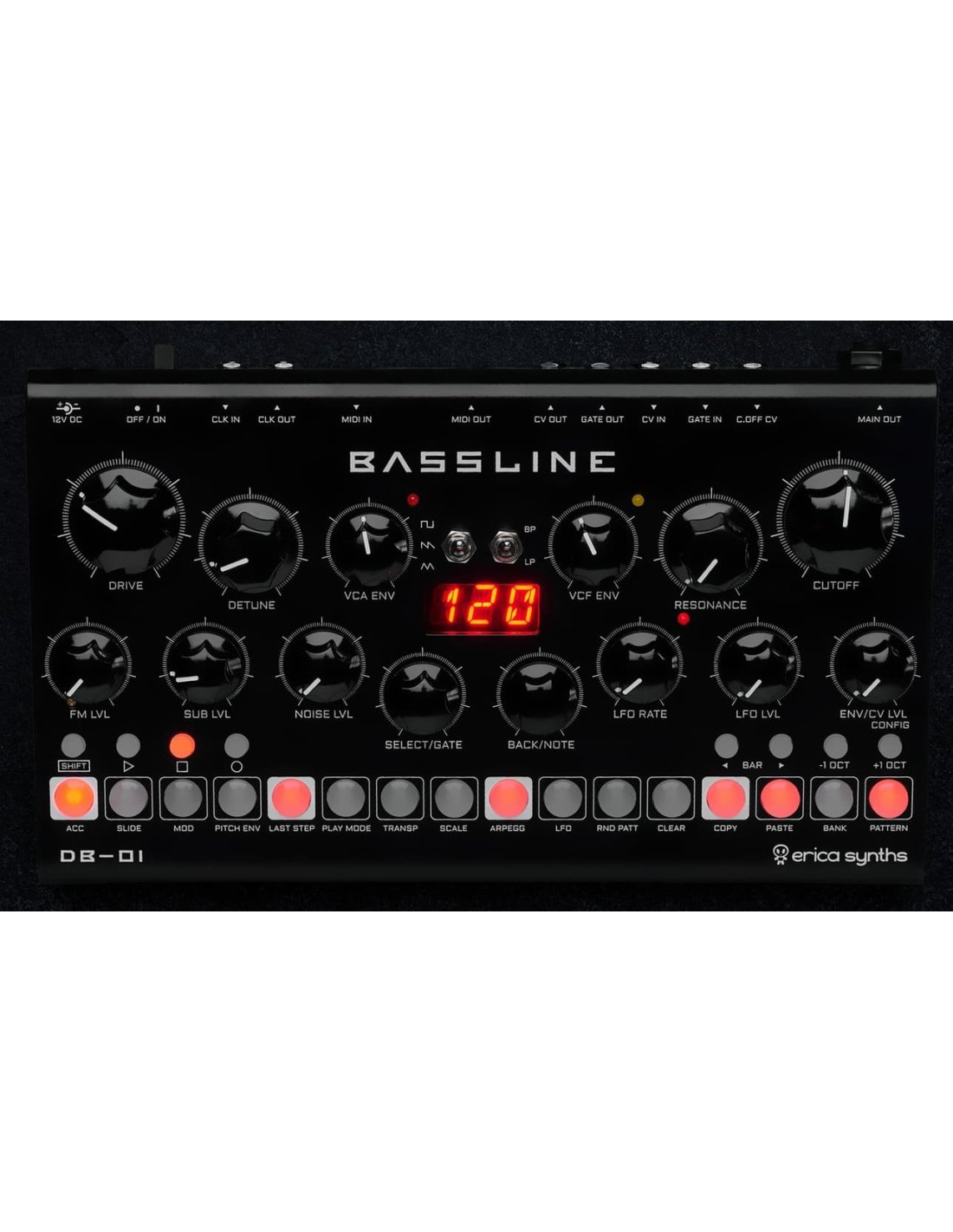 ERICA SYNTHS DESKTOP BASSLINE DB-01 è un sintetizzatore monofonico analogico progettato per creare linee di basso, con Sequencer integrato a 64 Step. Le caratteristiche tecniche includono motore sonoro analogico integrato con Oscillatore VCO AS3340 con forme d'onda a dente di sega, triangolare e ad impulsi, Filtro risonante ispirato al design del sintetizzatore Erica Synths Acidbox, Overdrive, Sub-Oscillatore basato su Transistor, Inviluppi ADSR indipendenti per il filtro, l'ampiezza e il pitch, LFO con diverse forme d'onda selezionabili. Presenta inoltre, funzione Detune BBD che emula il detune di un sintetizzatore polifonico, Sequencer integrato con 64 step per creare pattern melodici e ritmici, funzione Registrazione, funzione Quantizzazione con modalità Shuffle e Swing. Presenta connessioni MIDI I/O, CV, Clock, e uscita Main tramite Jack 6,3mm