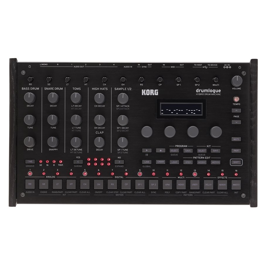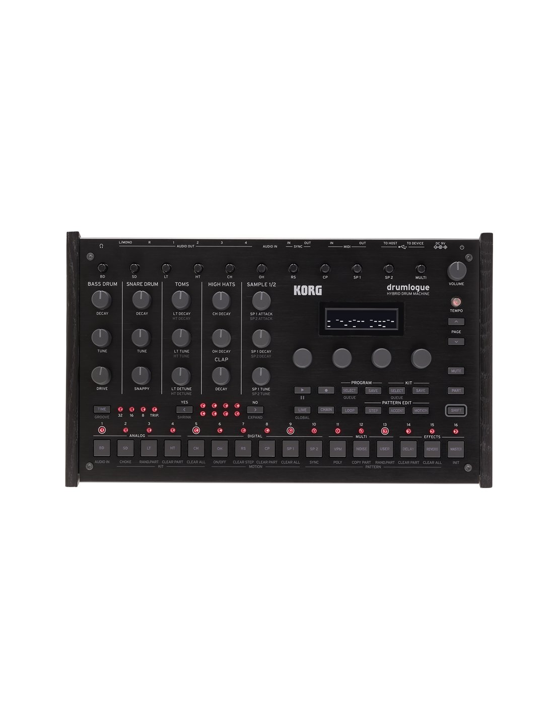 KORG DRUMLOGUE è una Drum Machine ibrida a 4 parti analogiche e 7 digitali, di cui 4 PCM, 2 User sample e una Multi-engine (Noise, VPM e User Synth), dotata di un Sequencer 64 step a 11 tracce con loop e chain. 3 sezioni effetti: riverbero e delay in mandata su ogni singola parte e Master. 6 uscite audio separate, una porta MIDI USB A per collegamento diretto di Controller USB MIDI Class Compliant; una di tipo B si collega al computer sia per l’In/Out MIDI, sia per caricare direttamente campioni audio e gli Units Plugin nella memoria interna dello strumento.