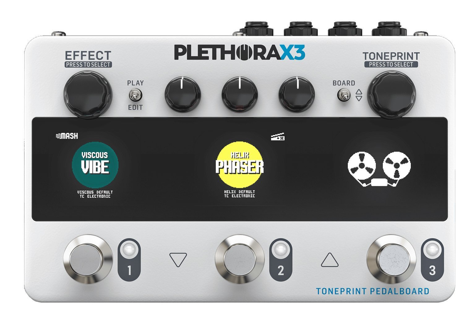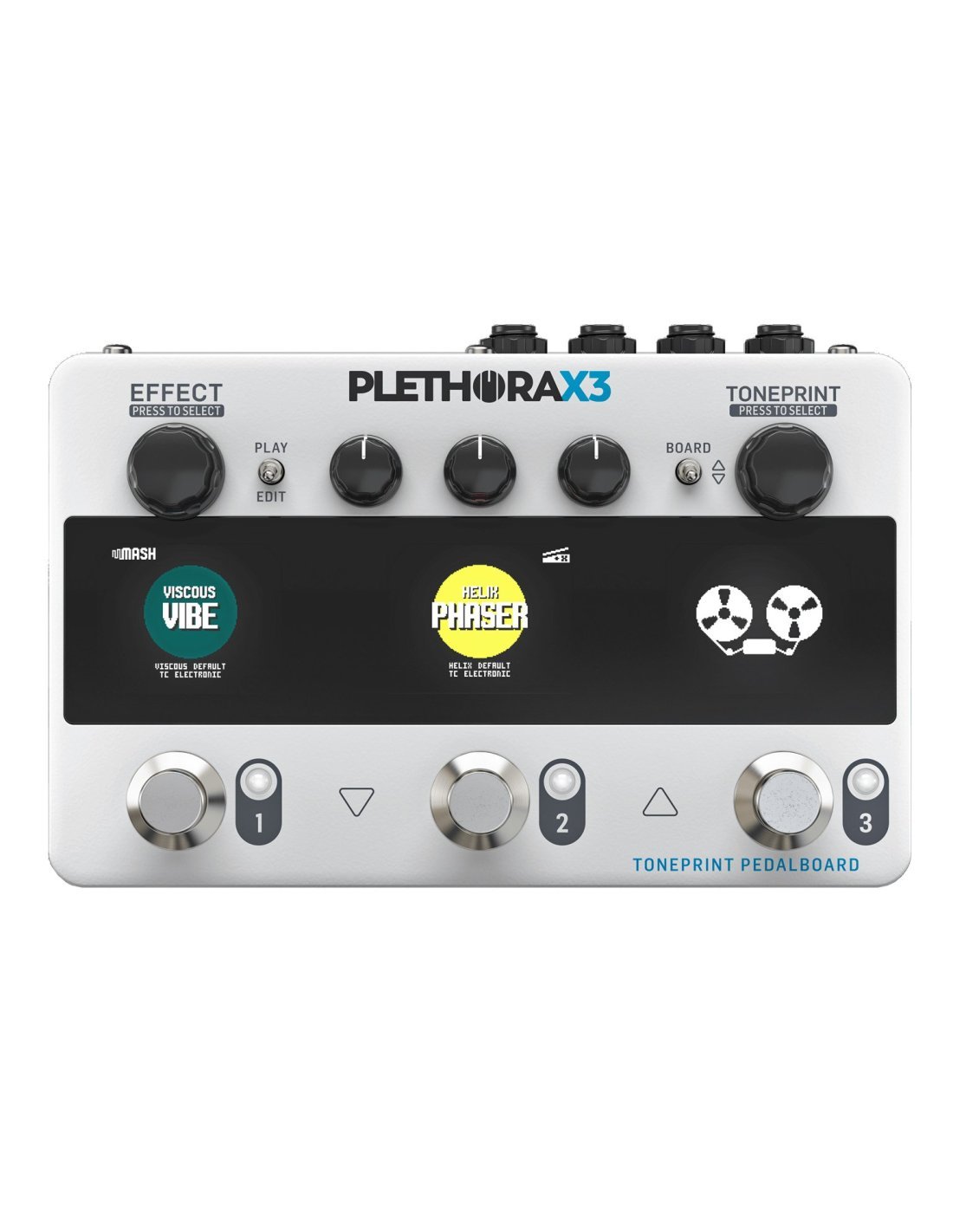 TC Electronic Plethora X3 è una pedaliera multieffetto per chitarra; si tratta della versione compatta del modello originale Plethora X5. E' composta da tre moduli in cui è possibile memorizzare 75 effetti Toneprint e richiamare, attraverso patch, fino a 127 pedaliere diverse. E' dotata di 3 footswitch Mash che reagiscono dinamicamente alla pressione del piede, due ingressi e due uscite per connessioni stereo, connettività di send-return, un accordatore cromatico monofonico e opzione cab sim ideale per suonare direttamente in un sistema PA o in un'interfaccia audio.