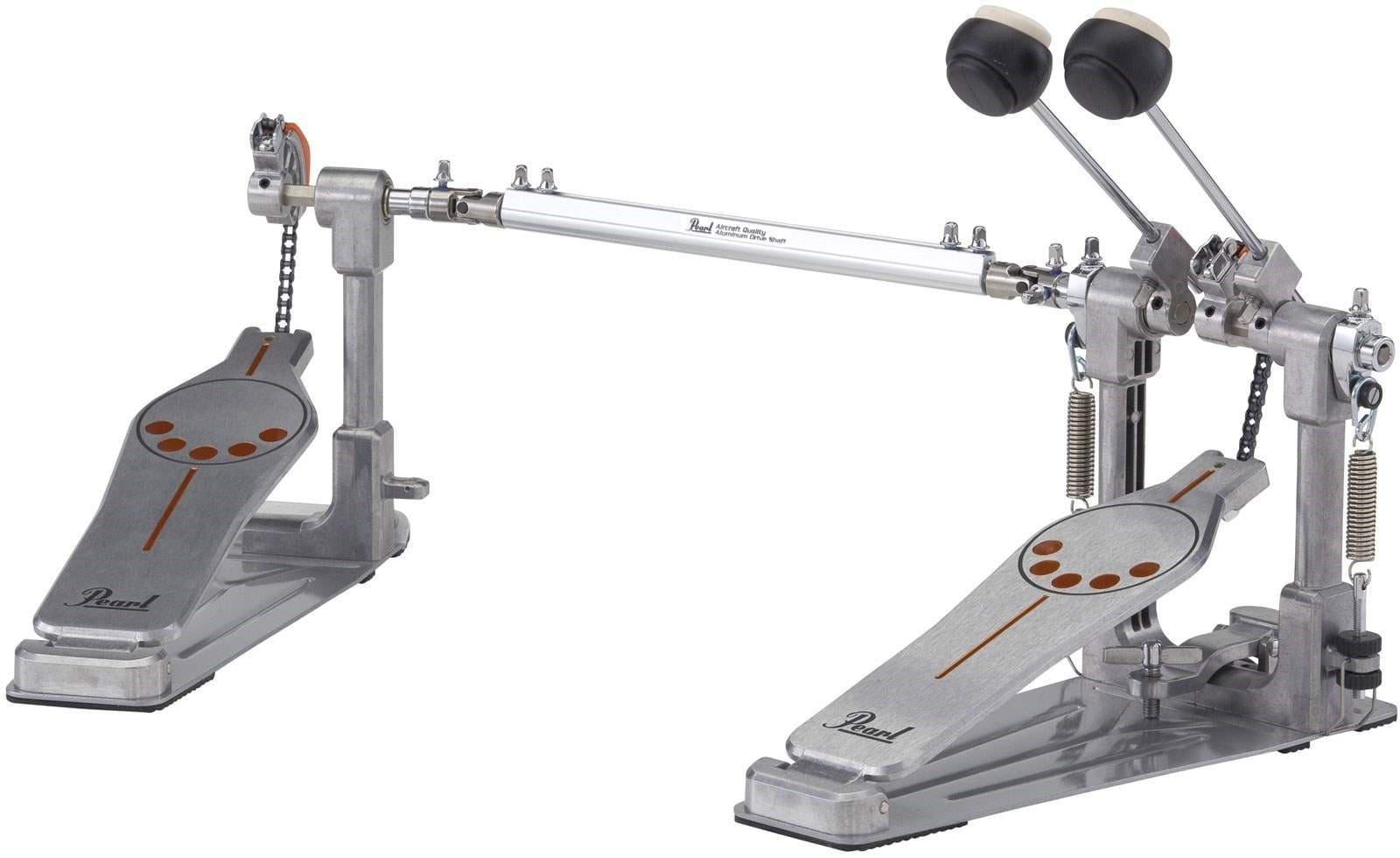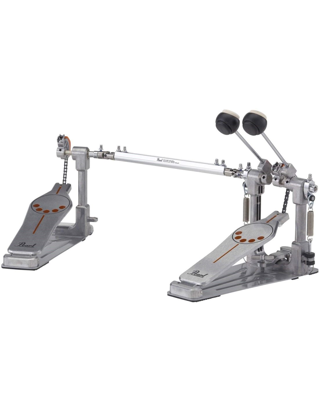 PEARL P-932 DOUBLE DRUM PEDAL. Doppio pedale serie Demonator per grancassa con trasmissione a cinghia singola, sistema di regolazione Powershifter, camma in alluminio pressofuso Eliminator-style rimovibile, regolazione dell'angolo dei battenti Uni-Lock, pedane liscie con grip, giunto trasversale a lunghezza regolabile senza latenza e battenti DuoBeater.