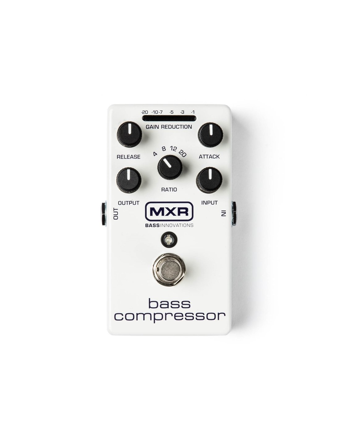 Pedale per Basso MXR M-87 Bass Compressor. L'MXR M-87 Bass Compressor è un compressore a pedale per basso true bypass basato su tecnologia CHT (Costante Headroom Technology). E’ dotato dei controlli Release, Attack, Output, Ratio, Input e di 10 LED che indicano la soglia d'intervento del compressore (da -1 a -20).
