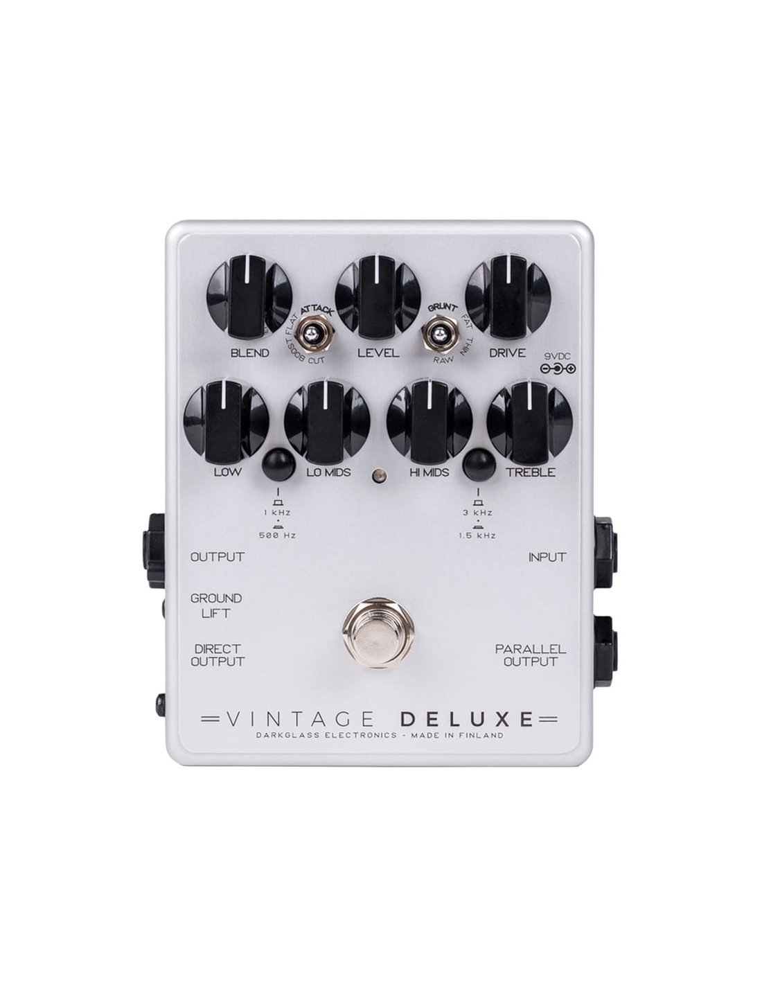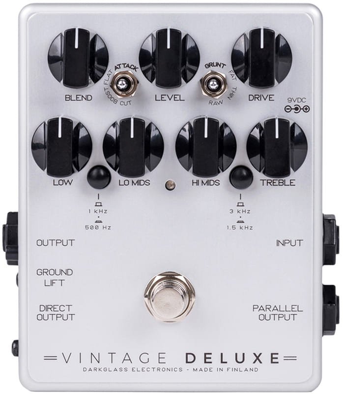 DARKGLASS VINTAGE DELUXE V3 è un pedale preamp overdrive per basso. Fornisce la risposta dinamica naturale e la compressione organica dei classici amplificatori a valvole e delle macchine a nastro. Le caratteristiche tecniche includono equalizzatore attivo a 4 bande, knob del BLEND per mixare i segnali puliti ed elaborati, LEVEL per impostare il livello di overdrive, DRIVE per incrementare l'overdrive, switch GRUNT per impostare i contenuti a bassa frequenza da saturare, switch ATTACK per impostare la quantità di alti da saturare. Inoltre tasto GROUND LIFT per disconnettere la massa sul segnale di uscita. Alimentatore 9v non incluso