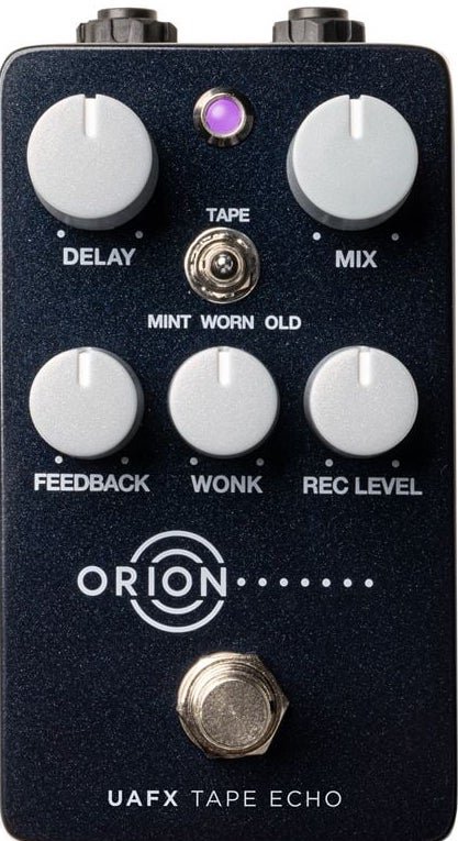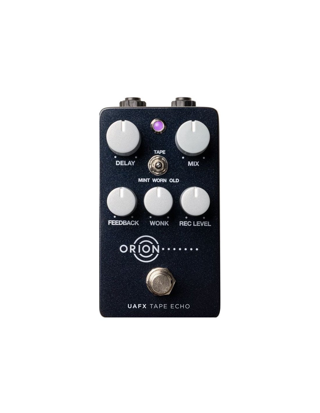 UNIVERSAL AUDIO UAFX ORION TAPE ECHO. Effetto Tape Eco a pedale per chitarra, emulazione del pedale Maestro Echoplex EP-III Vintage degli anni 70, sviluppato sugli algoritmi del pedale Universal Audio Starlight Echo Station, con 3 tipi di macchine a nastro selezionabili tramite switch: Mint, Worn e Old, comandi Delay, Mix, Feedback, Wonk e Rec level, Bypass selezionabile tra True e Trails, controlli Preamp on/off e circuito dry through analogico. Dispone di ingresso e uscita sbilanciati TS tramite jack 1/4 e uscita USB-C per aggiornamenti del firmware. Funziona con alimentatore 9v venduto separatamente.