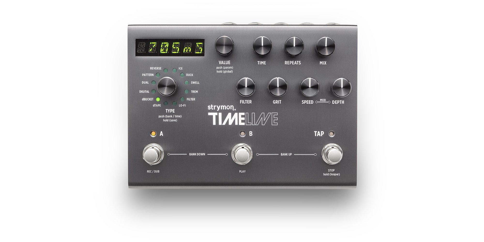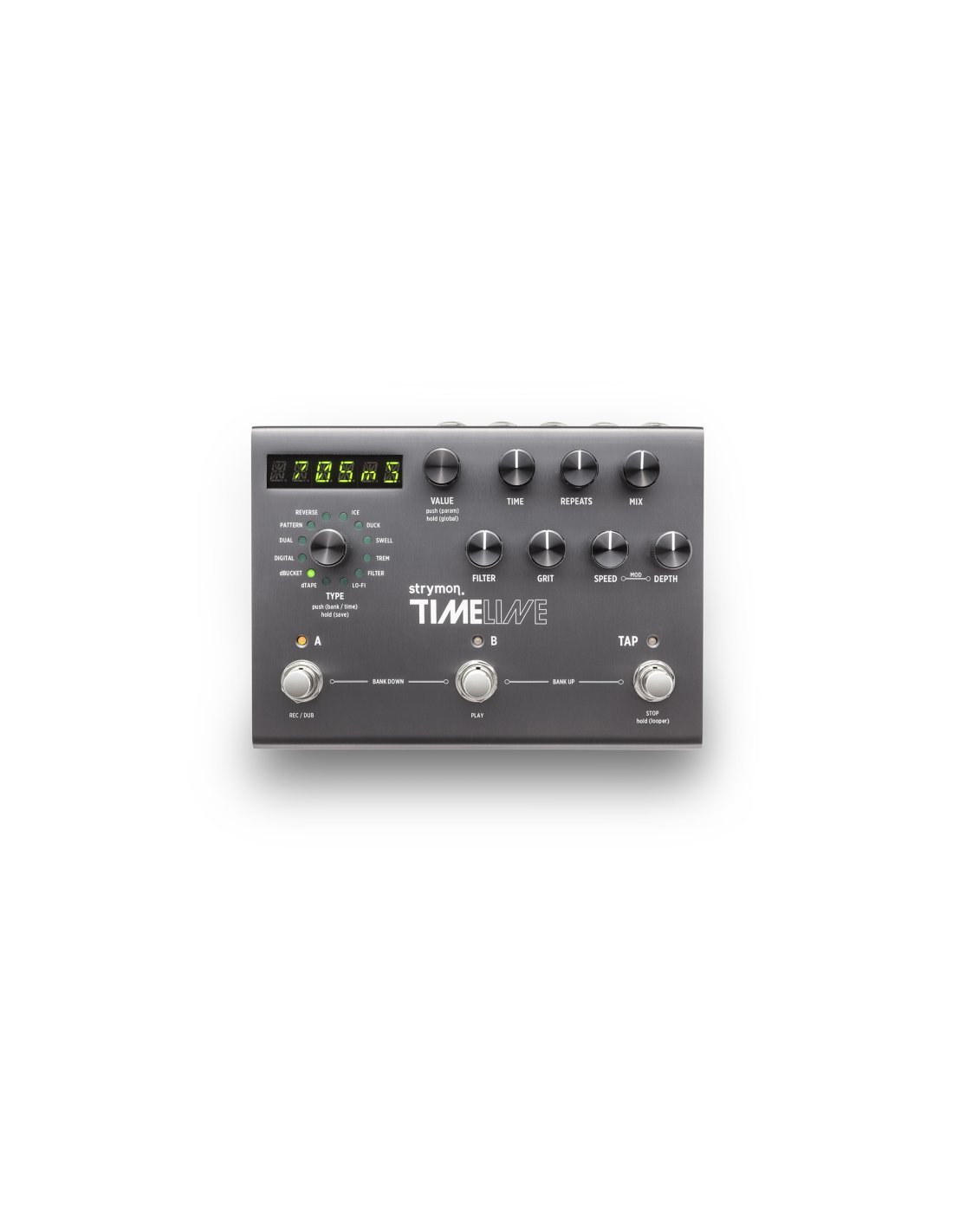 STRYMON TIMELINE è un processore di effetti Delay digitale in formato stompbox per chitarra. Le caratteristiche tecniche includono 12 macchine Delay integrate: Digital, Dual, Pattern, Reverse, Ice, Duck, Swell, Trem, Filter, Lo-Fi, dTape, dBucket, ciascuna con ampio controllo su carattere sonoro e atmosfera, 7 controlli con encoder dedicati: Time, Repeats, Mix, Filter, Grit, Mod Speed, Mod Depth, 200 preset utente integrati richiamabili e memorizzabili, implementazione MIDI completa, percorso del segnale interamente analogico, Looper fino a 30 secondi pre/post delay con funzionalità MIDI, conversione del segnale 24-bit/ 96kHz, Boost/Cut +/- 3dB memorizzabile per ogni preset,. Presenta inoltre ingressi ed uscite stereo, ingresso pedale di espressione, MIDI Input & Output