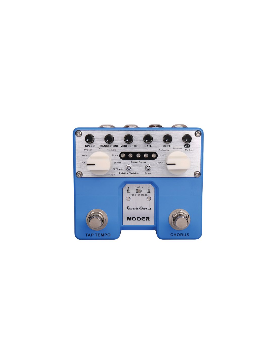 Pedale per Chitarra Mooer Reverie Chorus. Il Mooer Reverie Chorus è un chorus digitale a pedale per chitarra della Twin Series con chip DSP di alta qualità. Dispone di 5 tipi di chorus (Chorus/Rotary/Ambiance/Shimmer/Multiple), 5 tipologie di modulazione (Wah/Phaser/Talk/Tremolo/Stutter/St.Wah/St.Phaser/Tr.Talk), funzione Tap Tempo. E’ dotato dei controlli Speed, Range/Tone, Mod Depth, Rate, Depth, Mix, dello switch Store per memorizzare 5 preset preferiti, dello switch Relation/Variable, di ingressi e uscite stereo. Due interruttori a pedale consentono di attivare il chorus e il tap tempo.