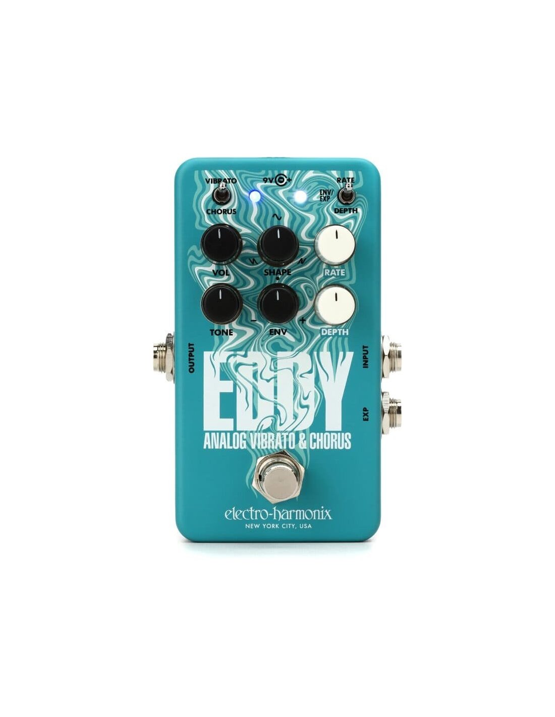 ELECTRO HARMONIX EDDY ANALOG VIBRATO è un pedale Vibrato/Chorus analogico per chitarra. Le caratteristiche tecniche includono selettore a switch Vibrato/Chorus, Switch Rate/Depth, controlli Volume, Shape, Rate, Tone, Envelope e Depth per modellare l'effetto selezionato. Dotato di 2 led, uno bianco statico che indica l'effetto attivo e uno Blu stroboscopico che indica velocità e forma dell'effetto. Fornito di alimentatore EHX 9.6DC 200mA standard.