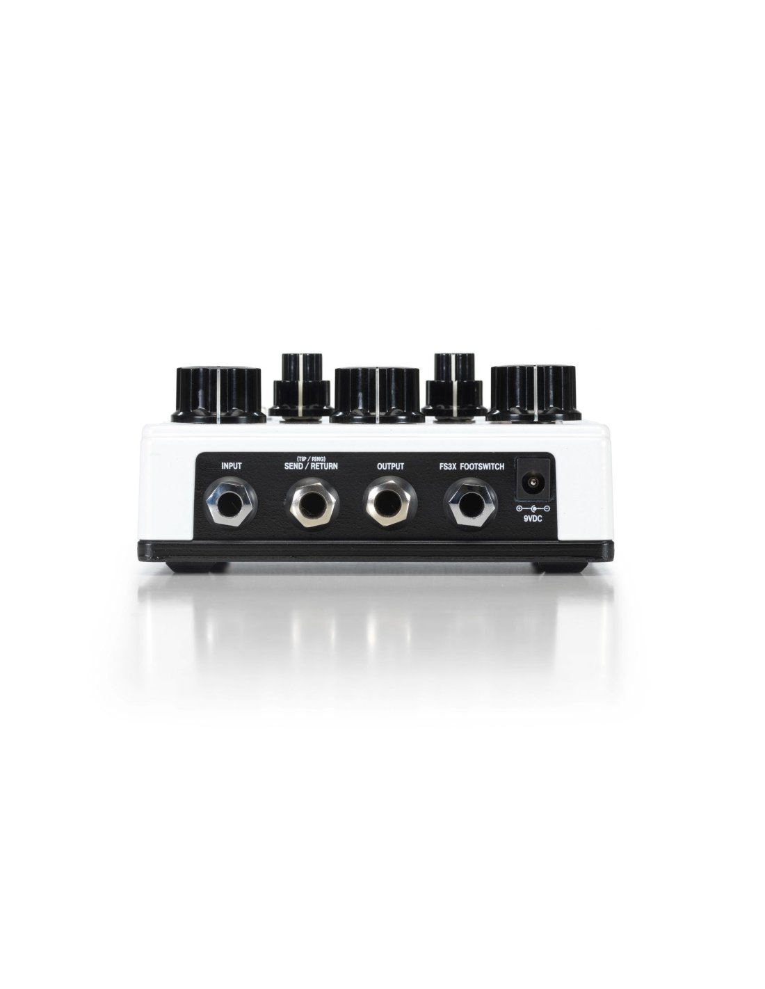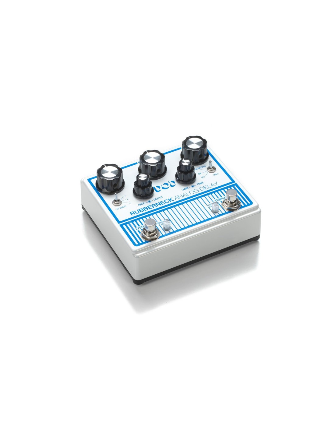 DOD RUBBERNECK è un delay analogico a pedale per chitarra. Le caratteristiche tecniche includono controlli Time, Repeats e level, Tap tempo con switch di selezione Tap Ratio, funzioni Delay Tails e Dry signal, footswitch Tap/regen per controllare rispettivamente il tap tempo e il controllo remoto del pedale, loop send/return per collegare altri effetti in catena. Dotato di In/Out, Send return e footswitch tramite connettori jack 1/4".