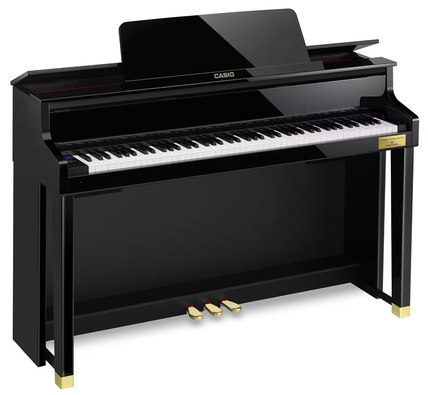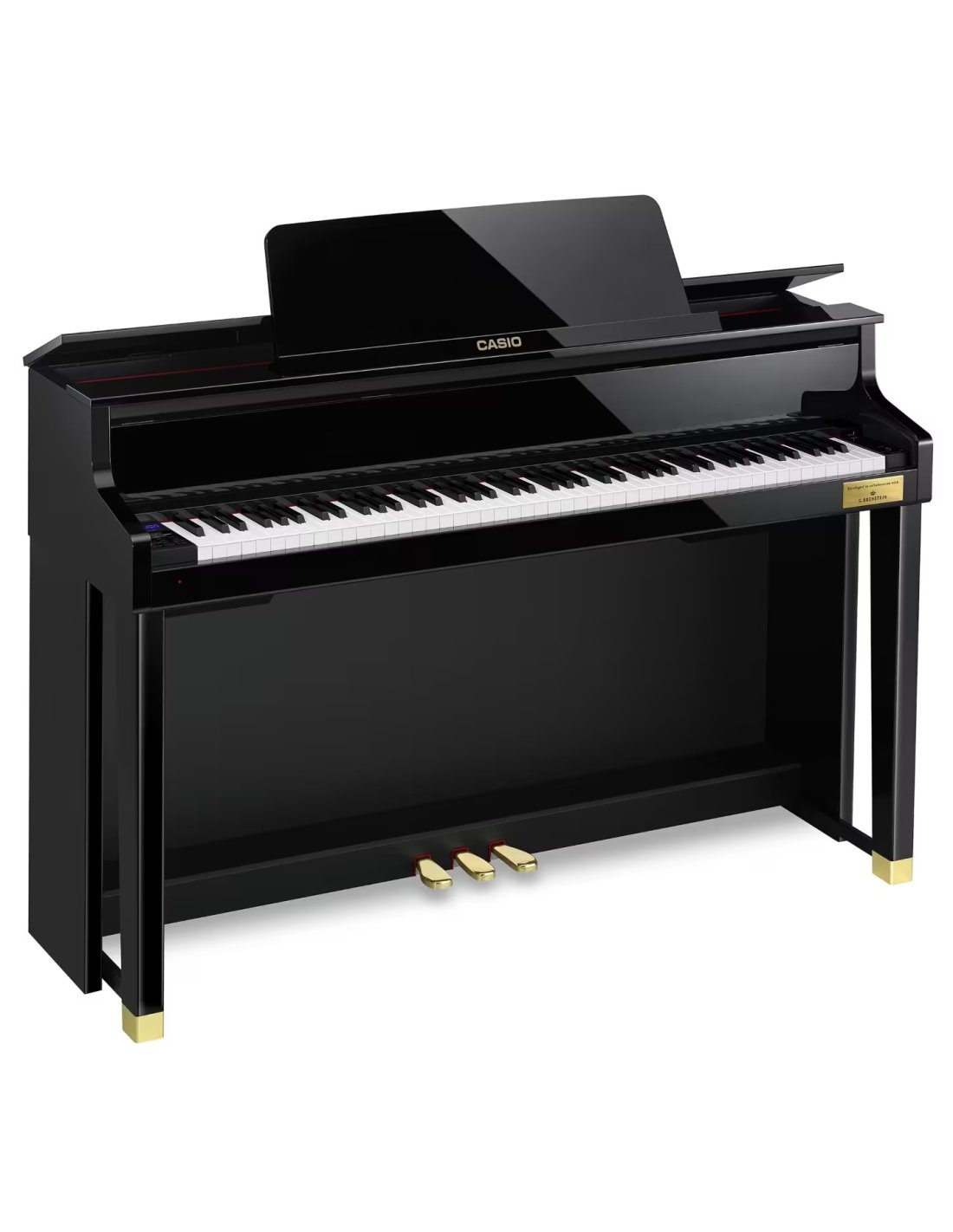 CASIO GP 510 BK è pianoforte digitale a struttura "verticale", modello di punta della serie CELVIANO Grand Hybrid sviluppato in collaborazione con C. Bechstein, con 88 tasti pesati e suoni e risonanze di un pianoforte acustico, grazie alla tecnologia avanzata CASIO. Le caratteristiche tecniche includono, 88 tasti pesati in abete rosso Natural Grand Hammer Action Keyboard con Tri-Sensor, per replicare la risposta e il feel di un pianoforte acustico, sistema di amplificazione a 6 altoparlanti Grand Acoustic System per una riproduzione sonora tridimensionale, funzione "scene" che consente di salvare e richiamare impostazioni importanti come la selezione del suono, split/layer, effetti concert hall e altro, 3 suoni di pianoforti "AiR Grand Sound Source" selezionabili: Berlin, Hamburg e Vienna Grand, risposta al tocco a 5 livelli di sensibilità, polifonia di 256 voci, 35 timbri di suono, 60 brani integrati, funzione lezione, registratore MIDI a 2 tracce e Audio per circa 99 brani, pedale Grand Pedal System, risposta del martelletto a 10 livelli, simulatore rilascio del tasto risonanza delle corde a 10 livelli, risonanza damper a 10 livelli, risonanza delle corde aperte a 10 livelli, risonanza aliquot a 10 livelli, rumore damper a 10 livelli, rumore azionamento pedale a 10 livelli, rumore attivazione tasto a 10 livelli, rumore rilascio tasto a 10 livelli, simulatore coperchio a 4 tipi. Presenta connessioni Line In su jack 6,3mm L (mono)/R, Line Out su jack 6,3mm L (mono)/R, 2 porte USB A/B, implementazione MIDI e 2 uscite cuffie su jack stereo standard.