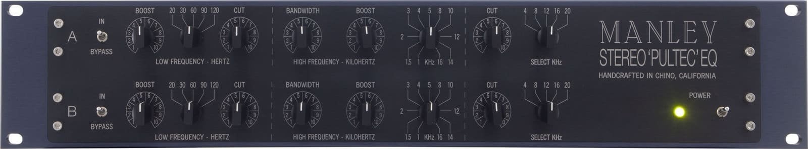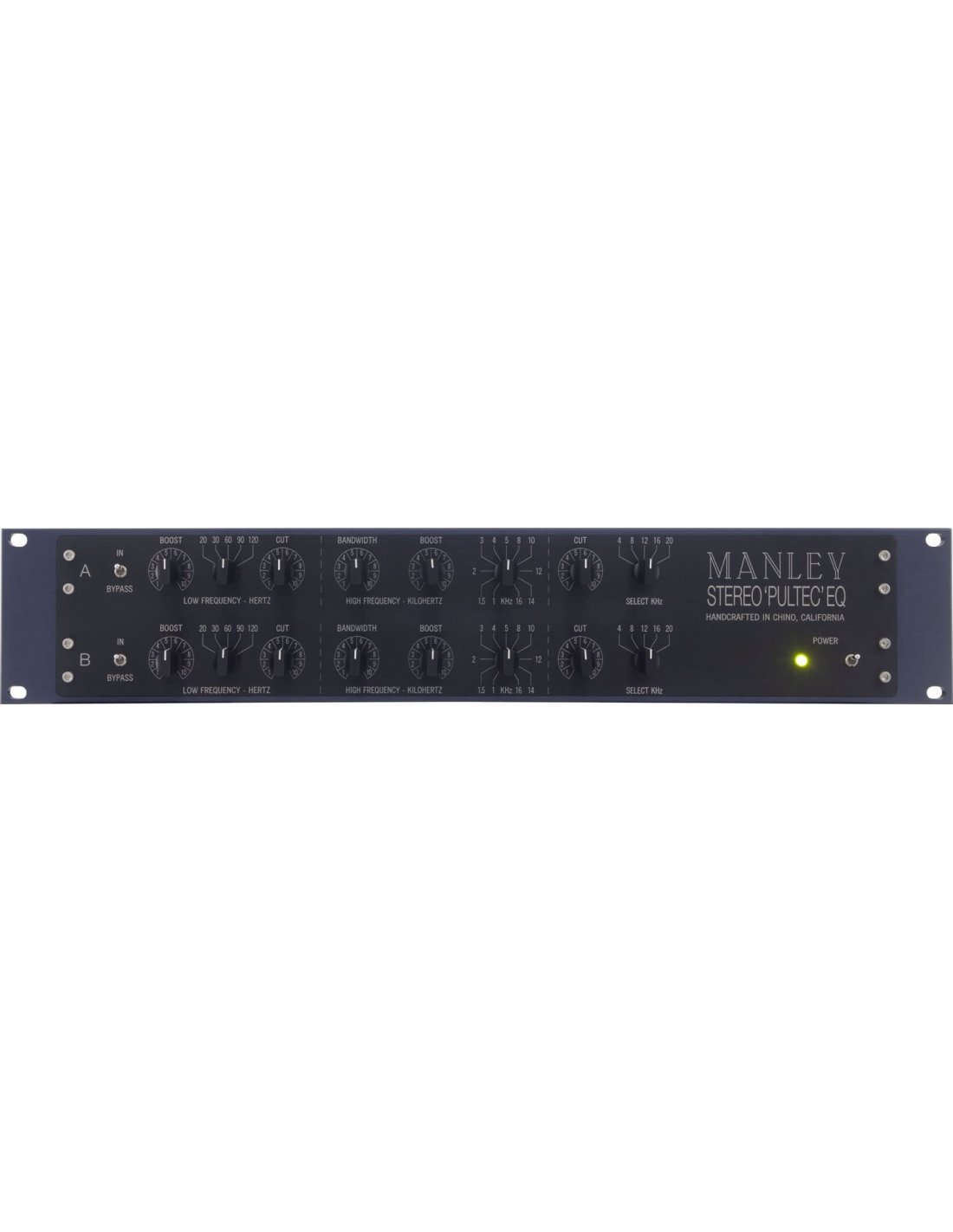 MANLEY STEREO PULTEC EQ è un equalizzatore a rack stereo a 2 canali. Le caratteristiche tecniche includono trasformatore di ingresso MANLEY con lamierini in nichel alloggiati in case in mu-metal, ingresso 3K Ohm Z, interruttore PHASE REVERSE per ingresso XLR bilanciato, ingresso alternativo senza trasformatore 1/4″ HI-Z (5K Ohm), interruttore BYPASS e AUTO-MUTE con warmup delay, controlli Boost/Cut, interruttori di selezione della frequenza Greyhill, valvole 1 x 12AX7WA (Gain) e 1 x 6414 (o 5965) white follower, uscite XLR bilanciate accoppiate a trasformatore MANLEY 9611, risposta in frequenza piatta da 10Hz-70KHz <0,01% THD @ 1Khz.