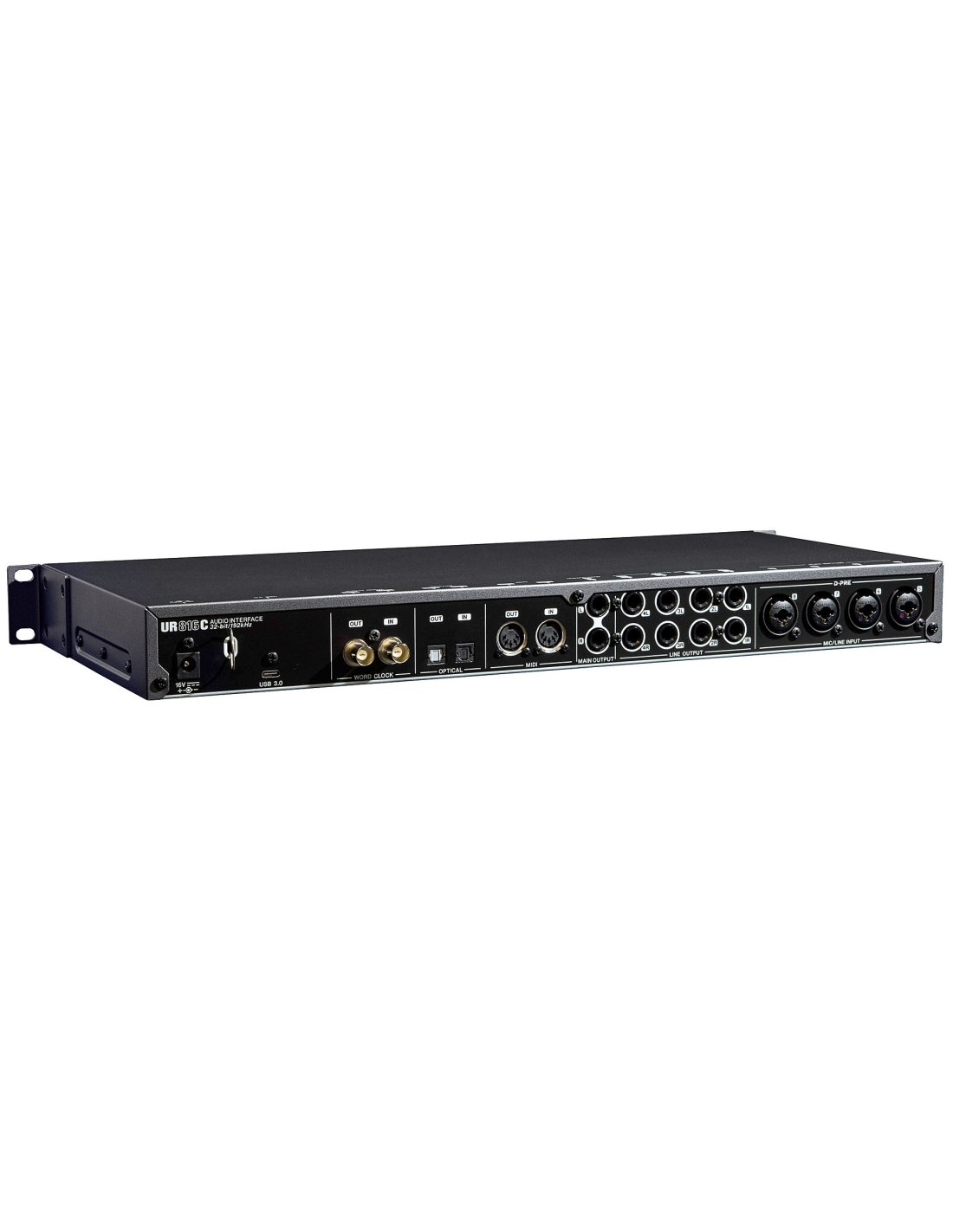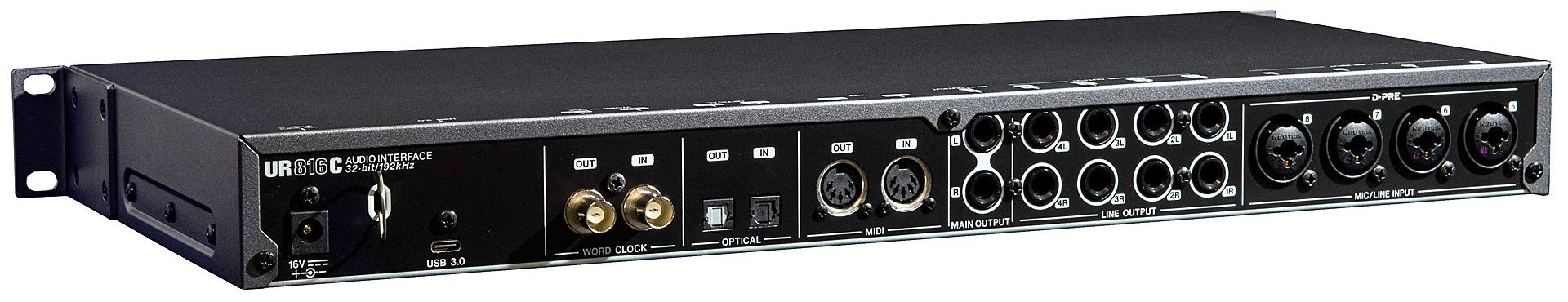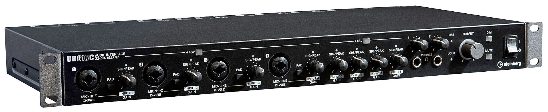 STEINBERG UR816C. Interfaccia audio USB 8-in/8-out con 8 ingressi microfonici combo XLR/TRS (4 frontali e 4 posteriori) e preamp microfonici D-PRE di classe A con alimentazione phantom +48v, manopole per input dedicate per canale, switch Dim e Mute, Pad di attenuazione su ogni canale, I/O ottici ADAT e MIDI, Word clock dotato della tecnologia SSPLL per la riduzione del jitter del clock, manopola per regolazione Mix, 2 ingressi cuffie tramite jack con 2 controlli del livello dedicati, comando gestione volume output, led peak e per stato phantom. Sul pannello posteriore presenta uscite monitor TRS L/R dedicate per canale e uscita main TRS, implementazione MIDI In/Out, Optical In/Out e Word clock In/Out, slot USB 3.0. Include download gratuiti di software Cubase AI e Cubasis LE e kit di montaggio a rack.