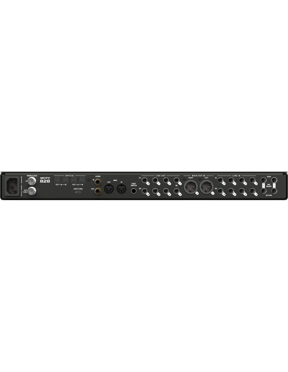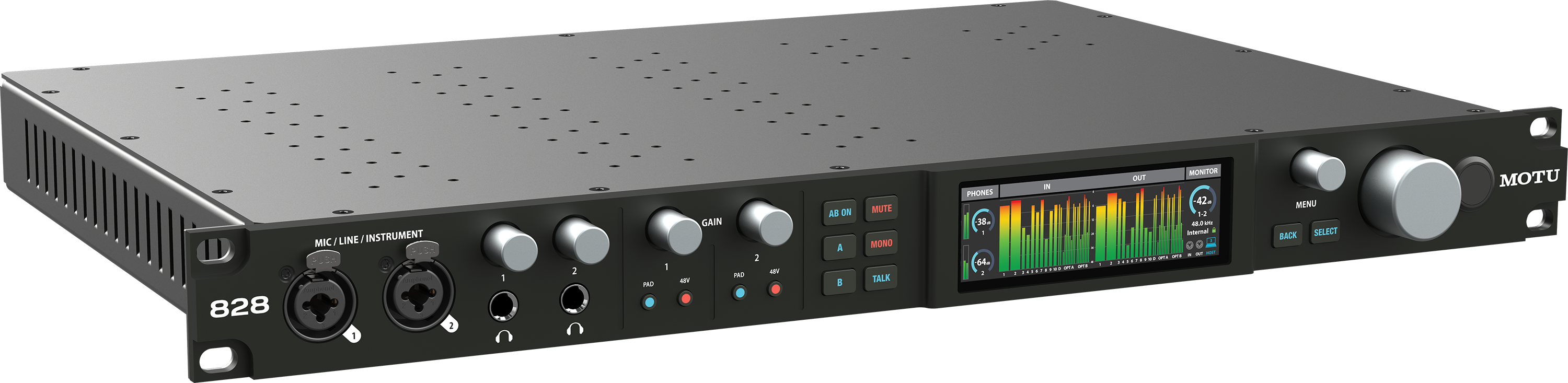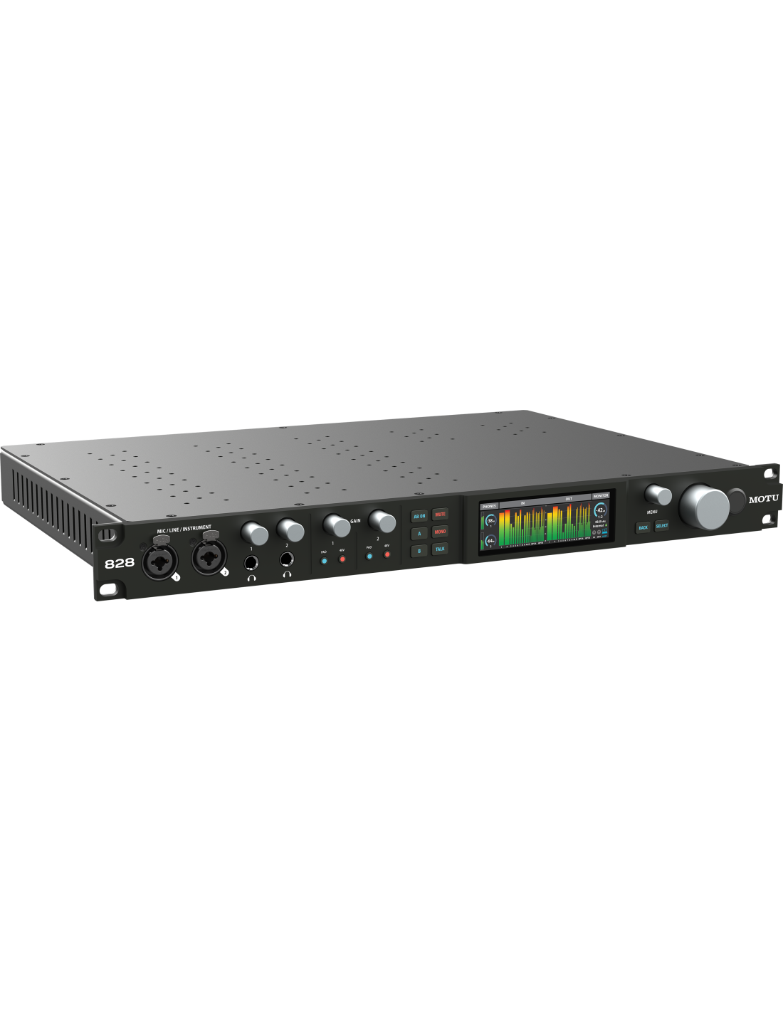 MOTU 828 è un'interfaccia audio dotata di 28 input e 32 output con connettività USB-3, compatibile con dispositivi Windows e Ios. Le caratteristiche tecniche includono display TFT da 3.9" per il controllo di tutti gli I/O sia analogici che digitali grazie alla visualizzazione LCD RGB a 24 bit con una risoluzione di 480 x 128 pixel, tecnologia DAC ESS Sabre32 che offre una gamma dinamica di 125 Db e supporta tutte le frequenze di campionamento fino a 192 kHz, connettività USB3 da 5 Gbps. Presenta 60 canali audio simultanei di cui 28 input e 32 output: 2x ingressi combo XLR/TRS mic/line/ hi-Z con insert send/return, 8x ingressi/uscite analogici tramite jack 6,3mm TRS, uscite principali separate su jack TRS ed XLR, 2 banchi di I/O ottici a 8 canali ciascuno, I/O digitali stereo RCA S/PDIF e 2 uscite per monitoraggio tramite cuffie. I canali microfonici presentano controlli individuali per +74 dB di guadagno del preamp, pad -20 dB e alimentazione phantom +48V. Il mixer digitale integrato presenta DSP di effetti digitali tra i quali riverbero, EQ a 4 bande, Gate e Compressori. Presenta inoltre connettività WIFI per l'utilizzo da remoto su Pc o Mac tramite l'app CueMix 5 e include il pacchetto Ableton Live Lite.