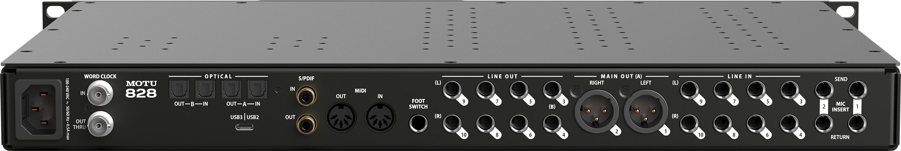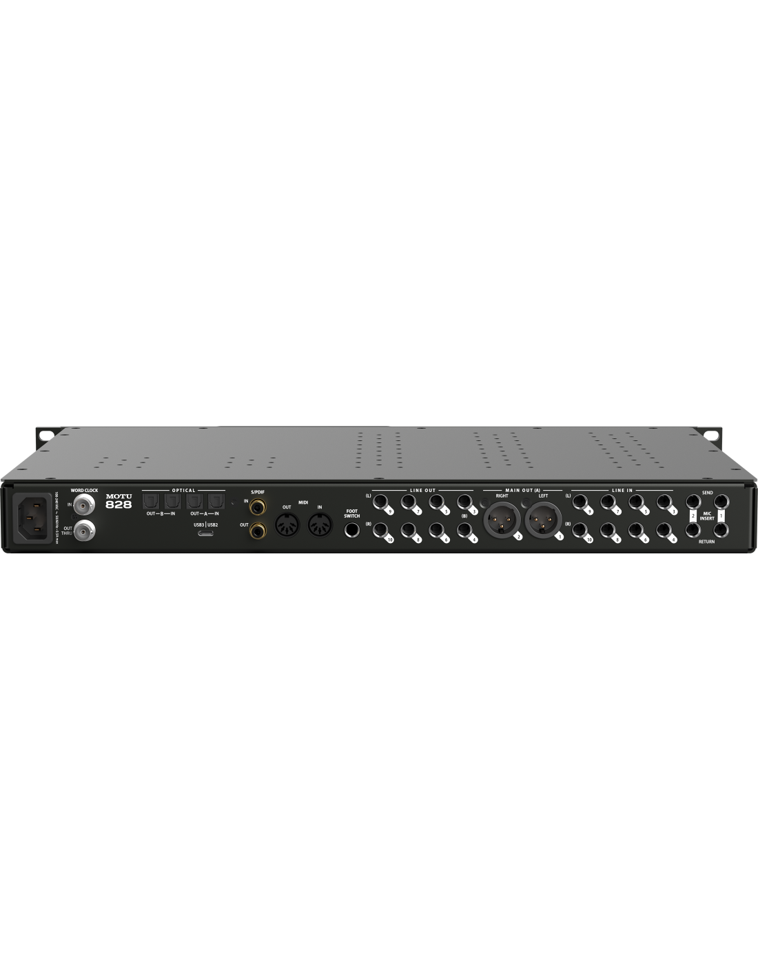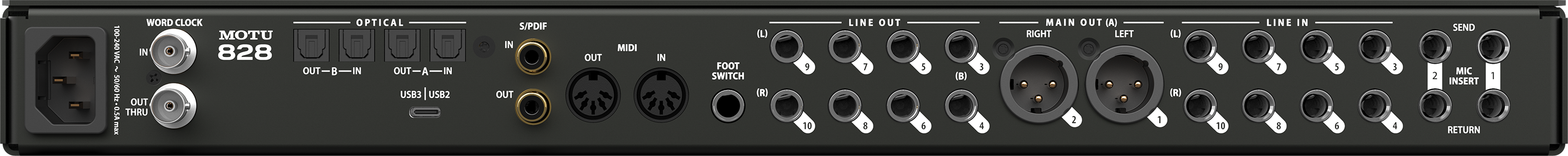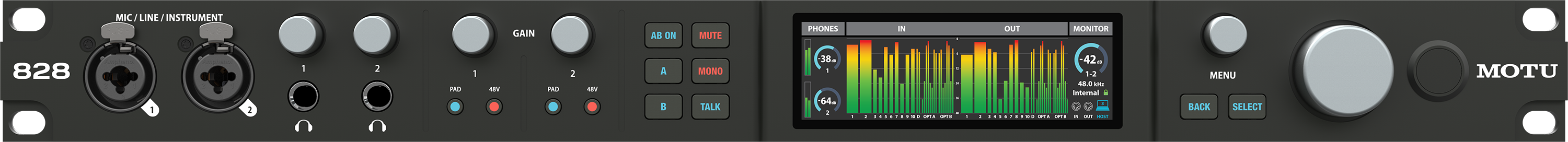 MOTU 828 è un'interfaccia audio dotata di 28 input e 32 output con connettività USB-3, compatibile con dispositivi Windows e Ios. Le caratteristiche tecniche includono display TFT da 3.9" per il controllo di tutti gli I/O sia analogici che digitali grazie alla visualizzazione LCD RGB a 24 bit con una risoluzione di 480 x 128 pixel, tecnologia DAC ESS Sabre32 che offre una gamma dinamica di 125 Db e supporta tutte le frequenze di campionamento fino a 192 kHz, connettività USB3 da 5 Gbps. Presenta 60 canali audio simultanei di cui 28 input e 32 output: 2x ingressi combo XLR/TRS mic/line/ hi-Z con insert send/return, 8x ingressi/uscite analogici tramite jack 6,3mm TRS, uscite principali separate su jack TRS ed XLR, 2 banchi di I/O ottici a 8 canali ciascuno, I/O digitali stereo RCA S/PDIF e 2 uscite per monitoraggio tramite cuffie. I canali microfonici presentano controlli individuali per +74 dB di guadagno del preamp, pad -20 dB e alimentazione phantom +48V. Il mixer digitale integrato presenta DSP di effetti digitali tra i quali riverbero, EQ a 4 bande, Gate e Compressori. Presenta inoltre connettività WIFI per l'utilizzo da remoto su Pc o Mac tramite l'app CueMix 5 e include il pacchetto Ableton Live Lite.