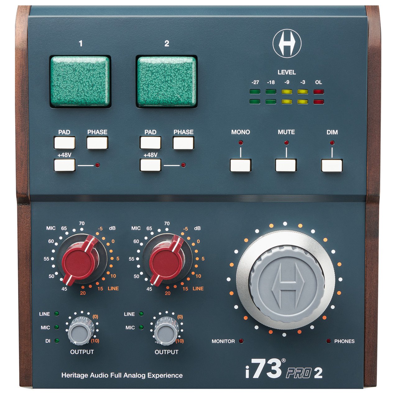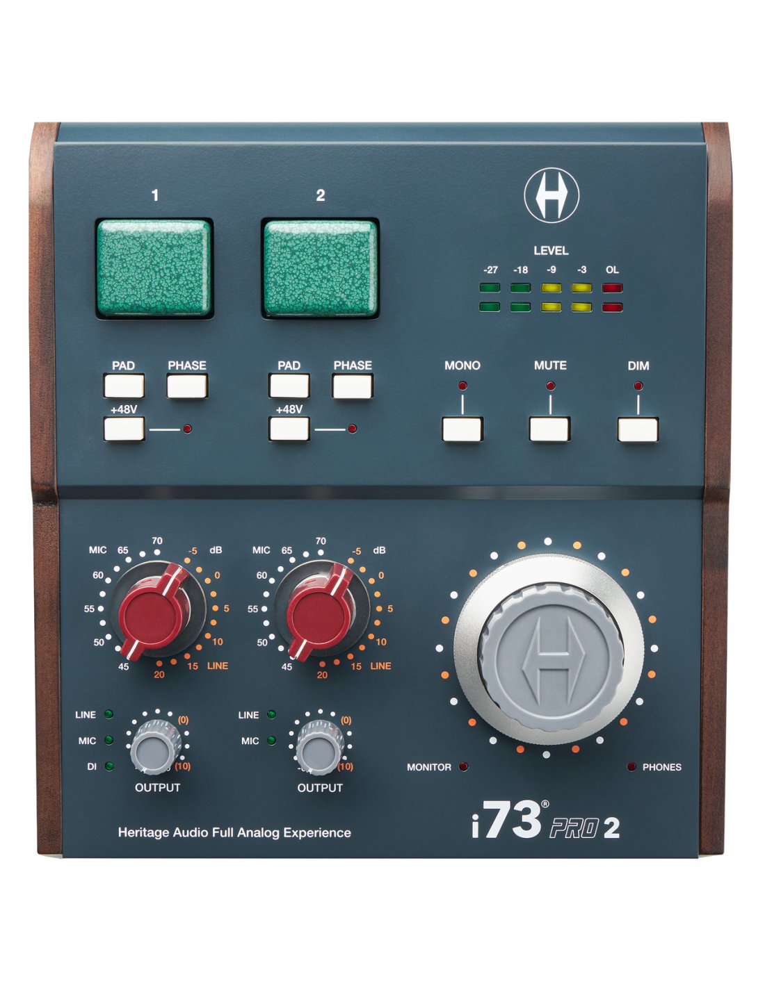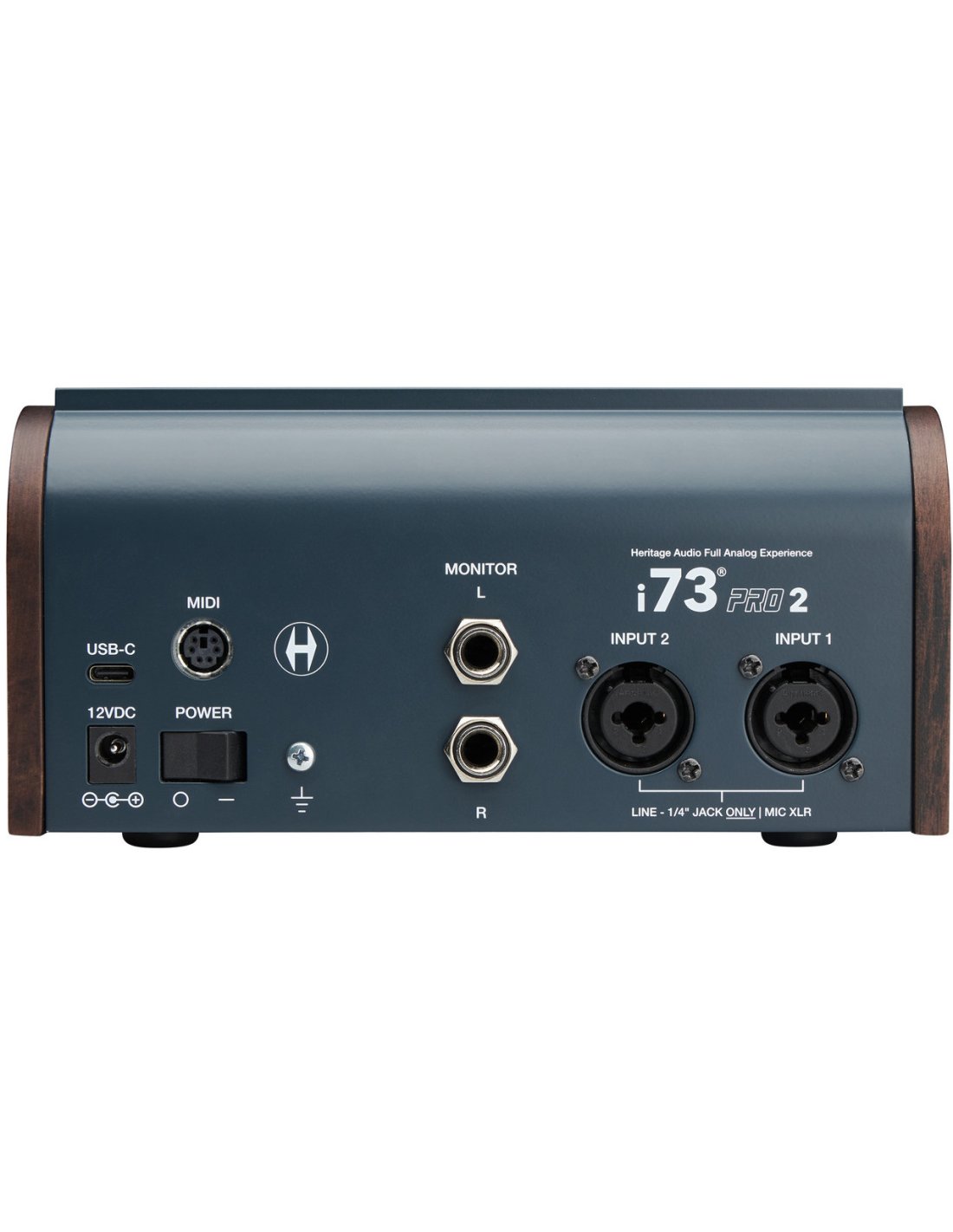 HERITAGE AUDIO i73 PRO 2 è un'interfaccia audio USB a 2 In e 4 Out con trasformatore integrato in classe A e preamplificatore stile 73. Le caratteristiche tecniche includono ingresso audio DI JFET per strumenti HI-Z tramite jack 6,3mm, 2 ingressi MIC con preamplificatore microfonico e connettori combo XLR/TRS con 70dB di guadagno, uscita monitor stereo analogico su TRS controllata in modo indipendente, uscita cuffie stereo TRS con Cue dedicato, 32 bit/192 kHz di risoluzione, doppi controlli Gain per gli ingressi MIC, controlli di uscita per gli altri 2 ingressi, encoder generale di controllo uscita Monitor, alimentazioni PHANTOM +48V, PAD e FASE selezionabili tramite tasti dedicati, tasti MONO, MUTE e DIM. Presenta implementazione Mini-DIN MIDI IN/OUT, porta USB-C per il collegamento al computer.