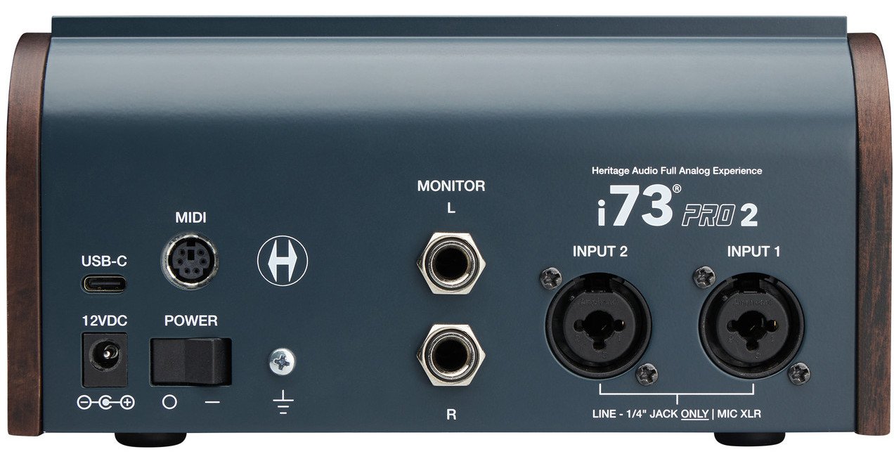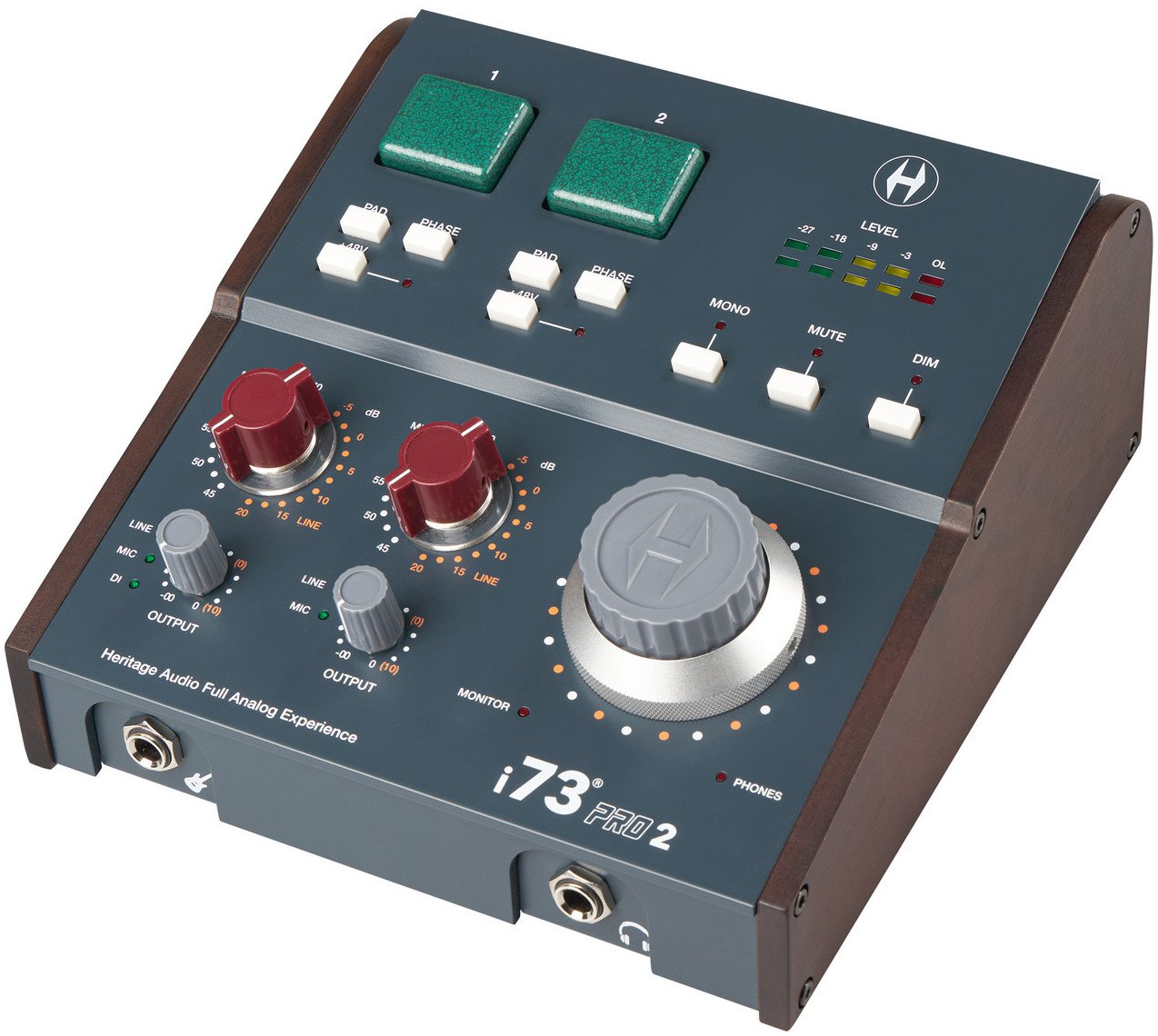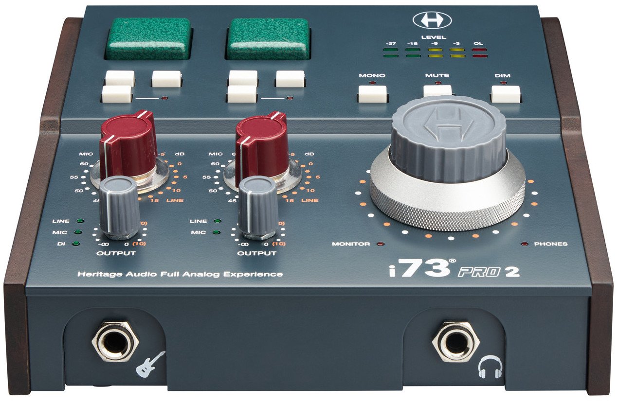 HERITAGE AUDIO i73 PRO 2 è un'interfaccia audio USB a 2 In e 4 Out con trasformatore integrato in classe A e preamplificatore stile 73. Le caratteristiche tecniche includono ingresso audio DI JFET per strumenti HI-Z tramite jack 6,3mm, 2 ingressi MIC con preamplificatore microfonico e connettori combo XLR/TRS con 70dB di guadagno, uscita monitor stereo analogico su TRS controllata in modo indipendente, uscita cuffie stereo TRS con Cue dedicato, 32 bit/192 kHz di risoluzione, doppi controlli Gain per gli ingressi MIC, controlli di uscita per gli altri 2 ingressi, encoder generale di controllo uscita Monitor, alimentazioni PHANTOM +48V, PAD e FASE selezionabili tramite tasti dedicati, tasti MONO, MUTE e DIM. Presenta implementazione Mini-DIN MIDI IN/OUT, porta USB-C per il collegamento al computer.