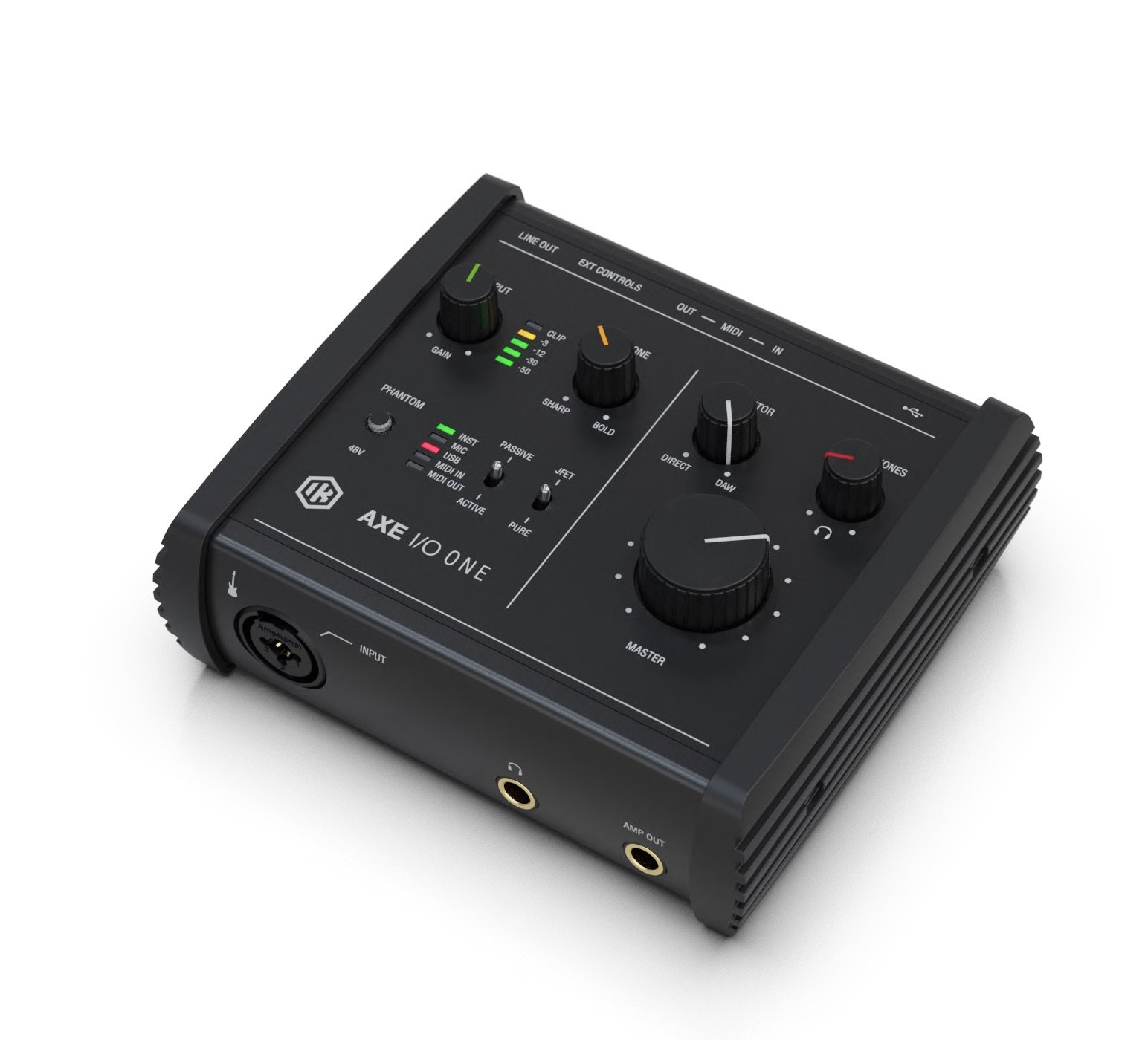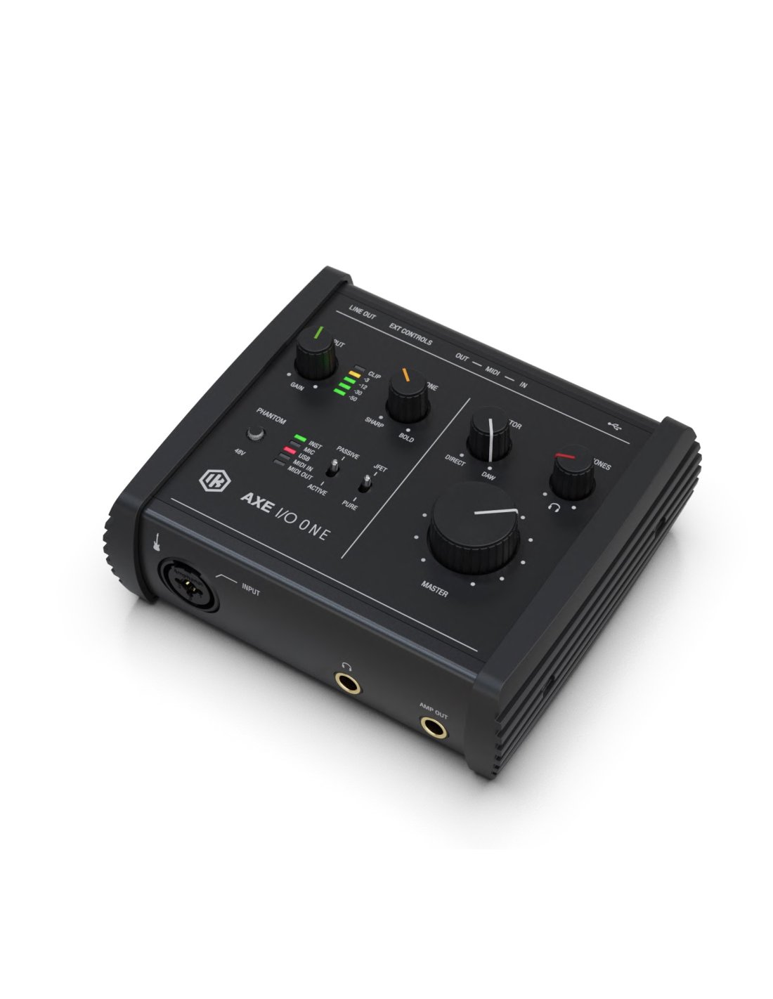 IK MULTIMEDIA AXE I/O ONE è un'interfaccia audio USB 1 in e 3 out con Preamp in classe A, frequenza massima di campionamento 24 bit/192Khz, risposta in frequenza da 3Hz a 35KHz, ingresso Z-Tone® ad impedenza adattiva chitarra/basso, selettore per chitarra attiva/passiva, selettore input PURE e JFET, Amp Out, MIDI in e out, 2 ingressi configurabili per footswitch. AmpliTube 5 SE, TONEX SE, and AbletonLive Lite inclusi
