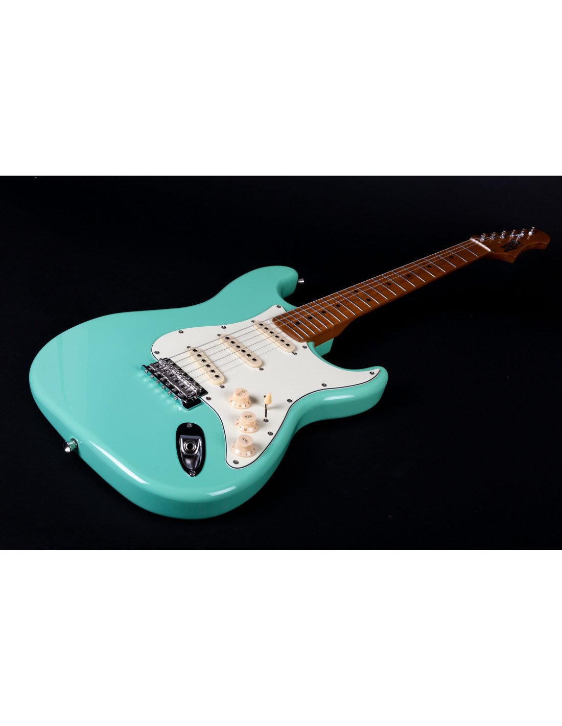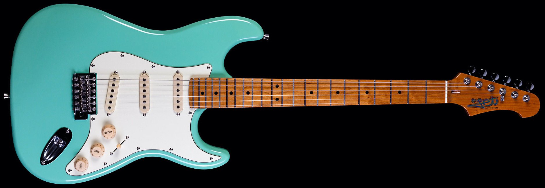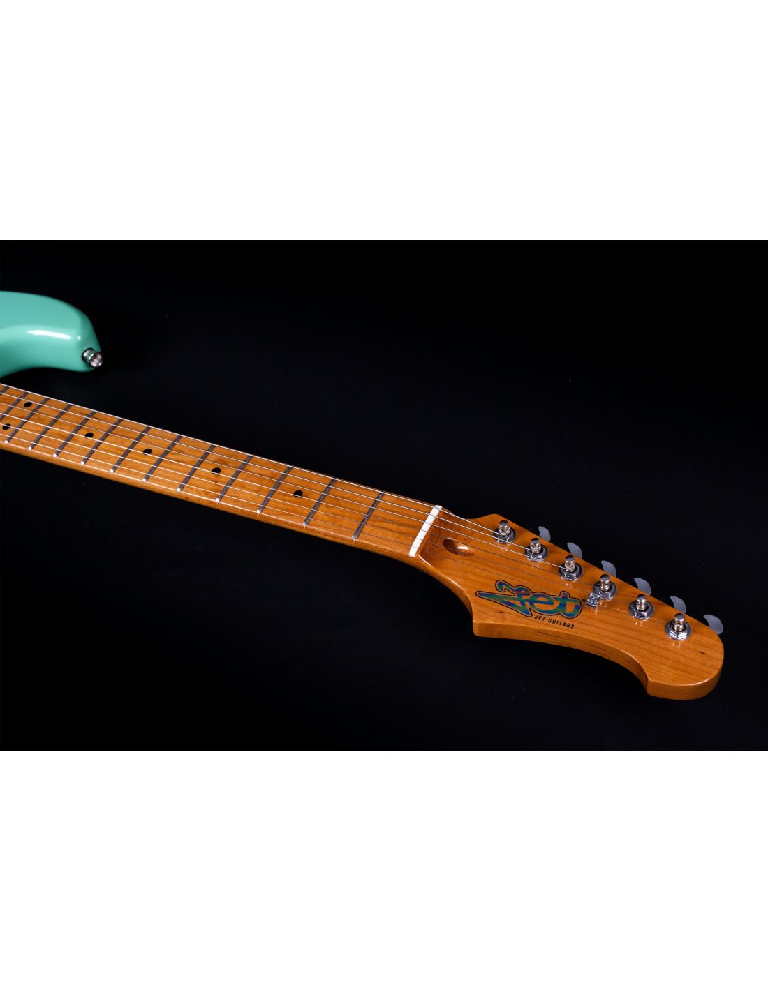 JET JS-300 SFG SSS SEAFOAM GREEN ROASTED MAPLE. Chitarra elettrica JET JS-300 SFG SSS con corpo in Tiglio, manico in acero canadese con profilo a "C", tastiera in Acero Roasted a raggio 9,5" con 22 tasti, intarsi Dot neri e finitura Seafoam Green. L'elettronica a configurazione SSS è dotata di 3 pickup Single Coil ceramici con controlli Master Volume, 2 Master Tone e switch a 5vie. Presenta inoltre ponte tremolo, Trussrod a doppia azione, meccaniche e hardware cromati.