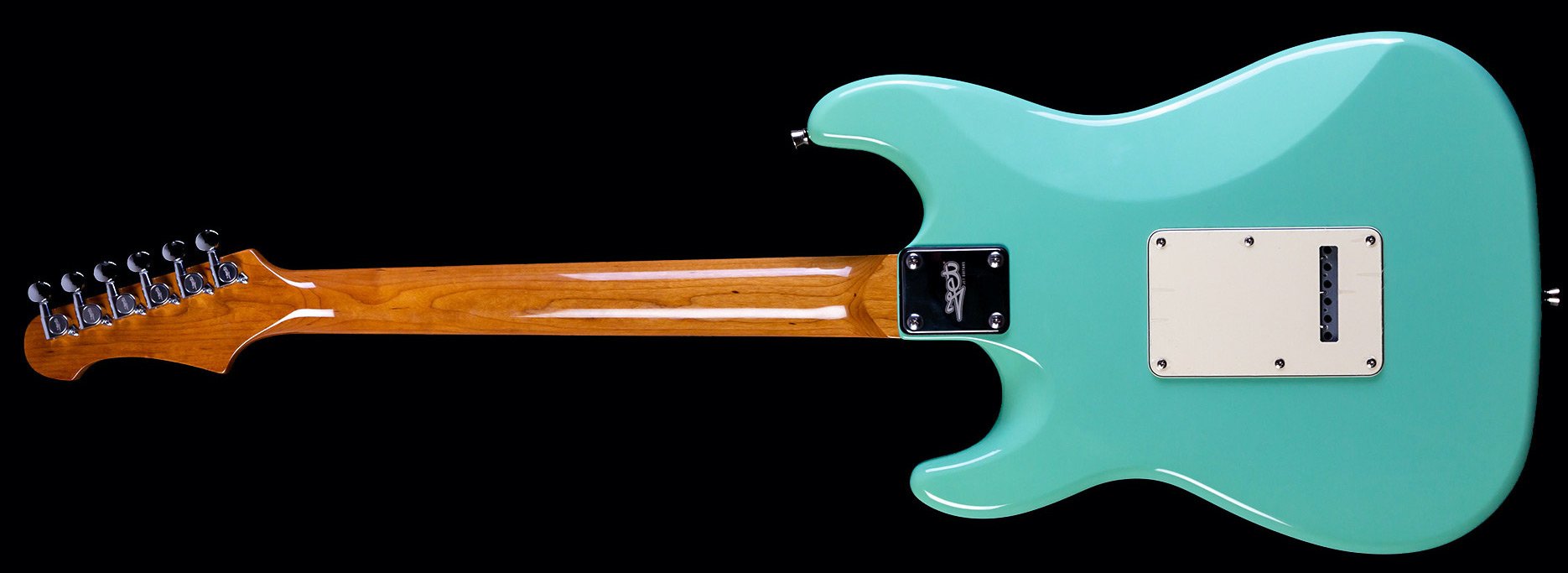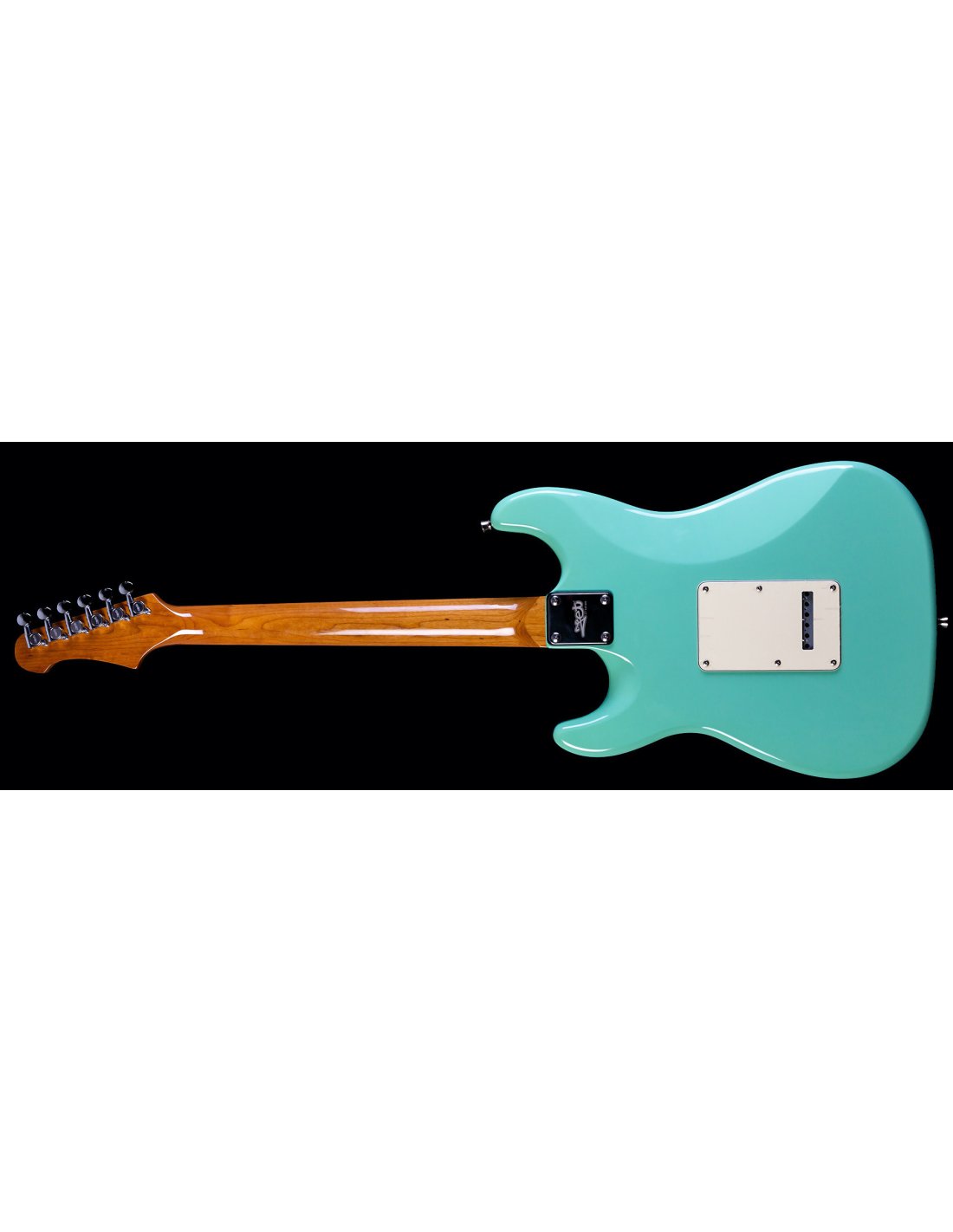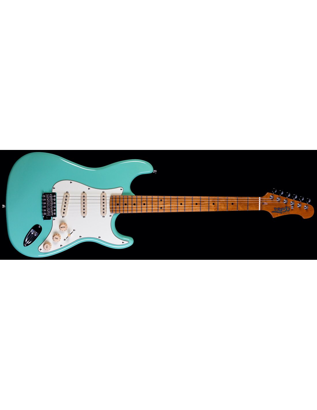 JET JS-300 SFG SSS SEAFOAM GREEN ROASTED MAPLE. Chitarra elettrica JET JS-300 SFG SSS con corpo in Tiglio, manico in acero canadese con profilo a "C", tastiera in Acero Roasted a raggio 9,5" con 22 tasti, intarsi Dot neri e finitura Seafoam Green. L'elettronica a configurazione SSS è dotata di 3 pickup Single Coil ceramici con controlli Master Volume, 2 Master Tone e switch a 5vie. Presenta inoltre ponte tremolo, Trussrod a doppia azione, meccaniche e hardware cromati.
