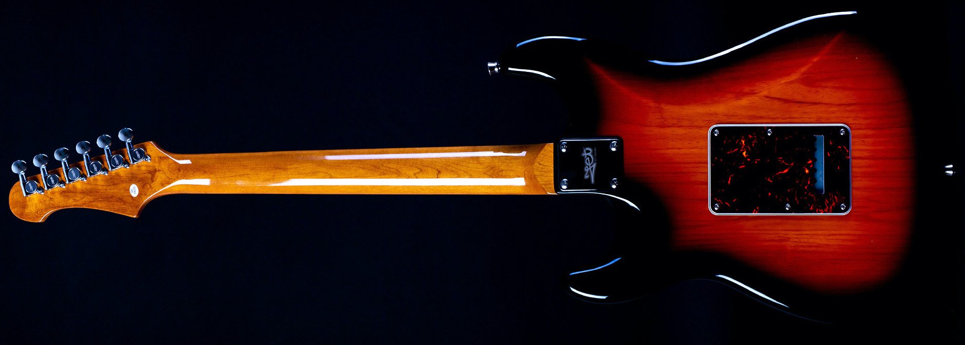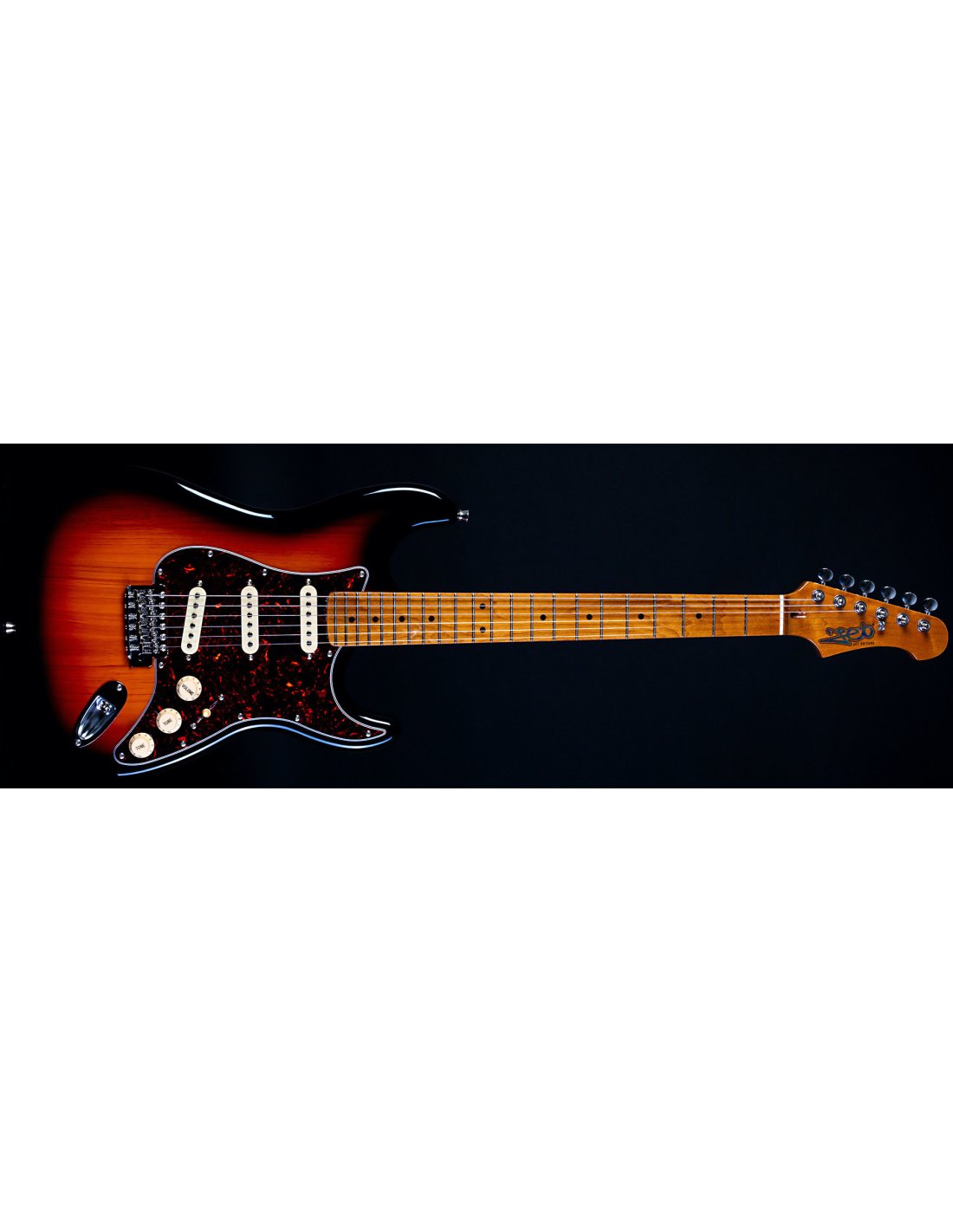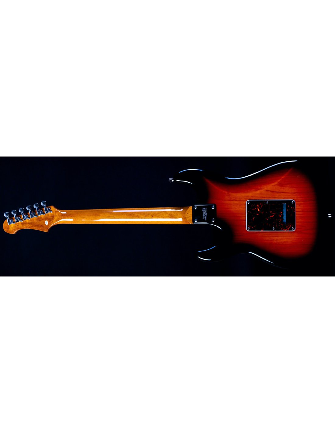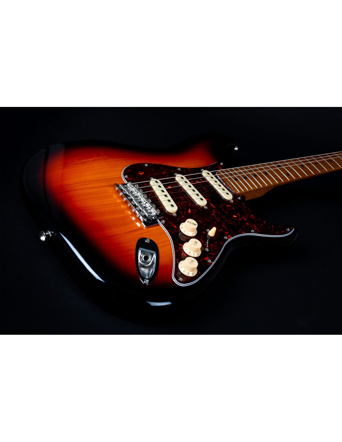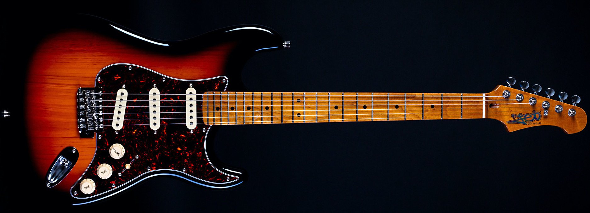 JET JS-300 SB SSS SUNBURST ROASTED MAPLE. Chitarra elettrica JET JS-300 SB SSS con corpo in Tiglio, manico in acero canadese con profilo a "C", tastiera in Acero Roasted a raggio 9,5" con 22 tasti, intarsi Dot neri e finitura Sunburst. L'elettronica a configurazione SSS è dotata di 3 pickup Single Coil ceramici con controlli Master Volume, 2 Master Tone e switch a 5vie. Presenta inoltre ponte tremolo, Trussrod a doppia azione, meccaniche e hardware cromati.