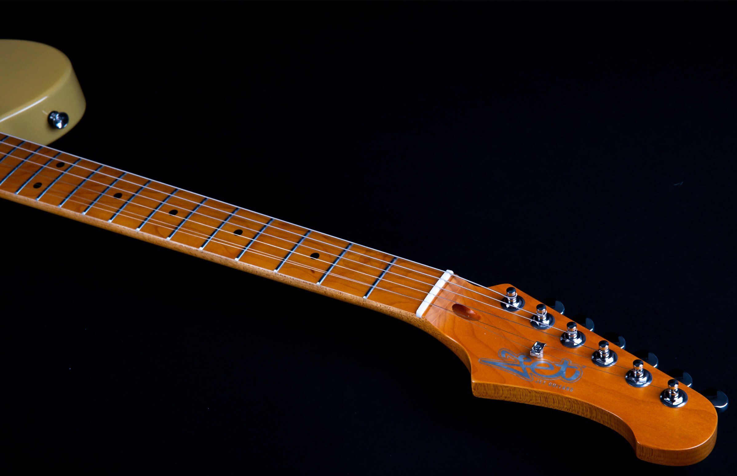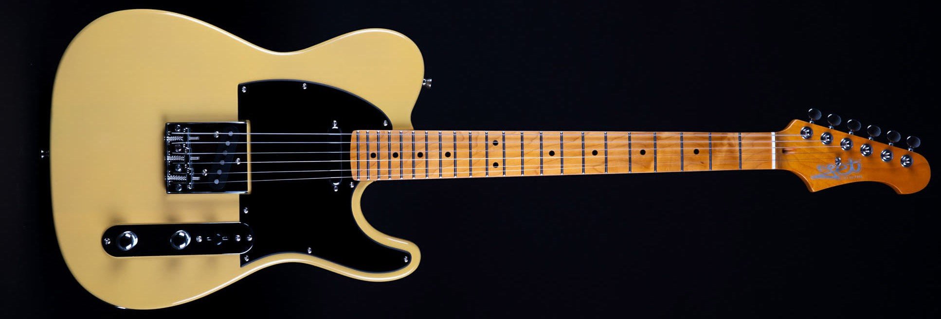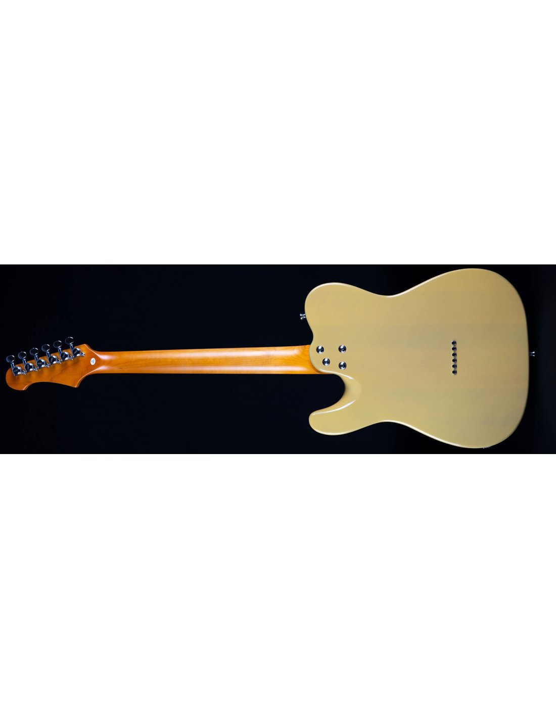 JET JT-350 BSC SS BUTTERSCOTCH. Chitarra elettrica JET JT-350 BSC SS con corpo in Tiglio, manico in acero canadese con profilo a "C", tastiera in acero a raggio 9,5" con 22 tasti, intarsi Dot neri e finitura Butterscotch. L'elettronica a configurazione SS è dotata di 2 Pickup Single Coil con magnete Alnico e controlli Master Volume, Master Tone e switch a 3vie. Presenta inoltre ponte Fixed, Trussrod a doppia azione, meccaniche Locking e hardware cromati.