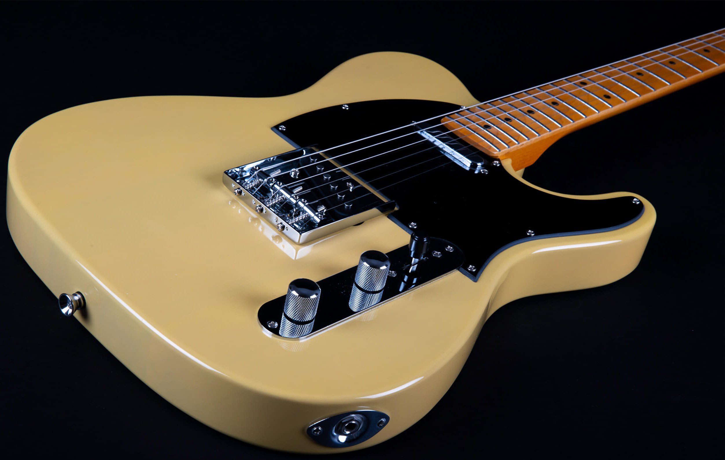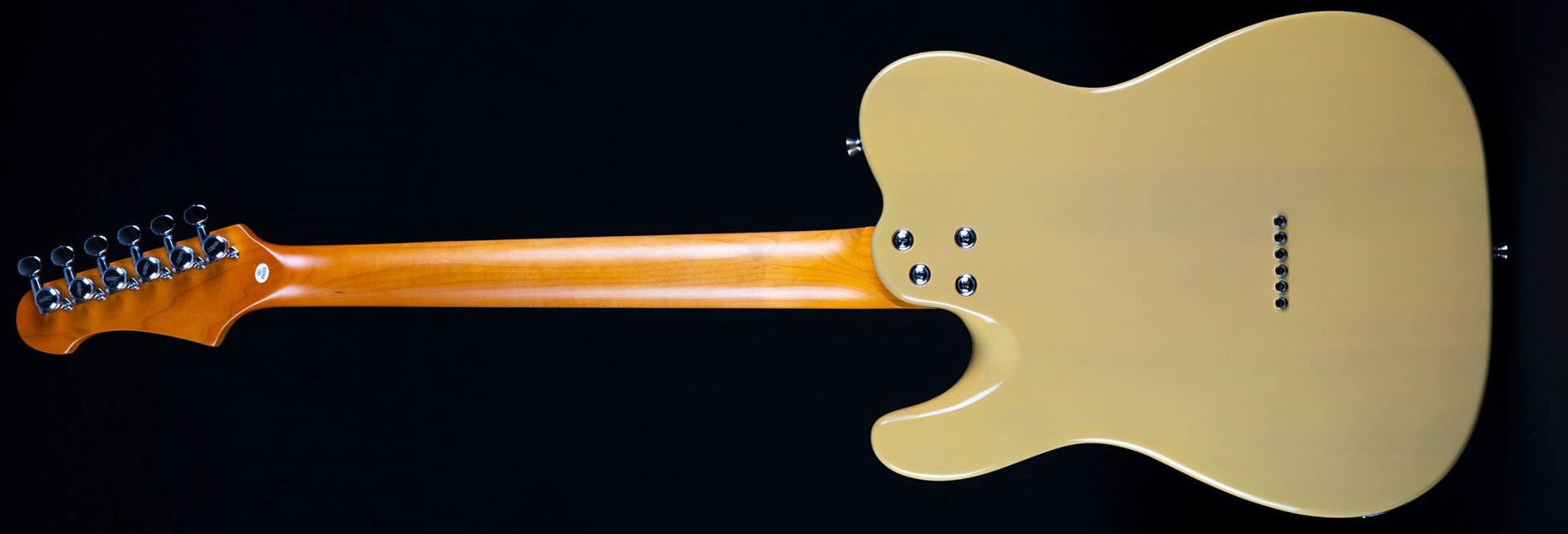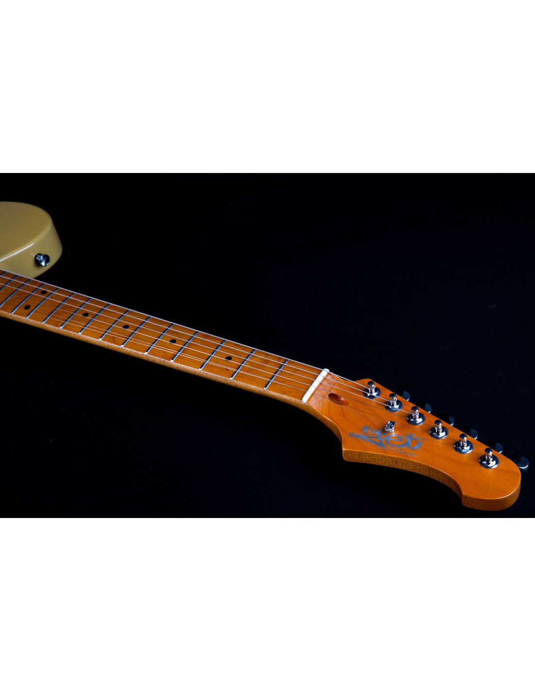 JET JT-350 BSC SS BUTTERSCOTCH. Chitarra elettrica JET JT-350 BSC SS con corpo in Tiglio, manico in acero canadese con profilo a "C", tastiera in acero a raggio 9,5" con 22 tasti, intarsi Dot neri e finitura Butterscotch. L'elettronica a configurazione SS è dotata di 2 Pickup Single Coil con magnete Alnico e controlli Master Volume, Master Tone e switch a 3vie. Presenta inoltre ponte Fixed, Trussrod a doppia azione, meccaniche Locking e hardware cromati.