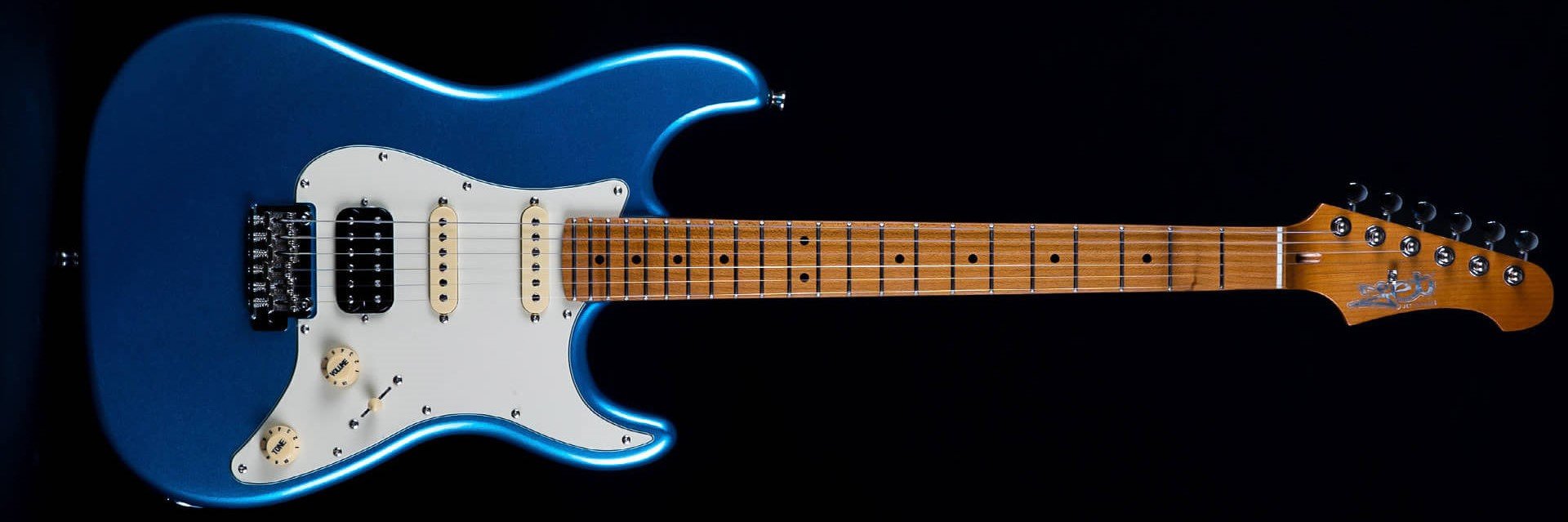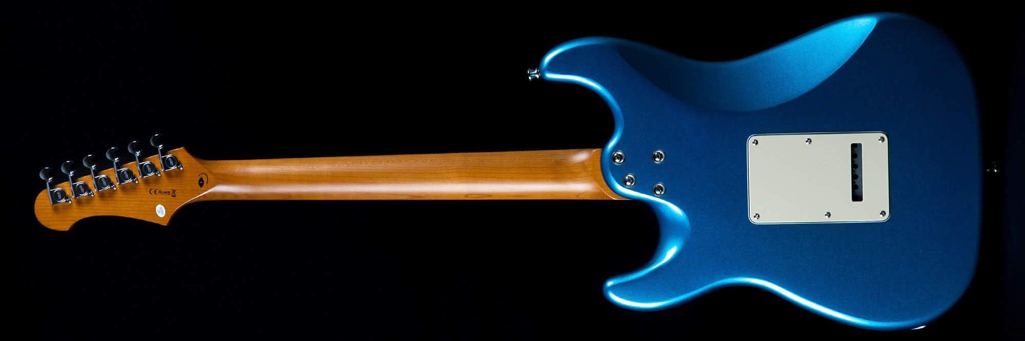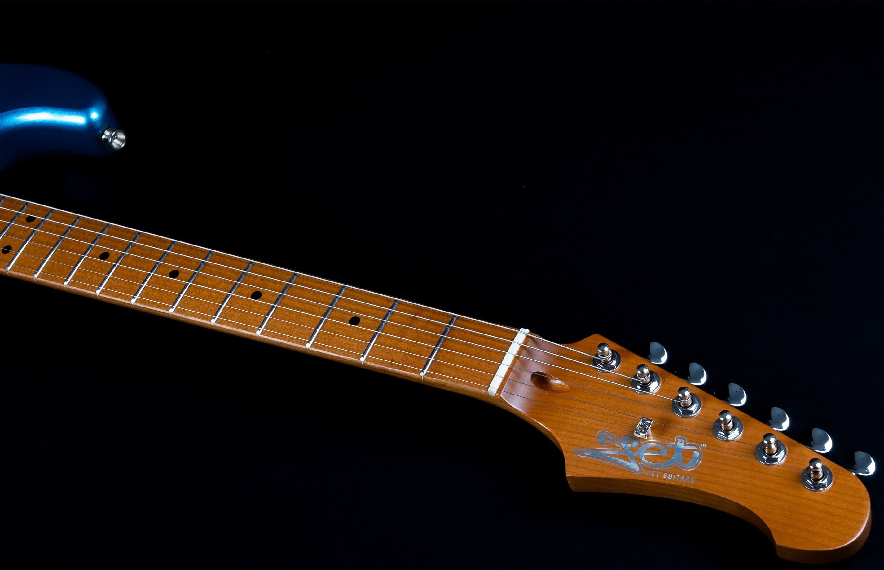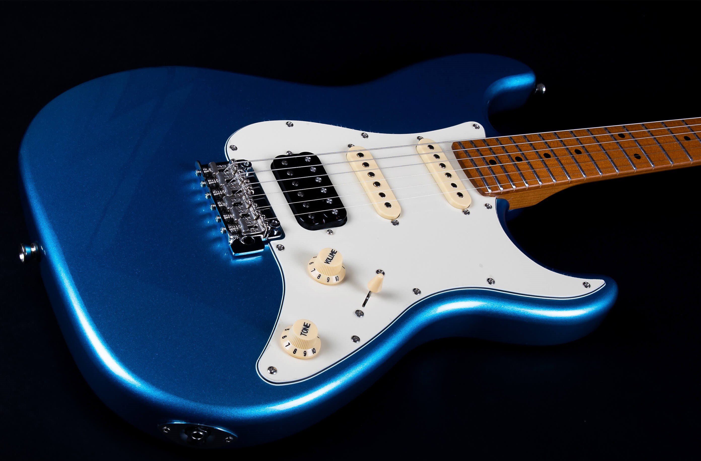 JET JS-400 LPB HSS LAKE PLACID BLUE. Chitarra elettrica JET JS-400 LPB HSS con corpo in Tiglio, manico in acero canadese con profilo a "C", tastiera in Acero Roasted a raggio 9,5" con 22 tasti, intarsi Dot neri e finitura Lake Placid Blue. L'elettronica a configurazione HSS è dotata di 1 pickup Humbucker ceramico al ponte e 2 Single Coil ceramici al centro e al manico con controlli Master Volume, Master Tone e switch a 5vie. Presenta inoltre ponte tremolo, Trussrod a doppia azione, meccaniche e hardware cromati.