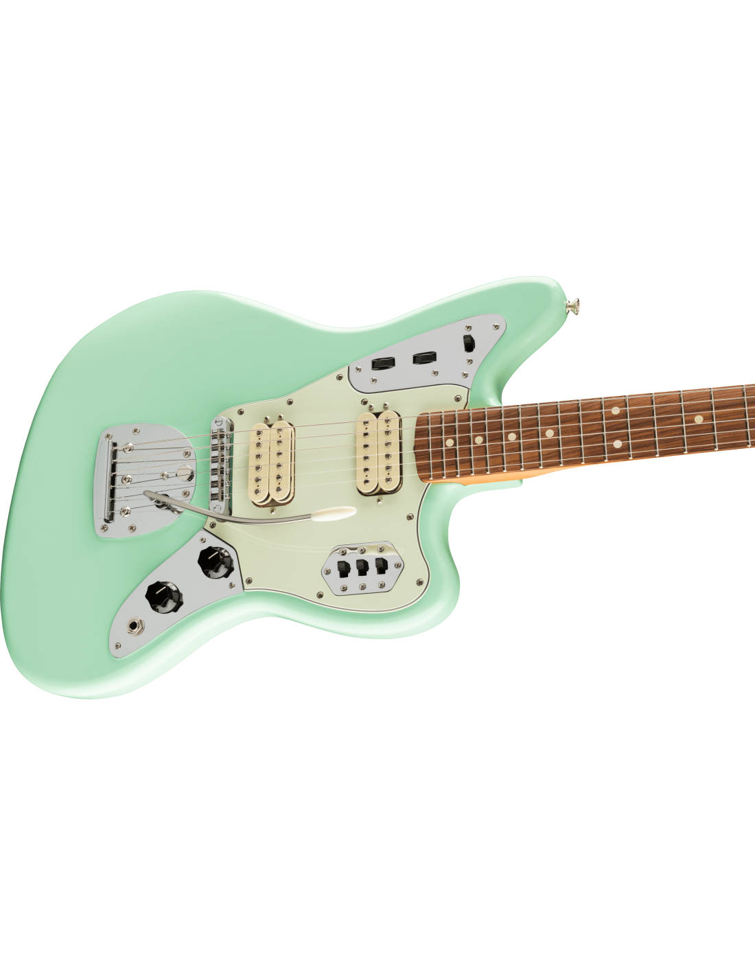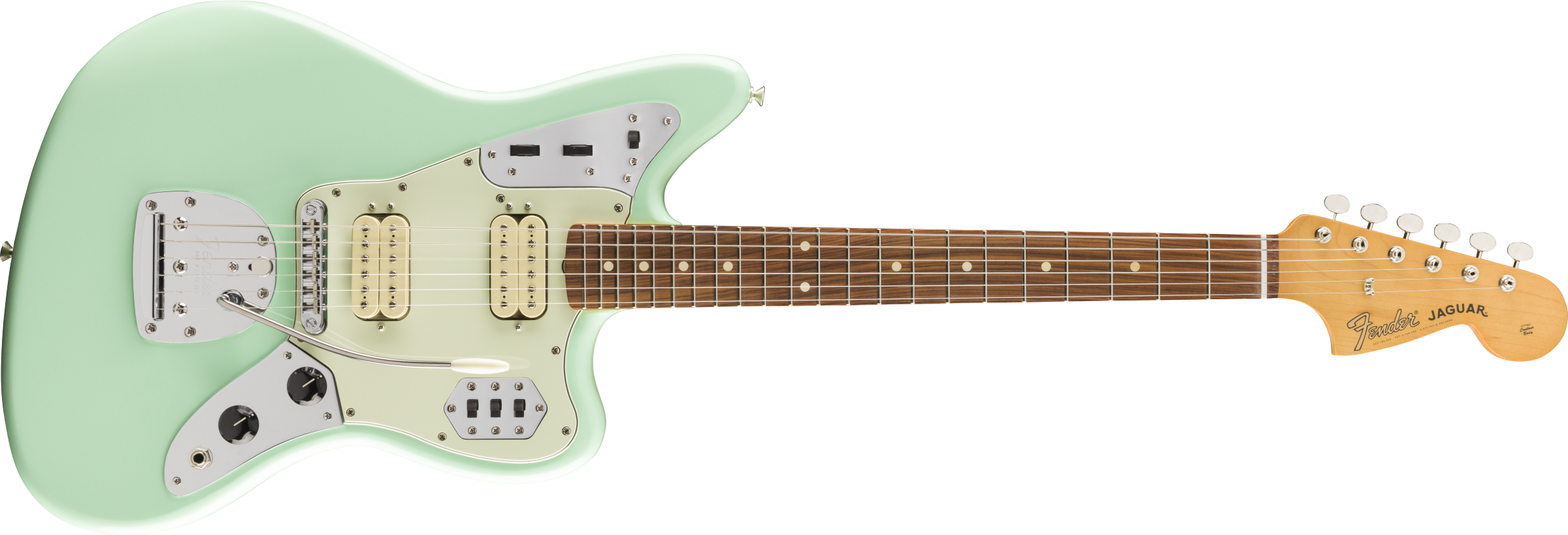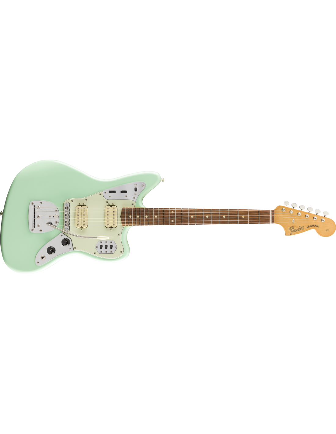 Chitarra Elettrica Fender Vintera 60s Jaguar Modified HH, colore Surf Green. La Fender Vintera 60s Jaguar Modified HH è una chitarra elettrica a 6 corde. Le caratteristiche comprendono: manico in Acero con profilo Modern C. Tastiera in Pau Ferro, raggio 9,5”, scala 25 1/2”, 22 tasti Medium Jumbo. Corpo in Ontano con battipanni tristrato Mint Green. La parte elettronica ha due pickup Fender Atomic Humbucking con controlli di Volume e Tono. Due rotelle a sfioramento controllano la funzione split coil per ciascuno dei pickup. 3 switch a scorrimento controllano le funzione Kill, Low Cut e la selezione dei pickup. Hardware Nickel/Cromo, con ponte Adjusto-Matic e vibrato Floating. Meccaniche Vintage-Style. Gig-Bag Deluxe in dotazione.