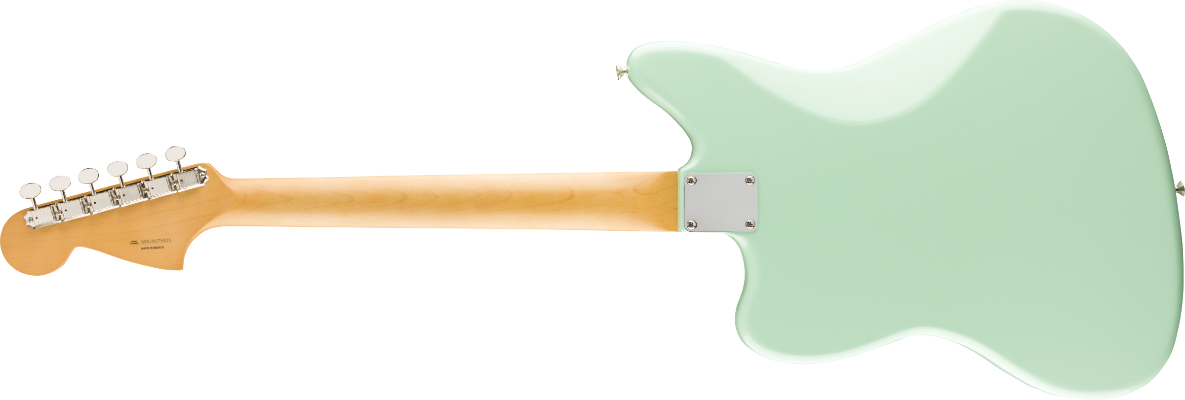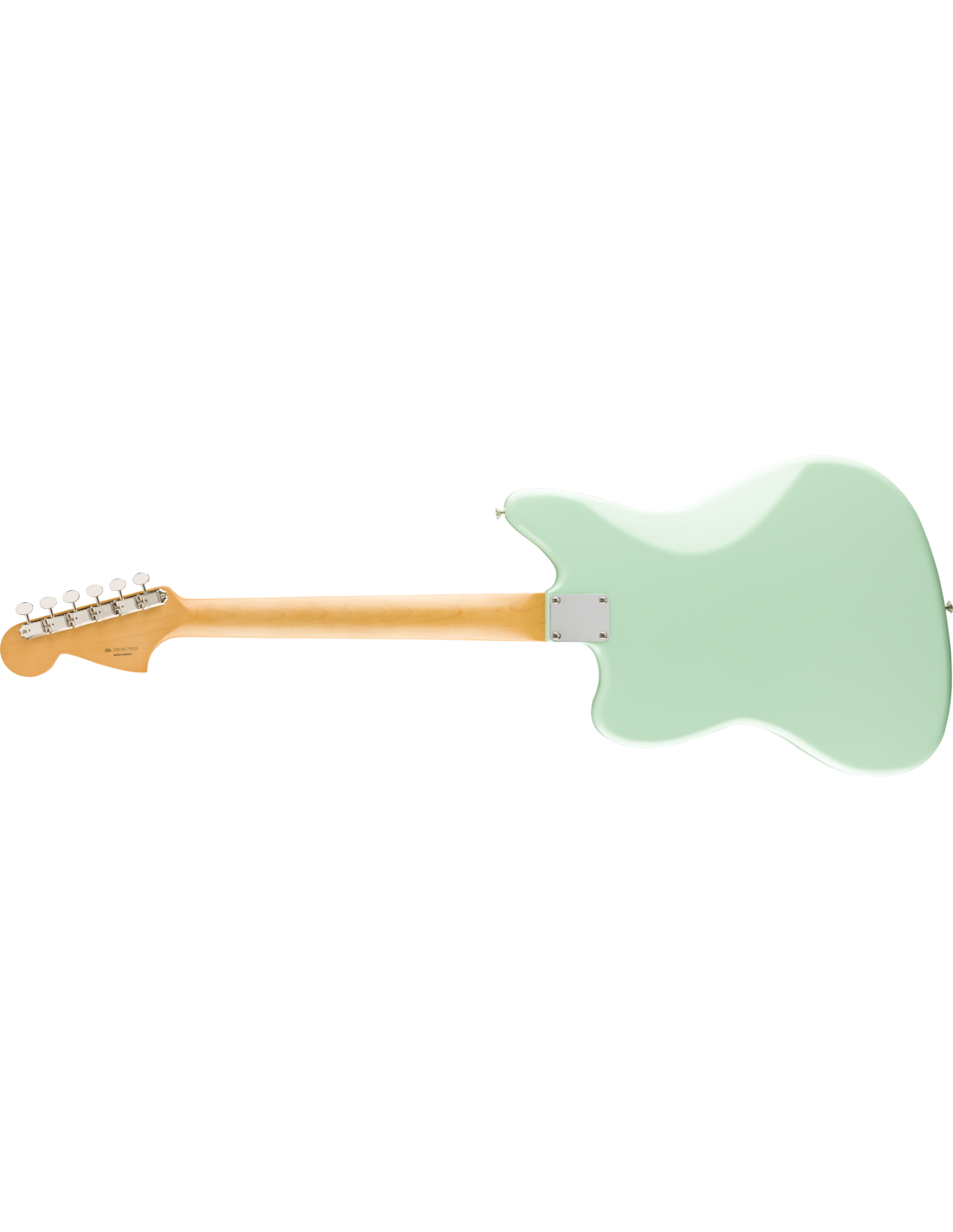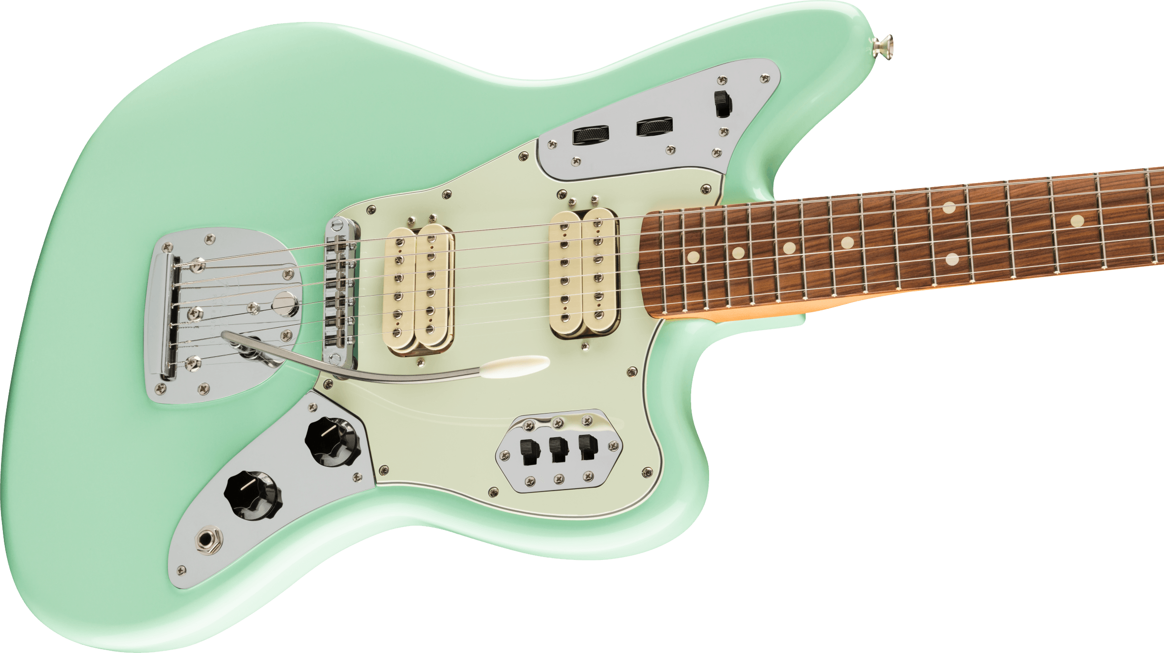 Chitarra Elettrica Fender Vintera 60s Jaguar Modified HH, colore Surf Green. La Fender Vintera 60s Jaguar Modified HH è una chitarra elettrica a 6 corde. Le caratteristiche comprendono: manico in Acero con profilo Modern C. Tastiera in Pau Ferro, raggio 9,5”, scala 25 1/2”, 22 tasti Medium Jumbo. Corpo in Ontano con battipanni tristrato Mint Green. La parte elettronica ha due pickup Fender Atomic Humbucking con controlli di Volume e Tono. Due rotelle a sfioramento controllano la funzione split coil per ciascuno dei pickup. 3 switch a scorrimento controllano le funzione Kill, Low Cut e la selezione dei pickup. Hardware Nickel/Cromo, con ponte Adjusto-Matic e vibrato Floating. Meccaniche Vintage-Style. Gig-Bag Deluxe in dotazione.